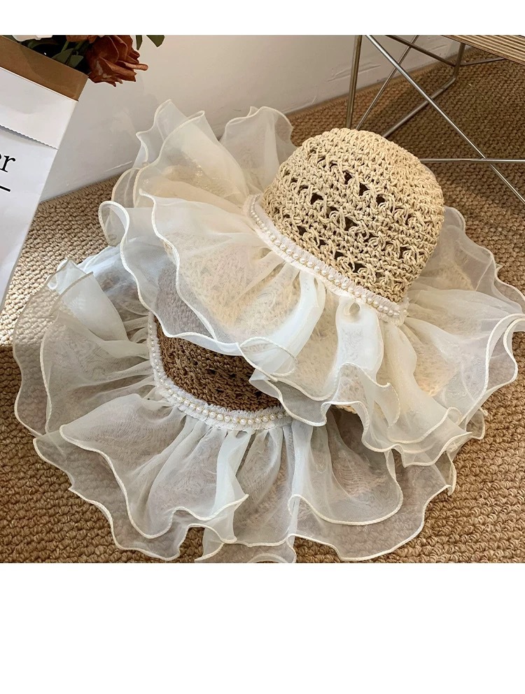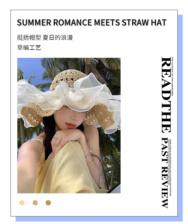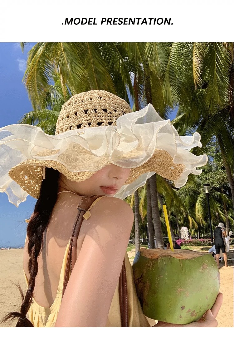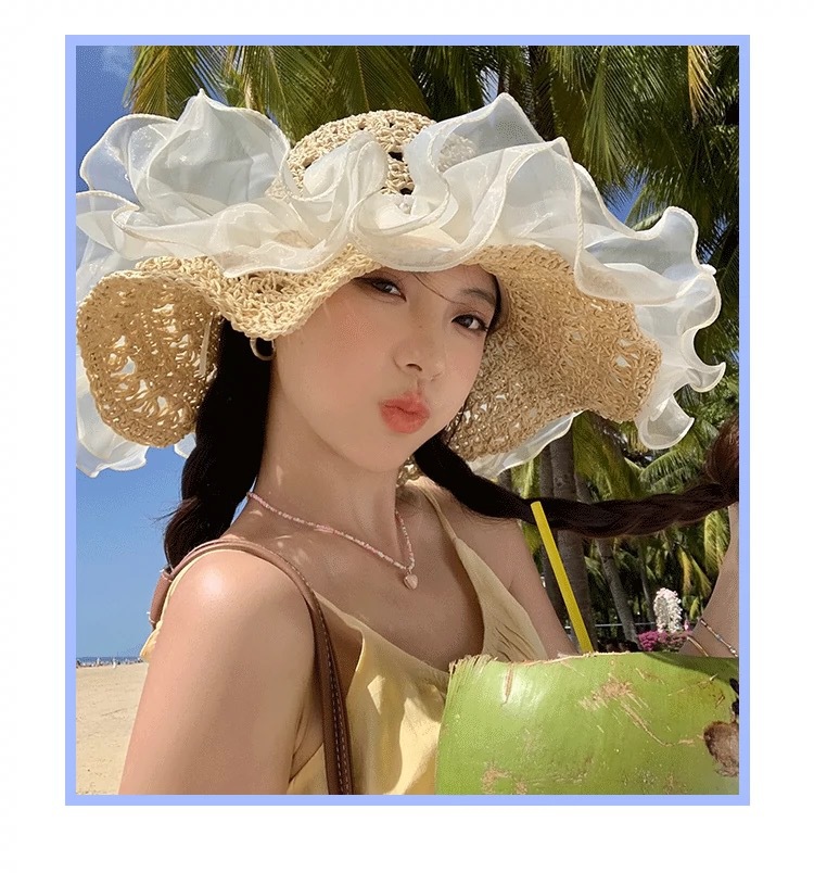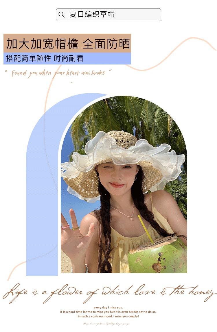 蕾丝草编太阳帽子女大帽檐夏季透气草帽海边遮全脸遮阳沙滩帽子潮
