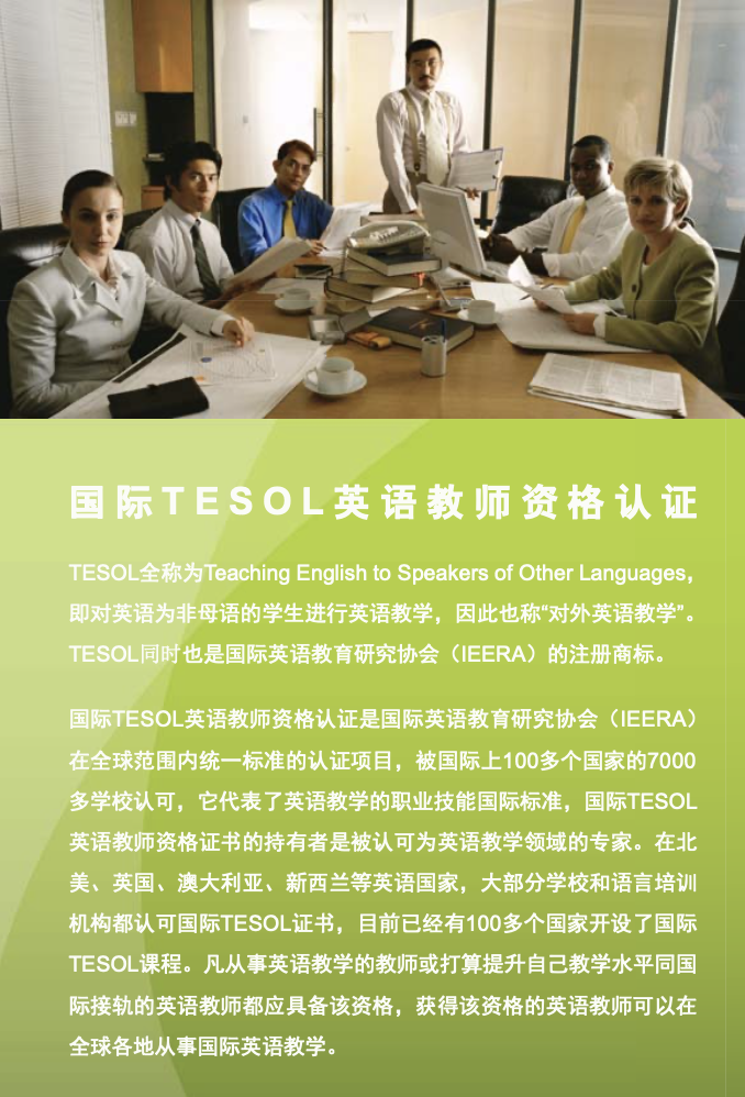 TESOL(Teaching English to Speakers of Other Languages)是针对面向非母语学生进行英语教学的教师和教育机构的国际认证体系,被国际上绝大多数国家和学校认可。