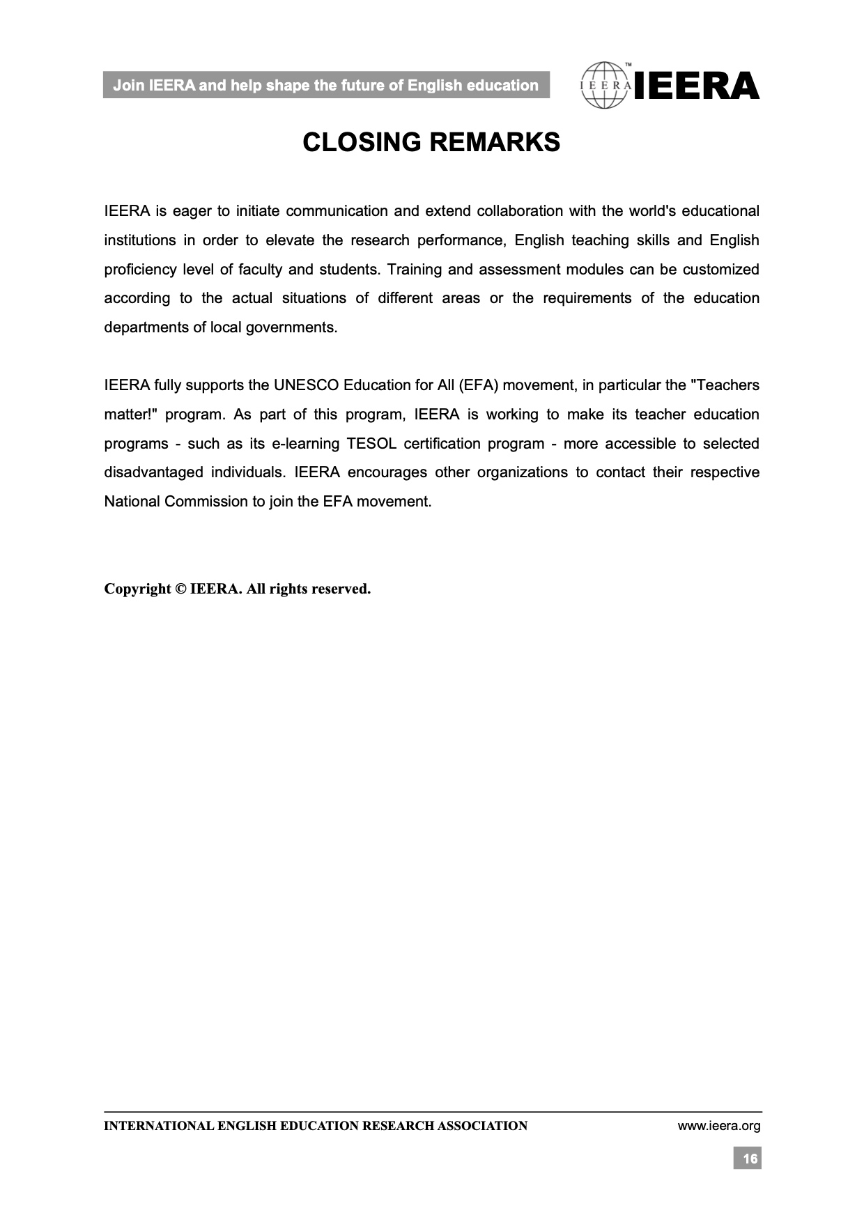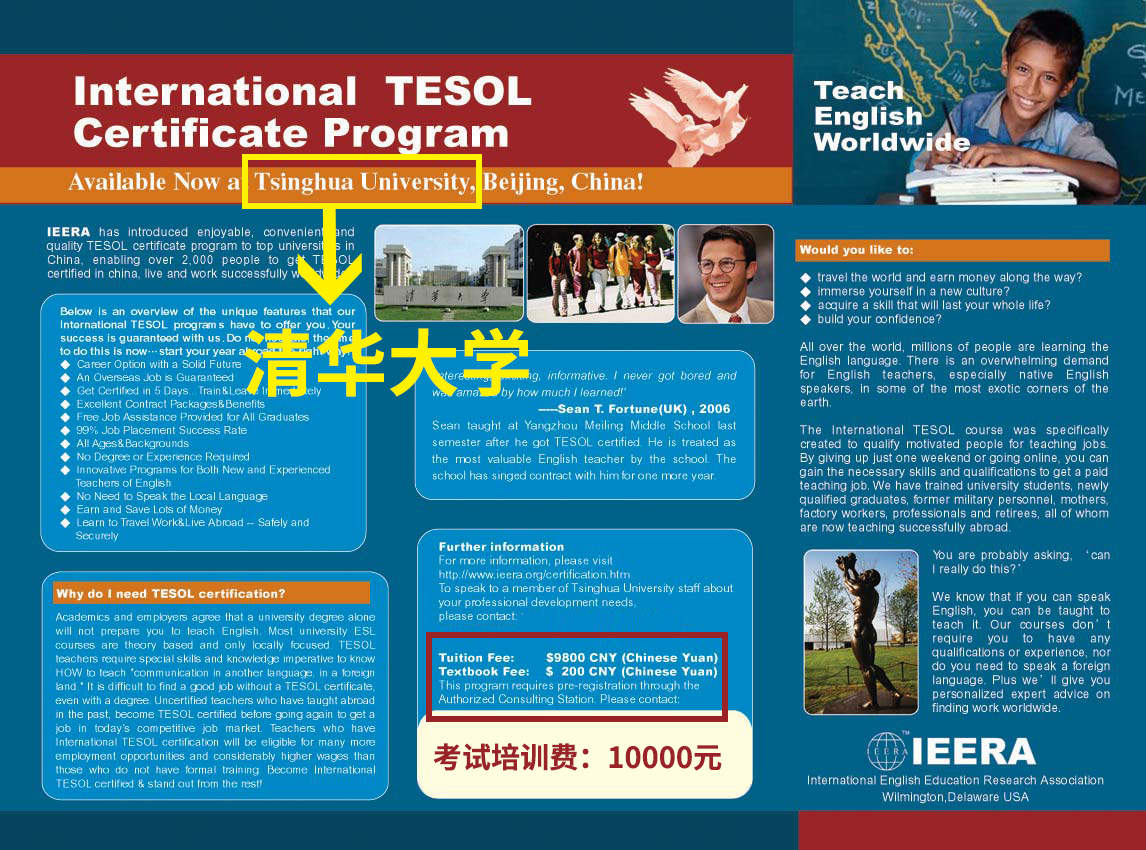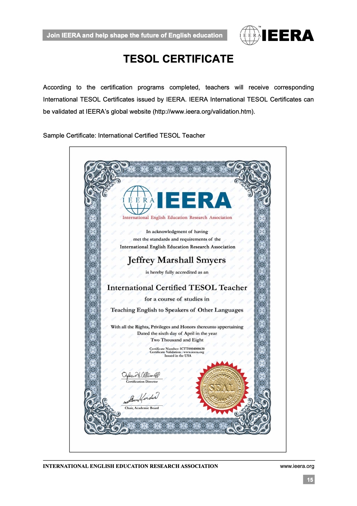 通过TESOL® 和 TEFL® 认证的英语教师和教育培训机构遍及世界各地。国家开放大学、清华大学、浙江大学、南京师范大学等国内知名高校均先后签约战略引进IEERA国际英语认证项目。