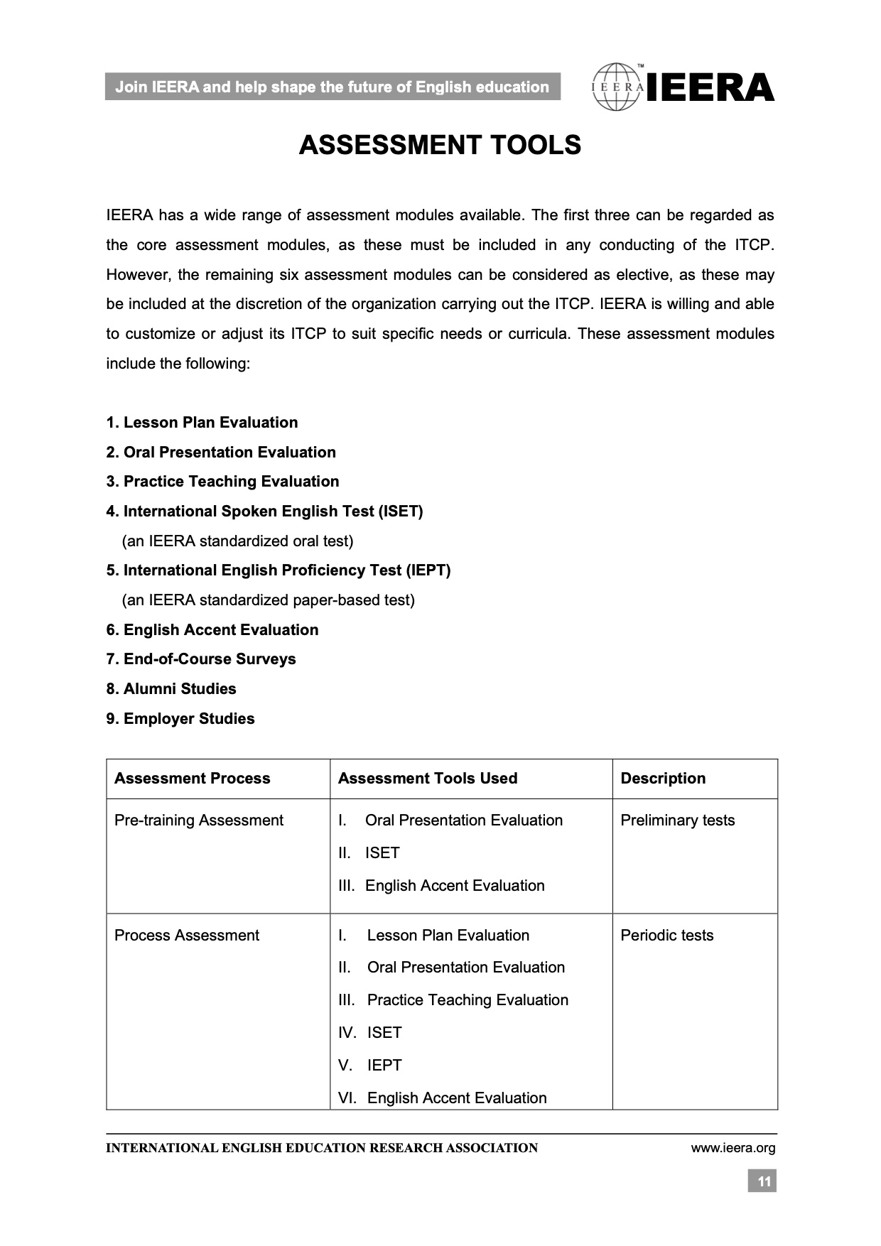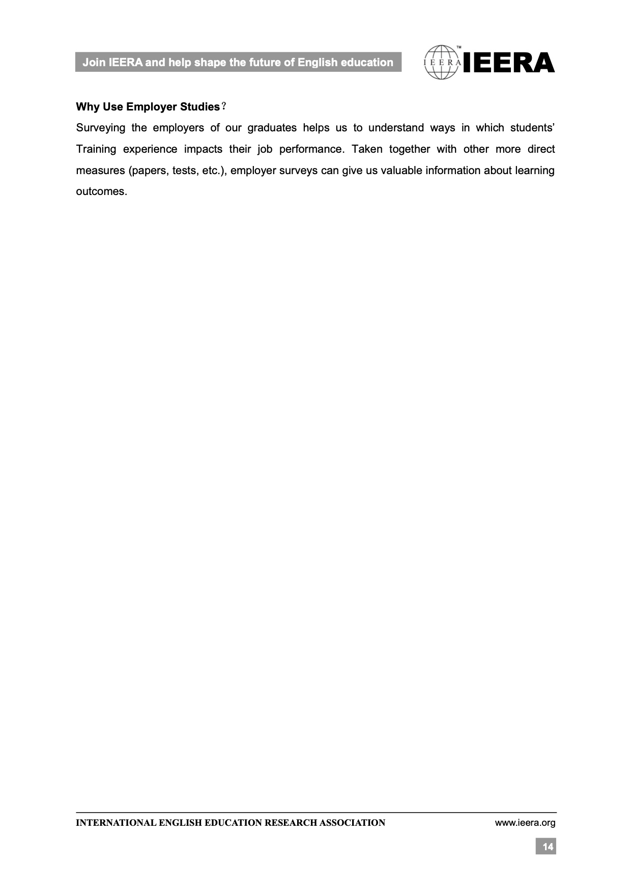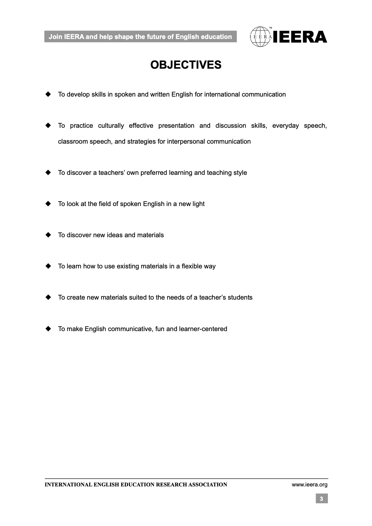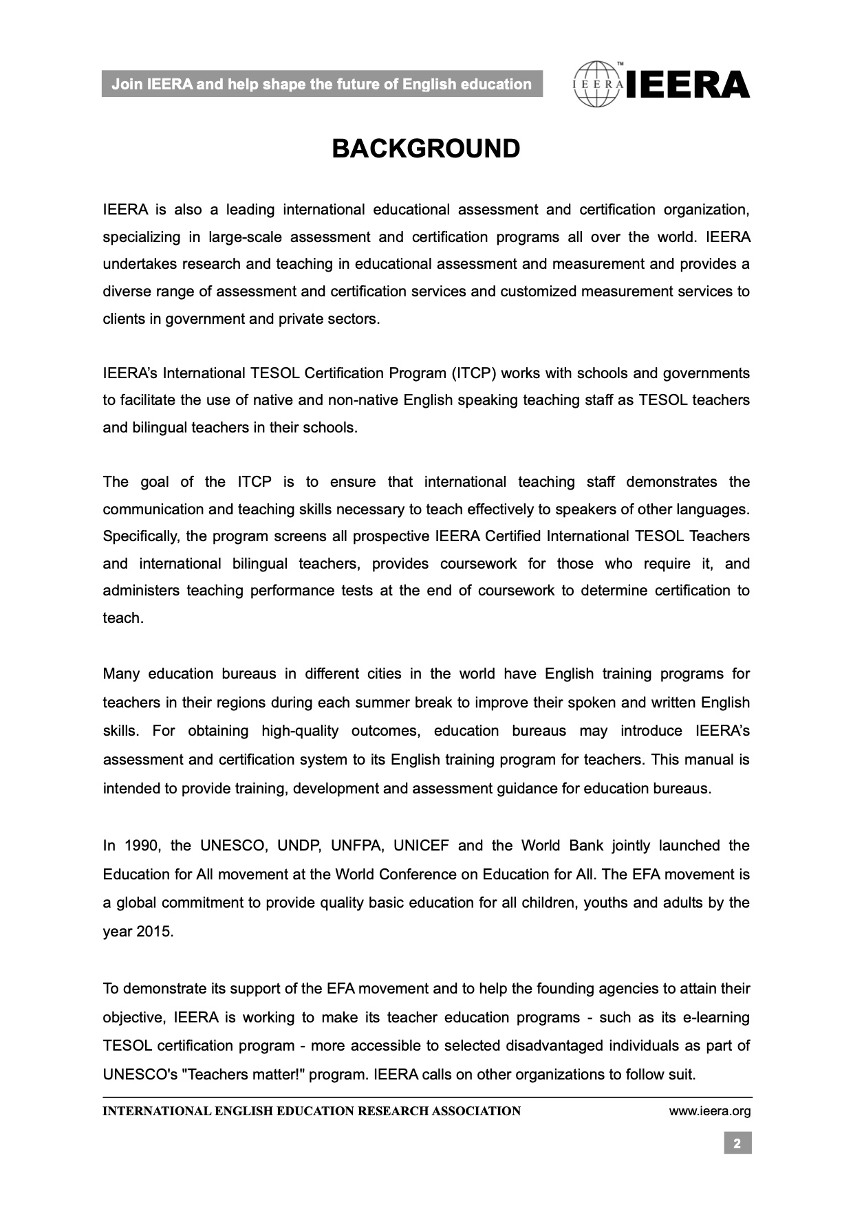 作为 TESOL® 和 TEFL® 国际英语教育质量标准的缔造者和所有者,国际英语教育研究协会(IEERA)是联合国和世界银行领导下的全球交通与贸易合作组织(GFP)成员,超过2千万注册会员覆盖全球150多个国家,多年来,IEERA国际英语认证系统已在全球150多个国家被广泛使用并已经成为全球范围内评估英语能力的权威标准。IEERA国际证书也因此获得“全球求职通行证”的美誉。