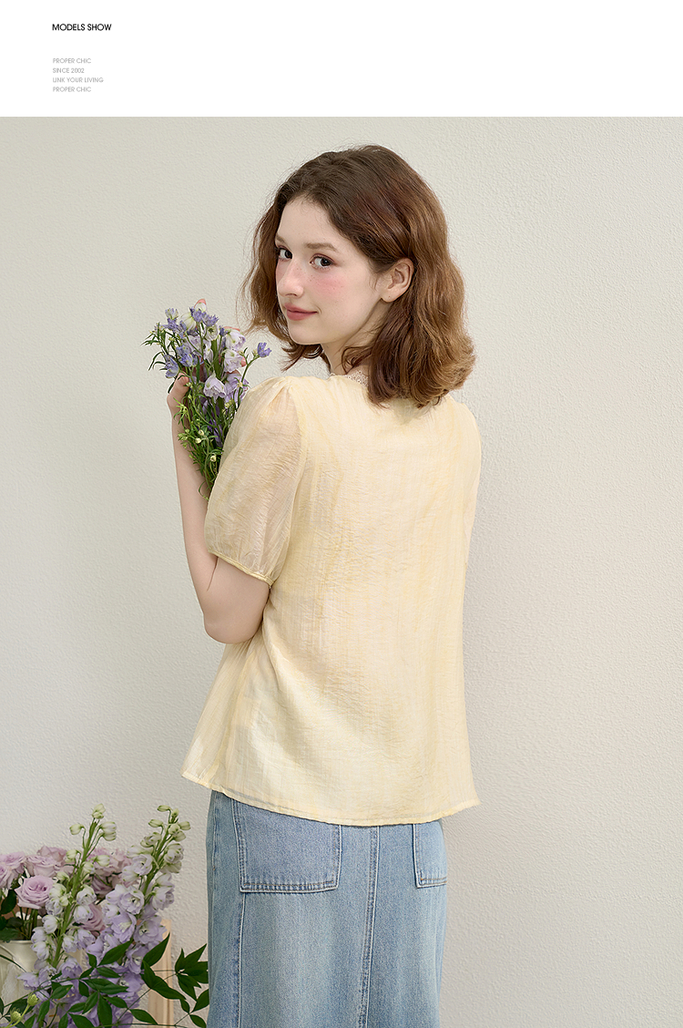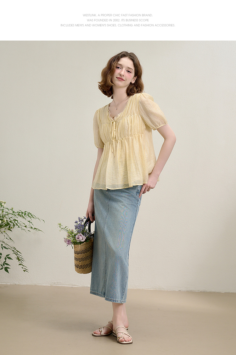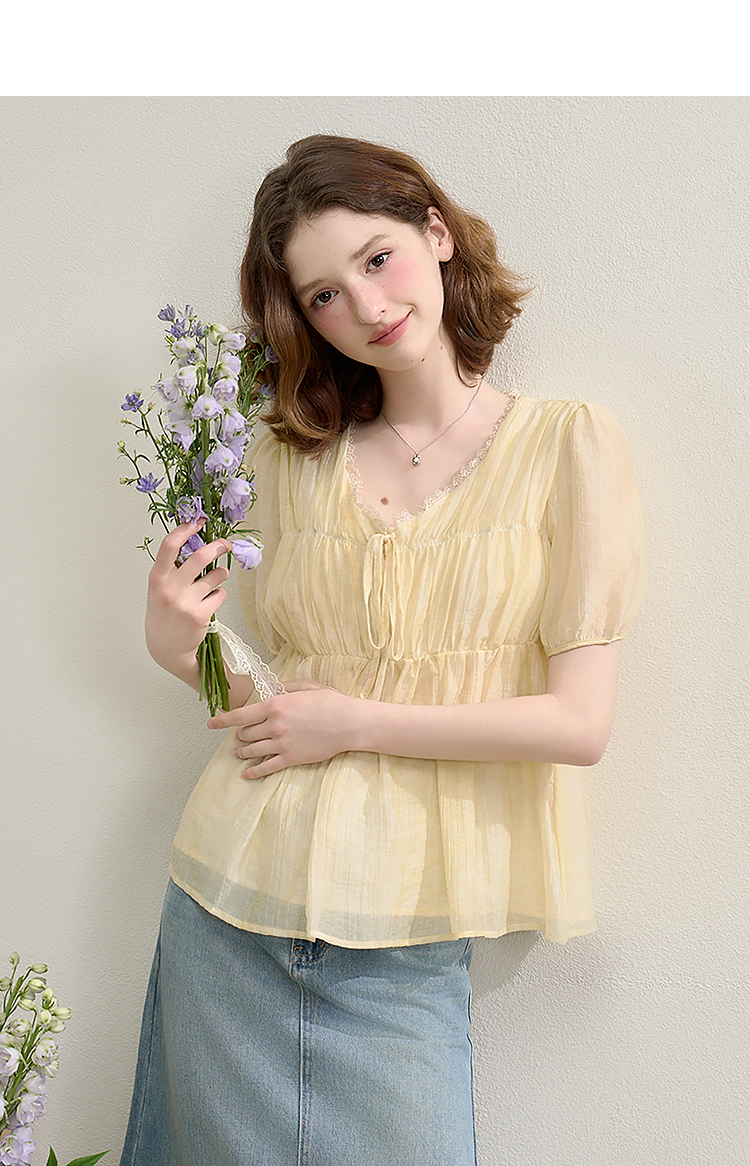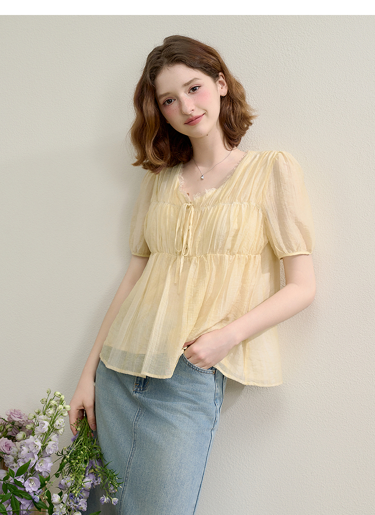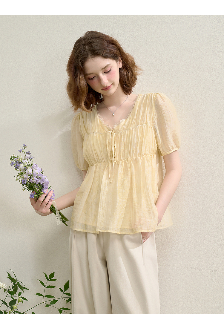 【限时秒杀】【天丝】温柔缩褶波纹肌理感衬衫女娃娃款V领衬衣V0051042