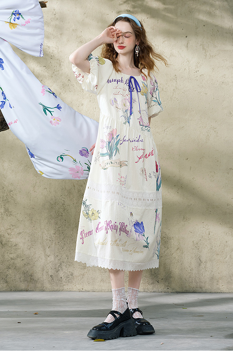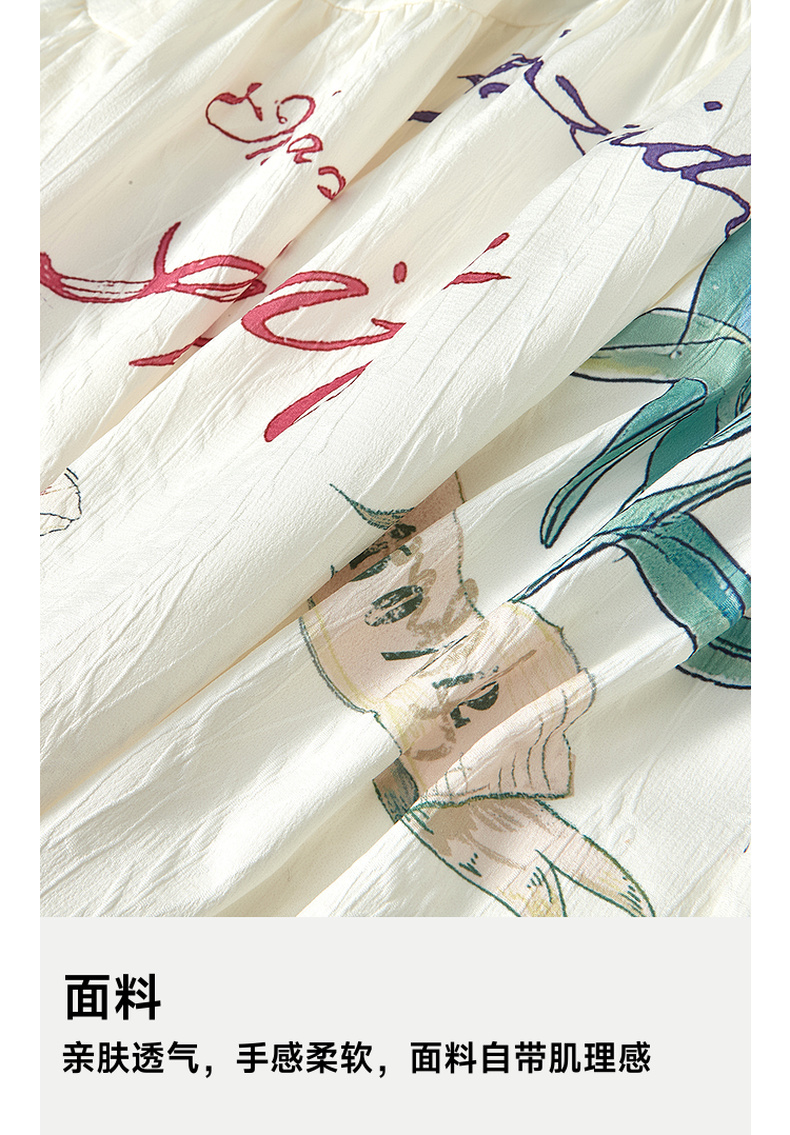 两三事 雾纱香羽 2025夏季新款小清新花苞袖蕾丝拼接印花连衣裙