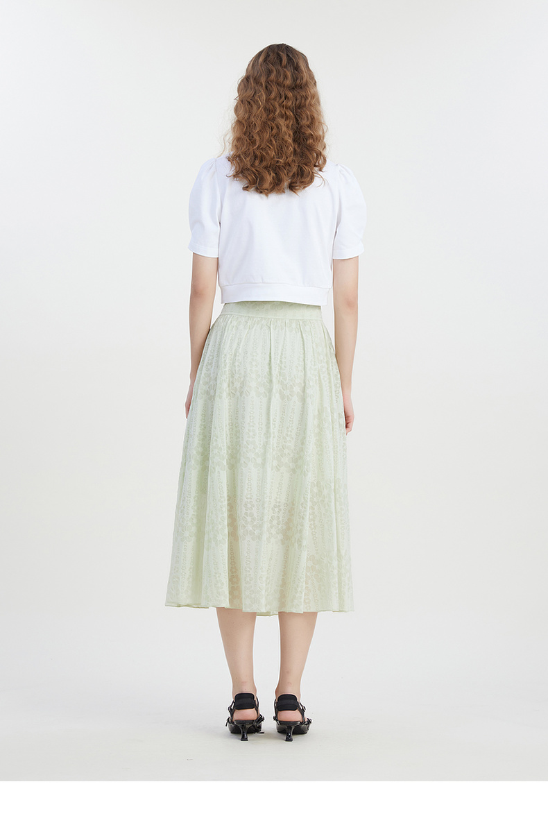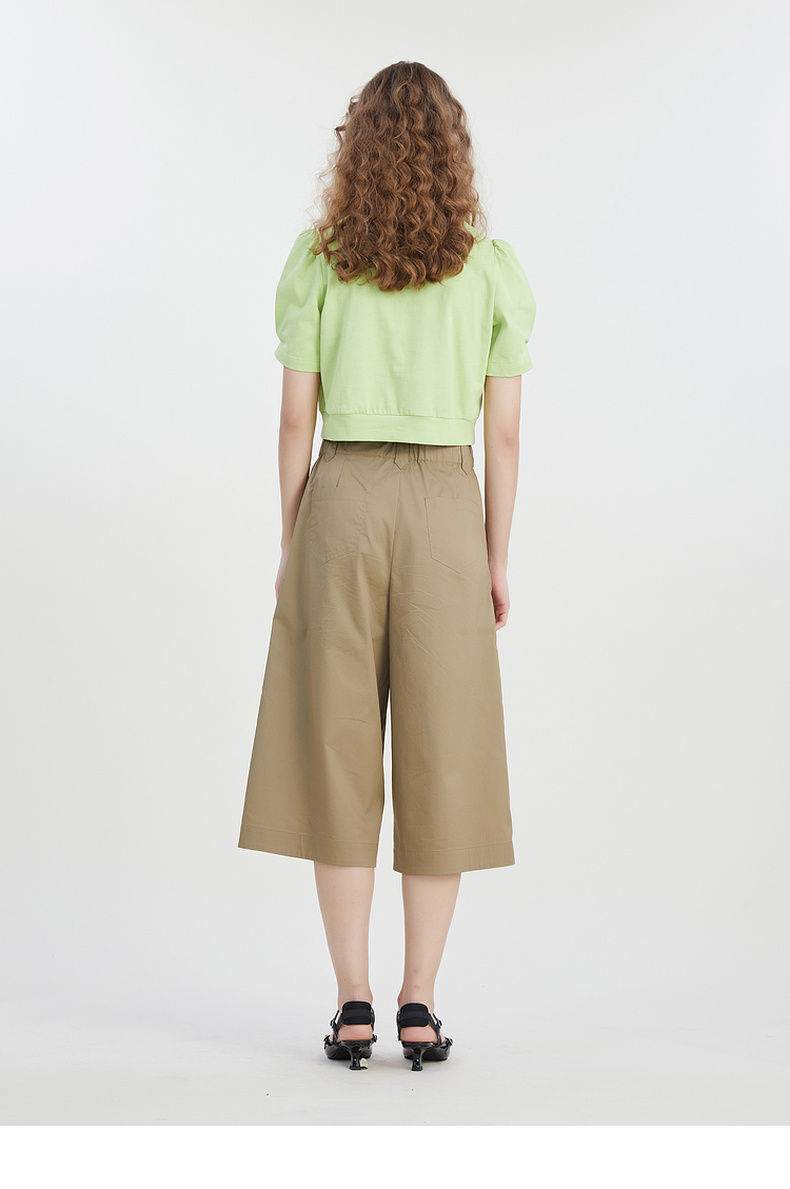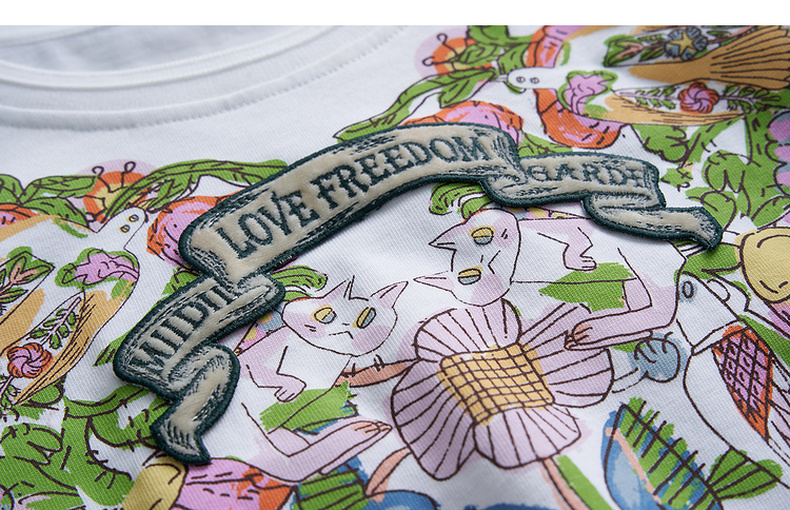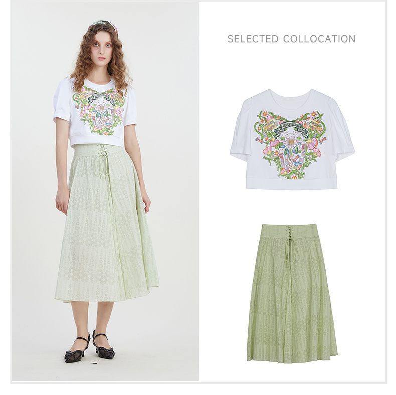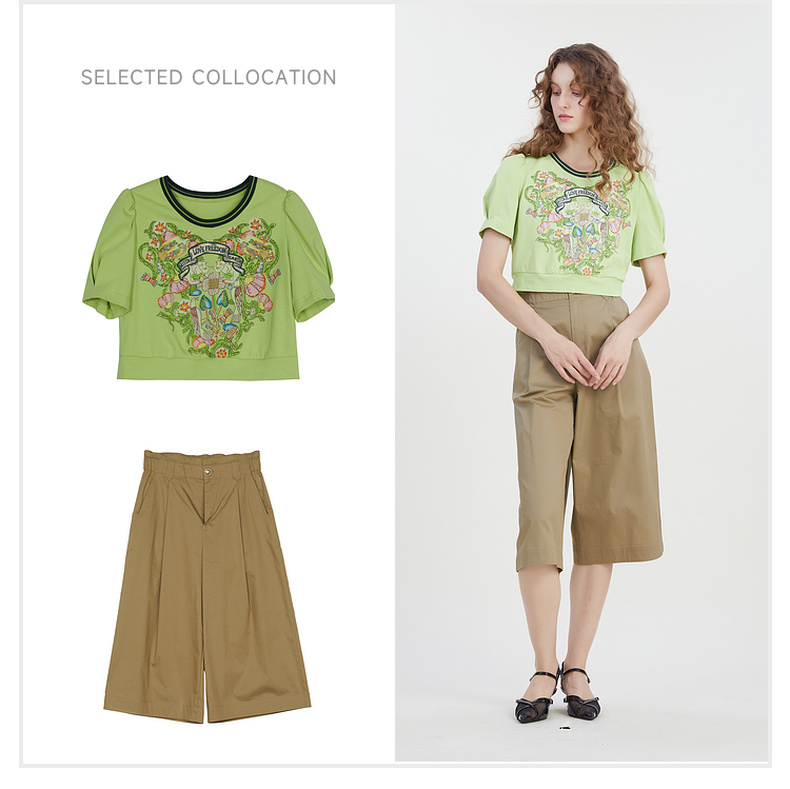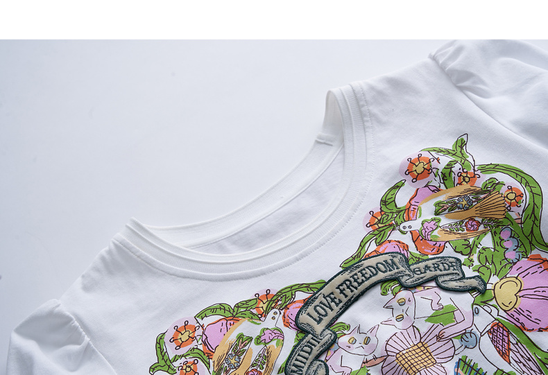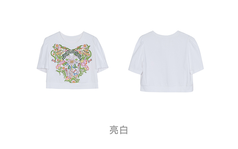 谜底圆领短款T恤女2023夏款复古特色印花泡泡袖短袖上衣232MT0616
