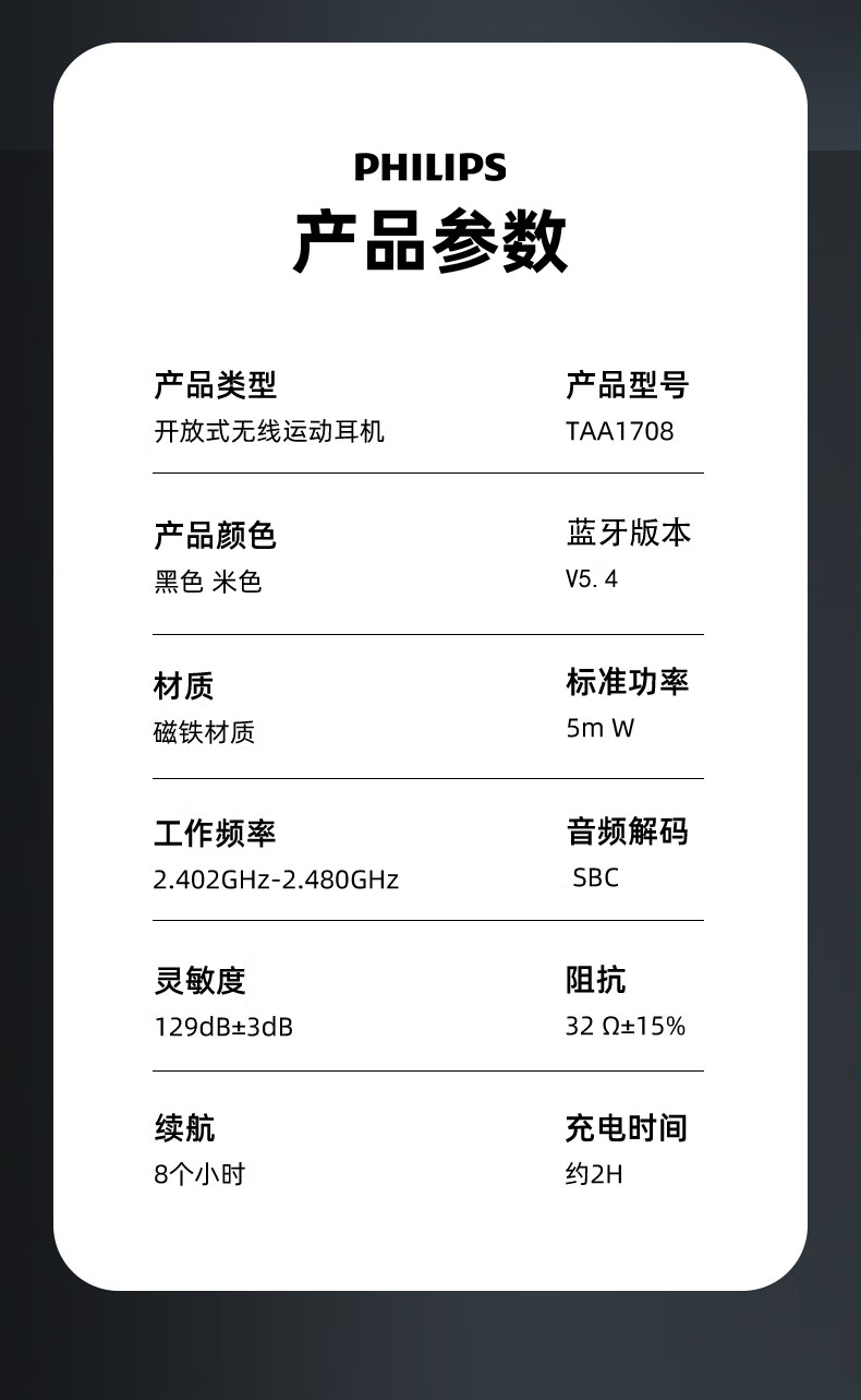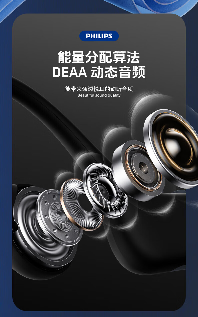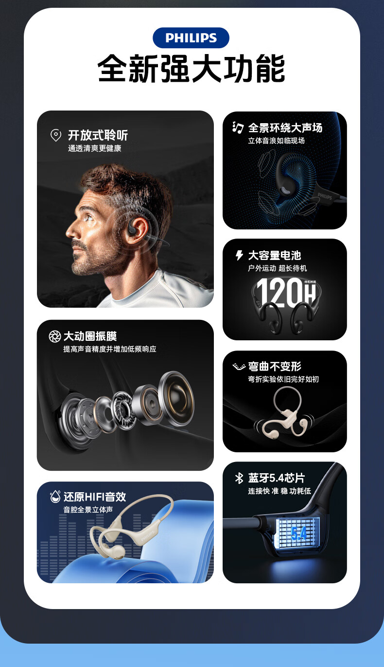 【自营】飞利浦(PHILIPS)骨传导概念挂耳式真无线开放式不入耳夹式运动跑步蓝牙耳机TAA1708