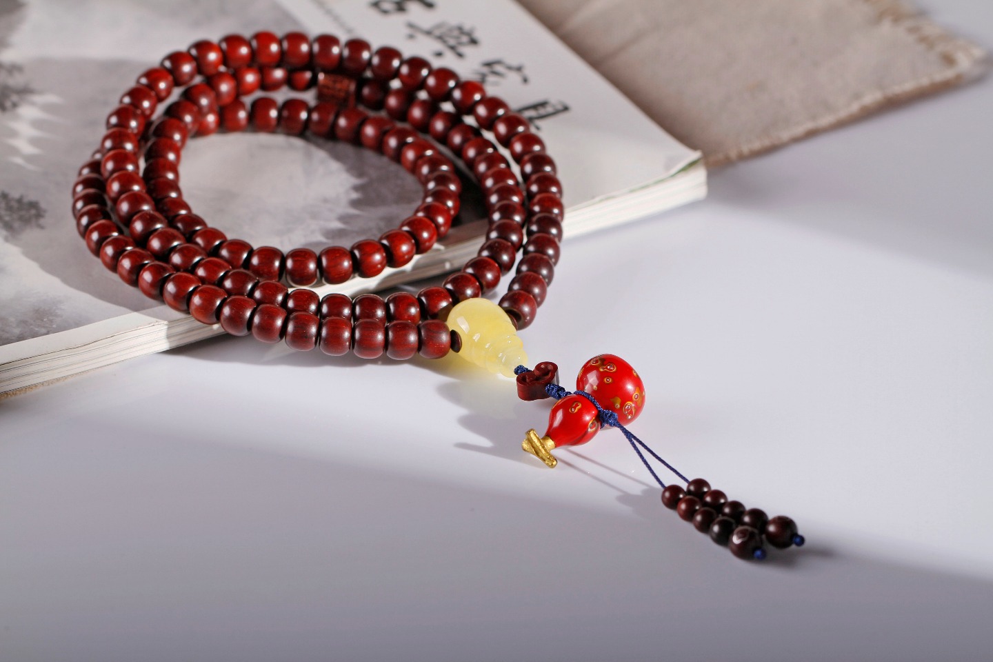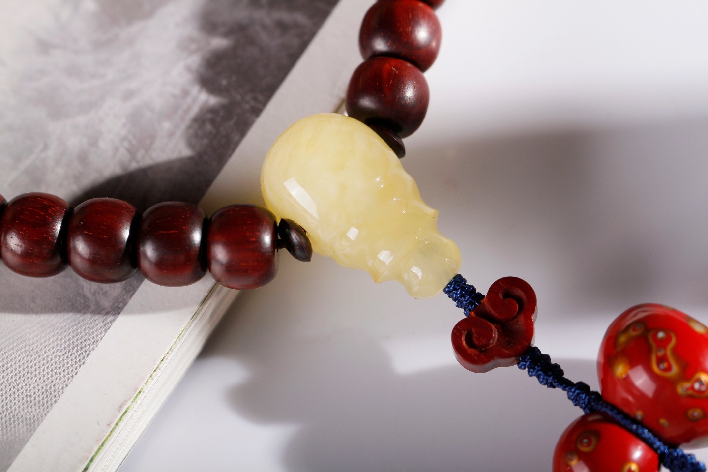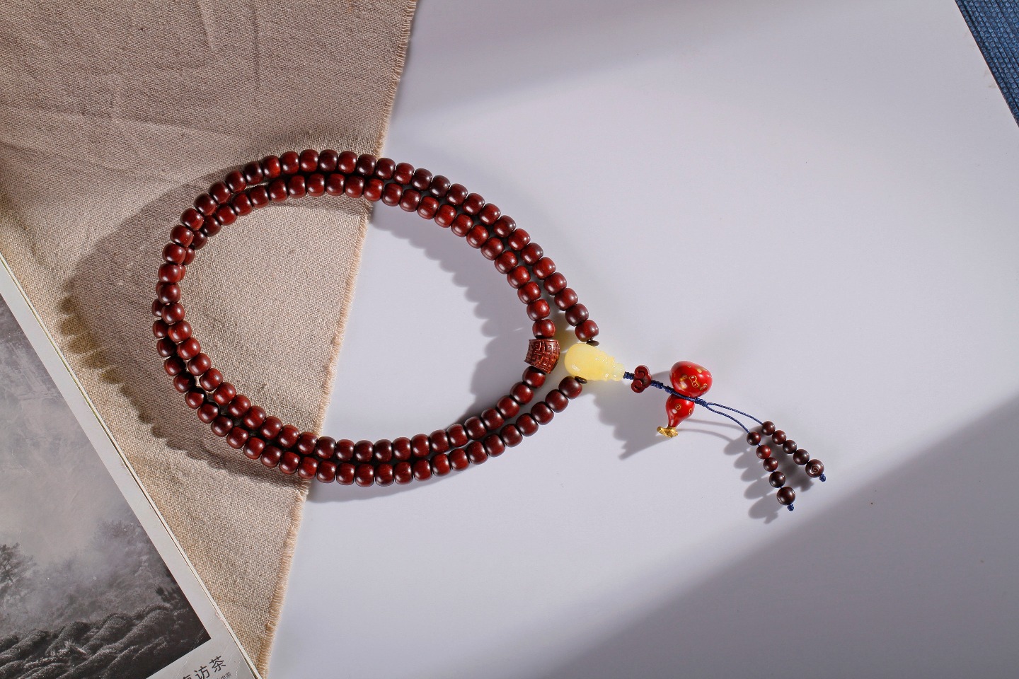 搭配:印度小叶紫檀为主,搭配大漆葫芦,精工印度小叶紫檀弯珠,蜜蜡三通、小叶紫檀镶银祥云。
