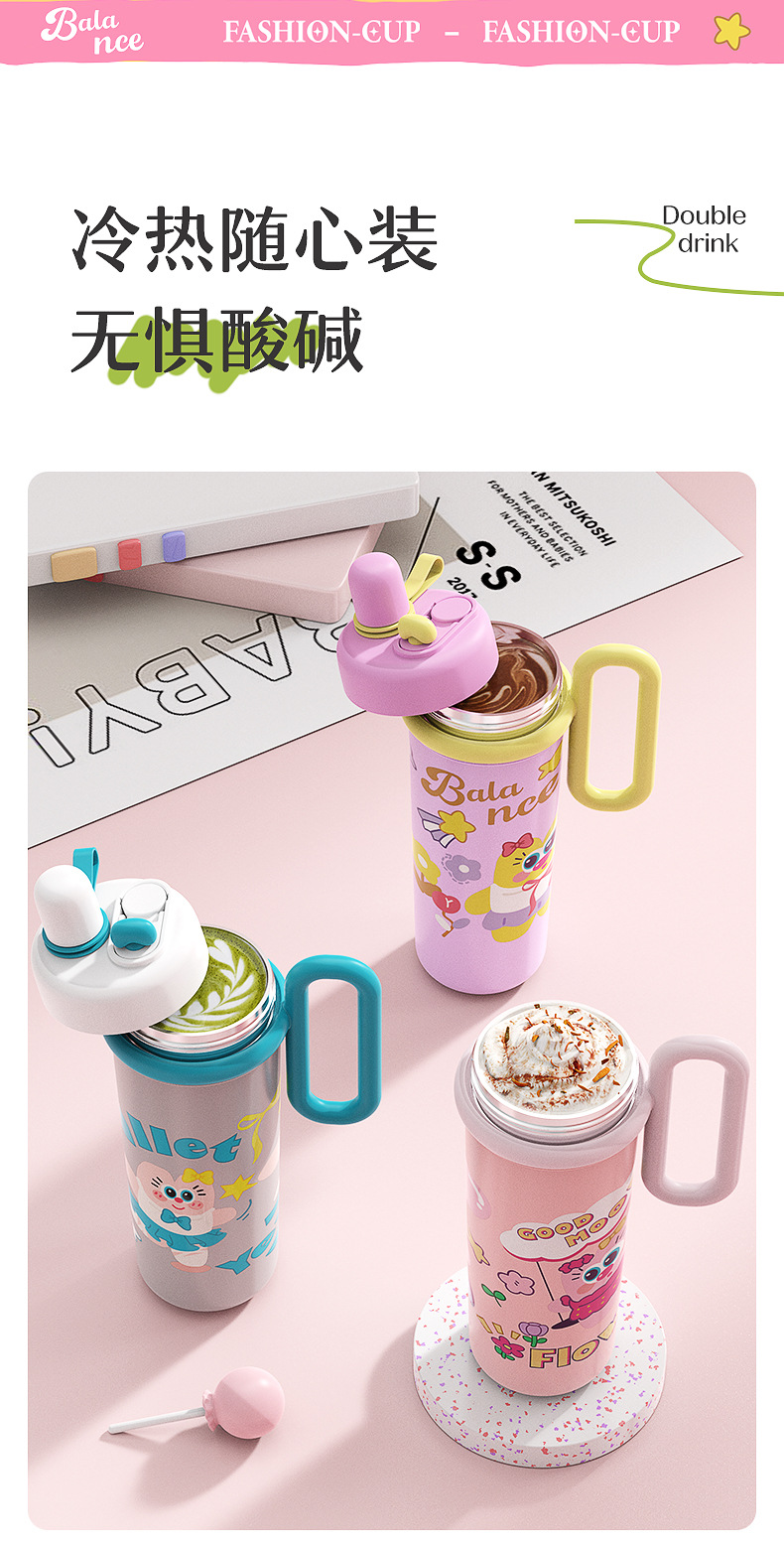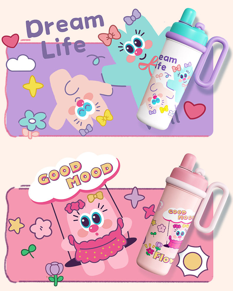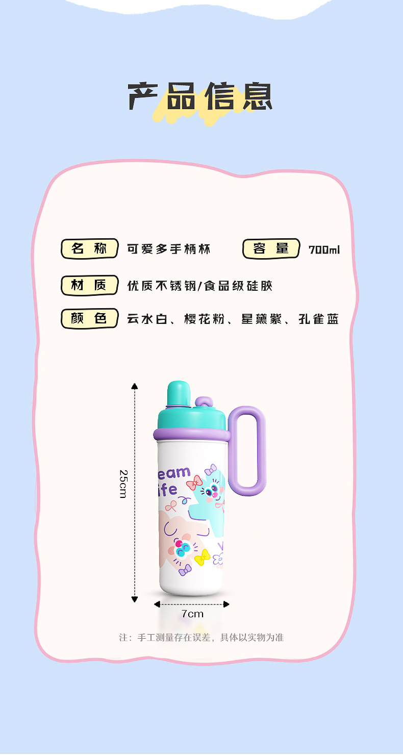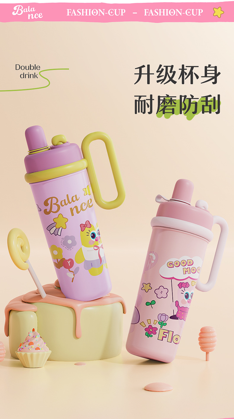 【萌趣食品!级双饮700ML保温杯】新款可爱多大容量水杯 双饮带手柄吸管杯 卡通创意保温杯 316不锈钢食品级保温杯