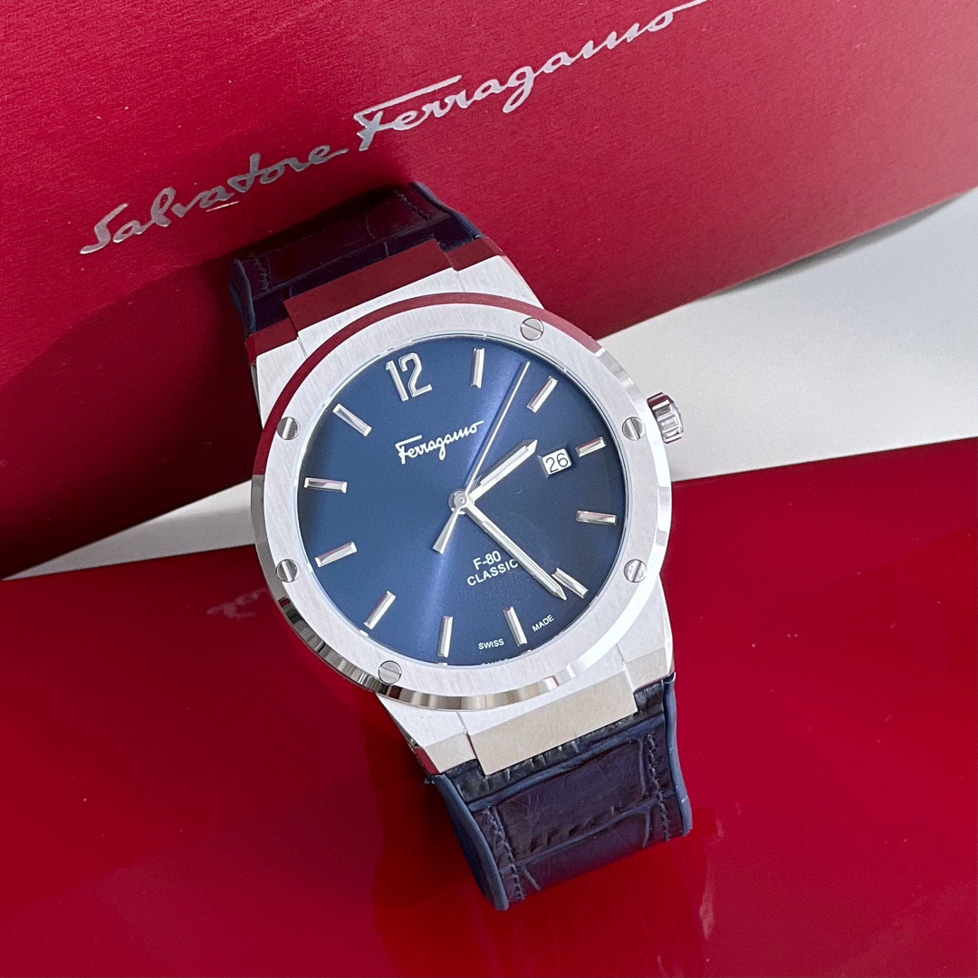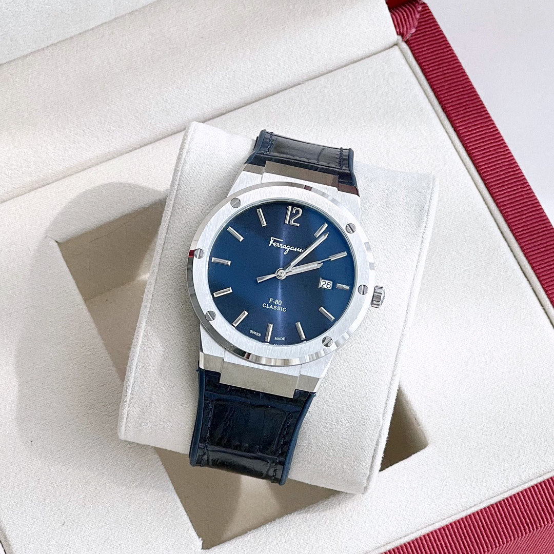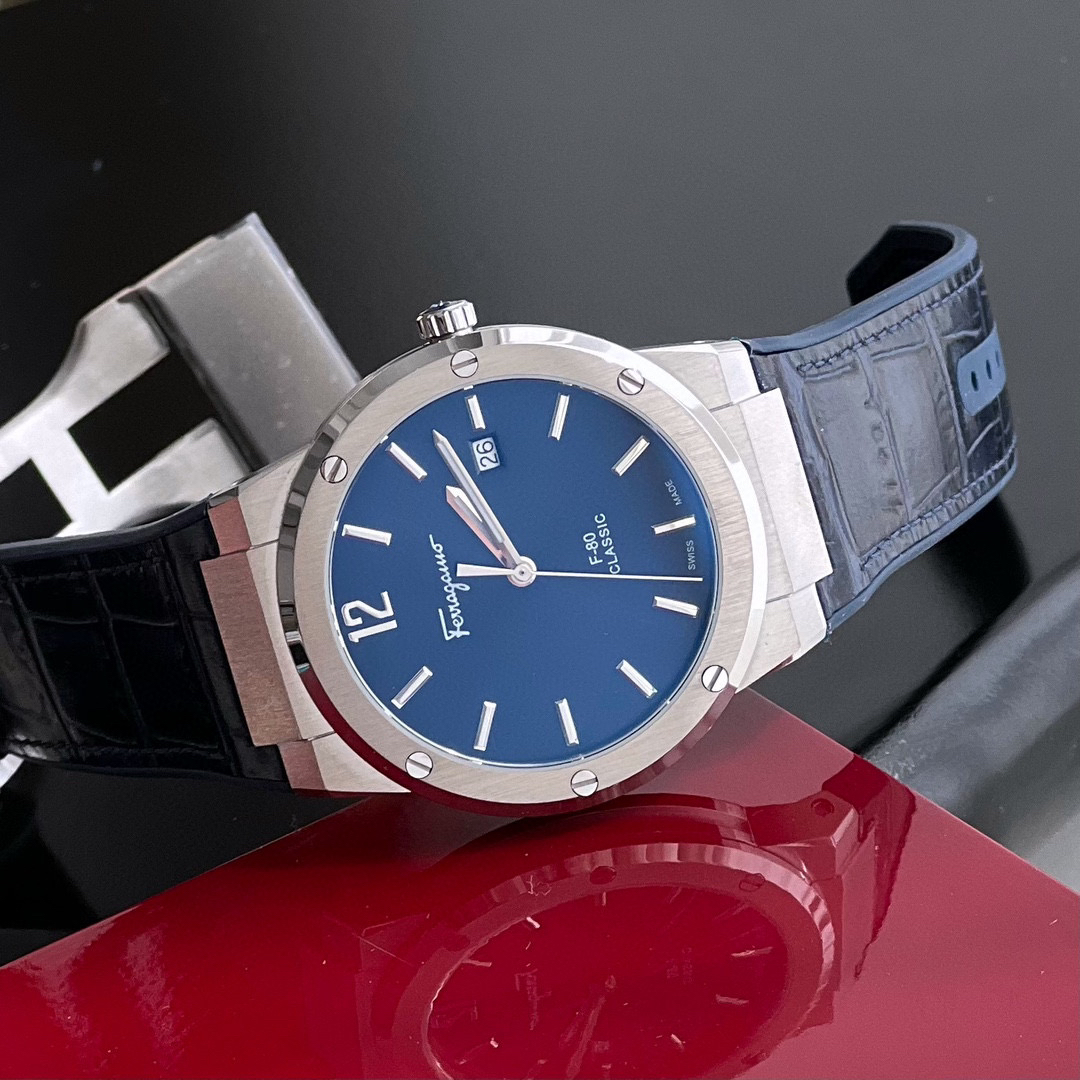 新款首发!外贸出口订单,Ferragmo F-80 Slim系列,简约优雅时尚男表;表径:41mm,采用纤薄的表壳,运动的气质;鳄鱼纹蛇纹小牛皮搭配橡胶表带,运动与优雅联合,彰显匠心精工品质,防水防汗佩戴舒适;简约太阳纹盘面,经典大气三针设计,立体时标Logo增添视觉层次感,硬朗螺钉精钢表壳,拉丝工艺,搭配齿轮F浮雕表冠,突显现代都市型男格调;底盖镌刻Ferragamo总部斯皮尼图案。蓝宝石水晶镜面;瑞士石英机芯,性能稳定,走时精准,50米防水,配原盒包装一手好价!