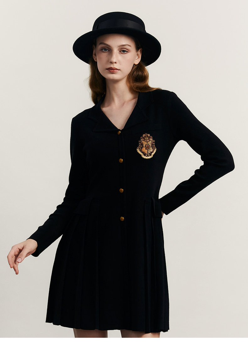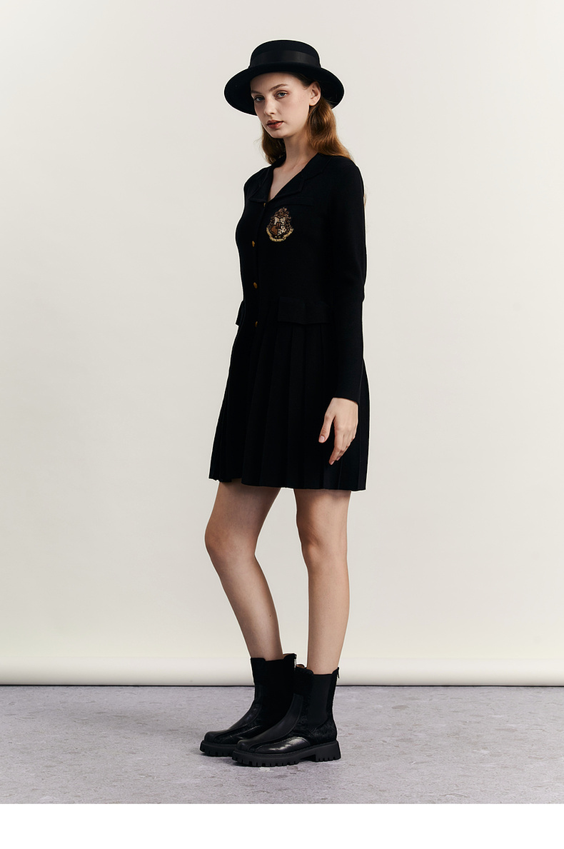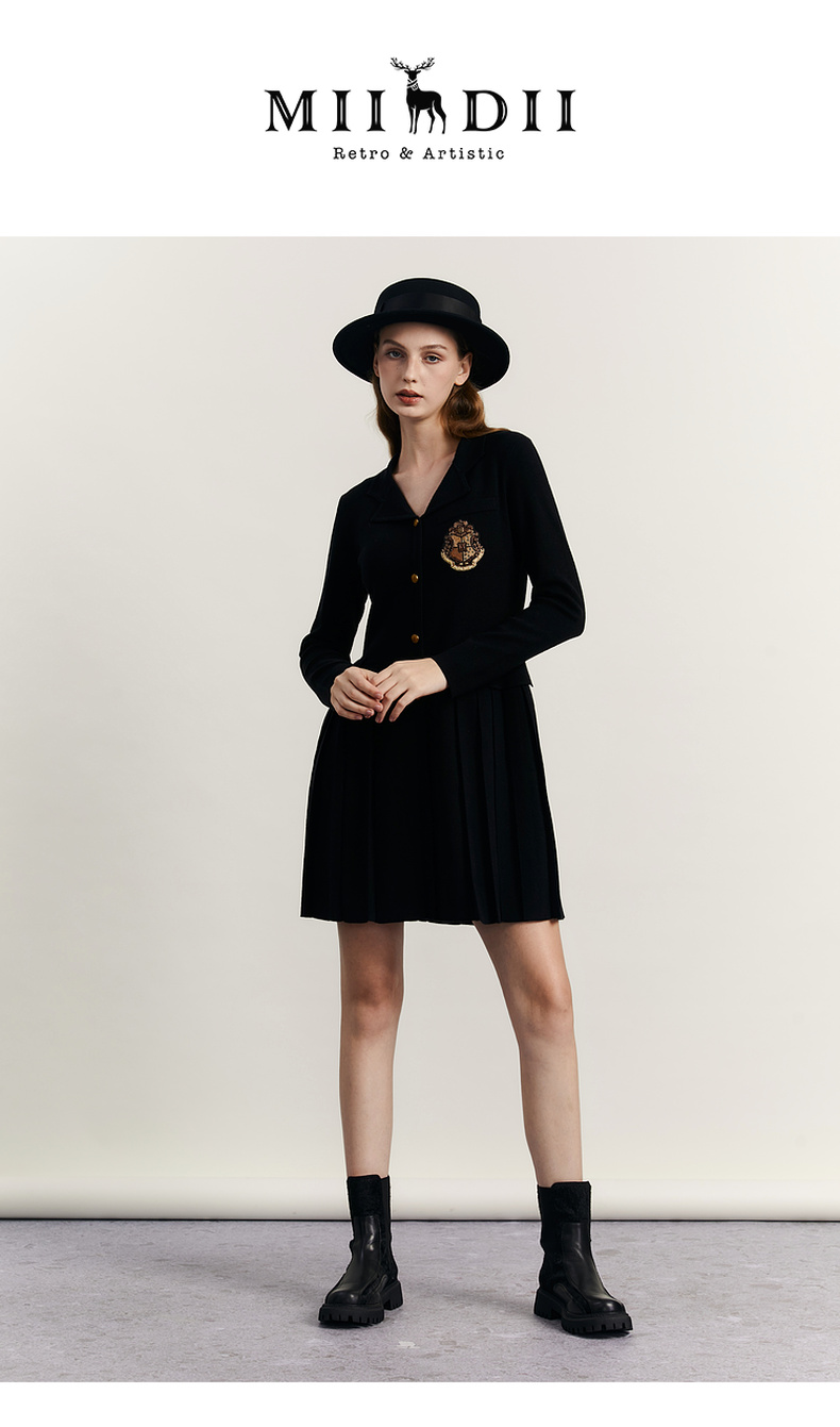 谜底针织连衣裙女2023冬新品英伦风时尚刺绣修身中长裙234MZ1857