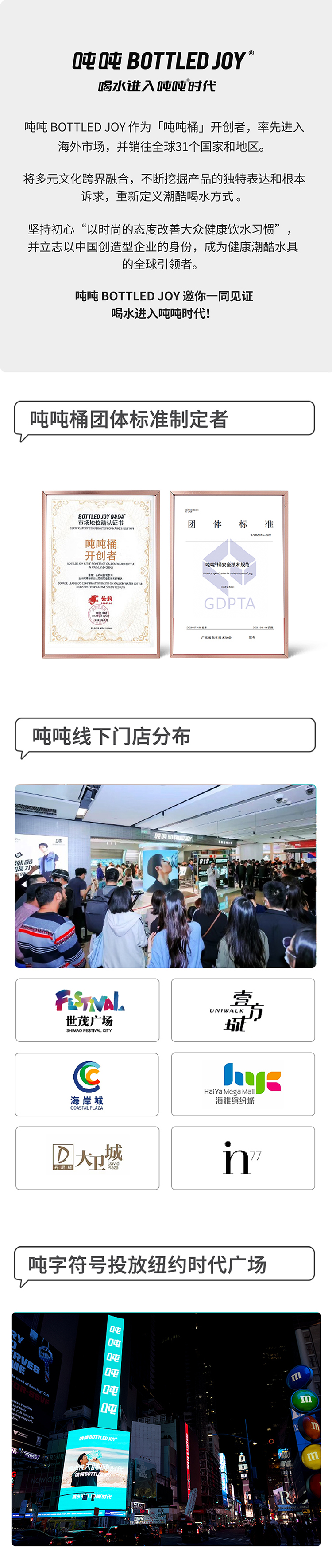 - 吨吨BOTTLED JOY作为吨吨桶开创者,重新定义潮酷喝水方式,喝水进入吨吨时代!正牌吨吨桶,吨吨BOTTLED JOY