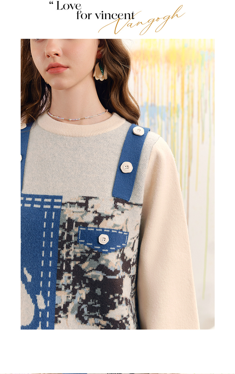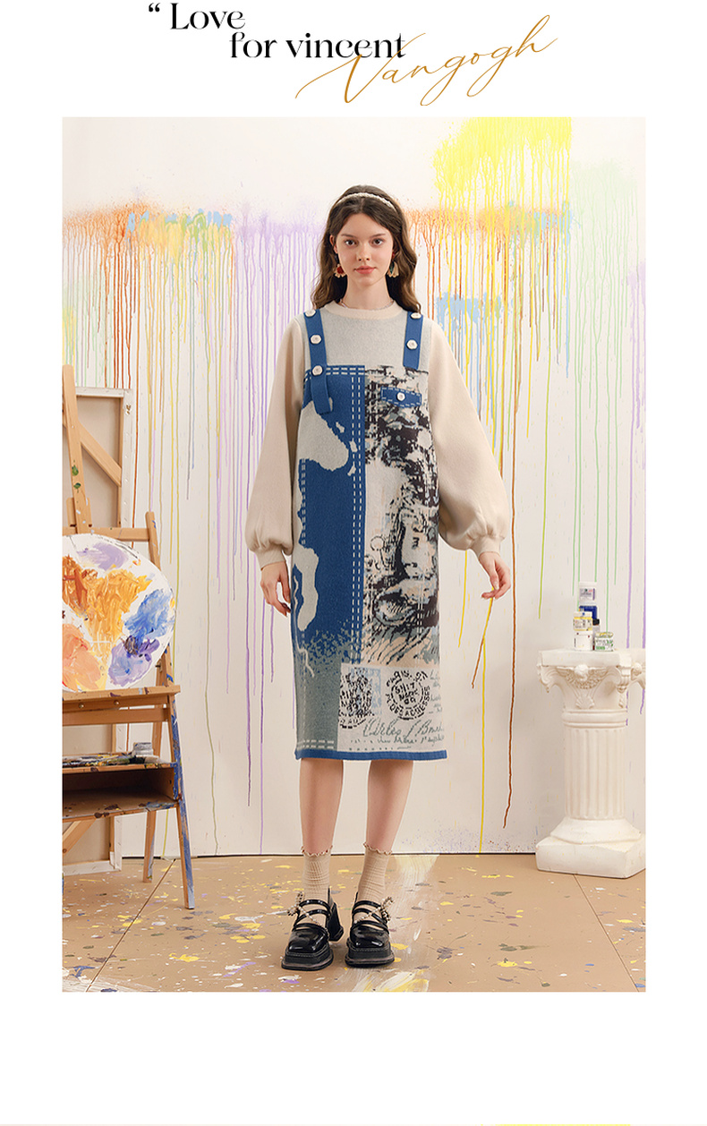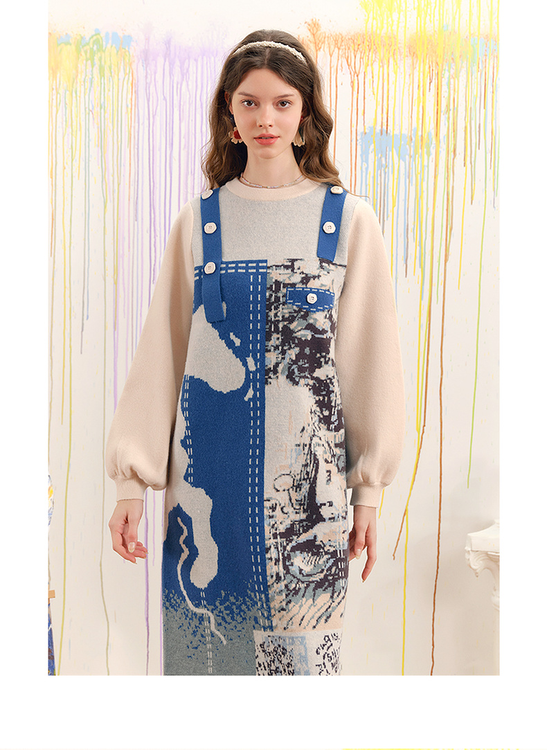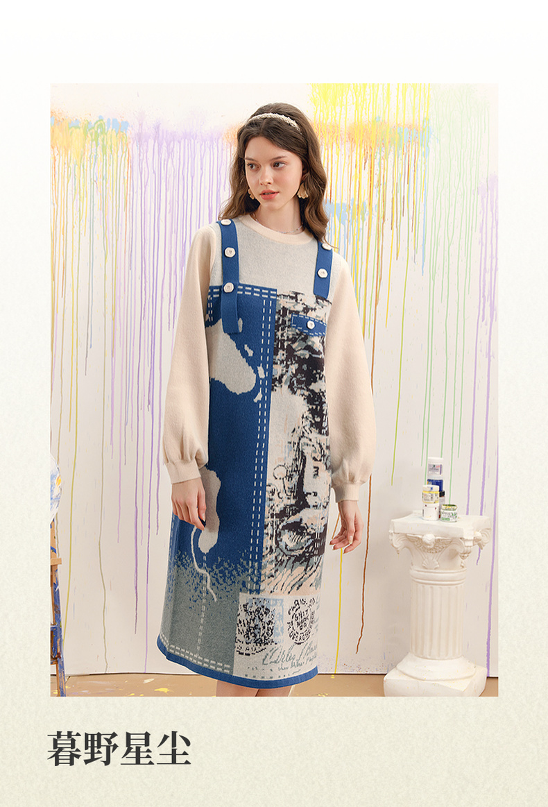 两三事梵高文艺暮野星尘2024冬季新款复古花色假两件毛衣裙连衣裙