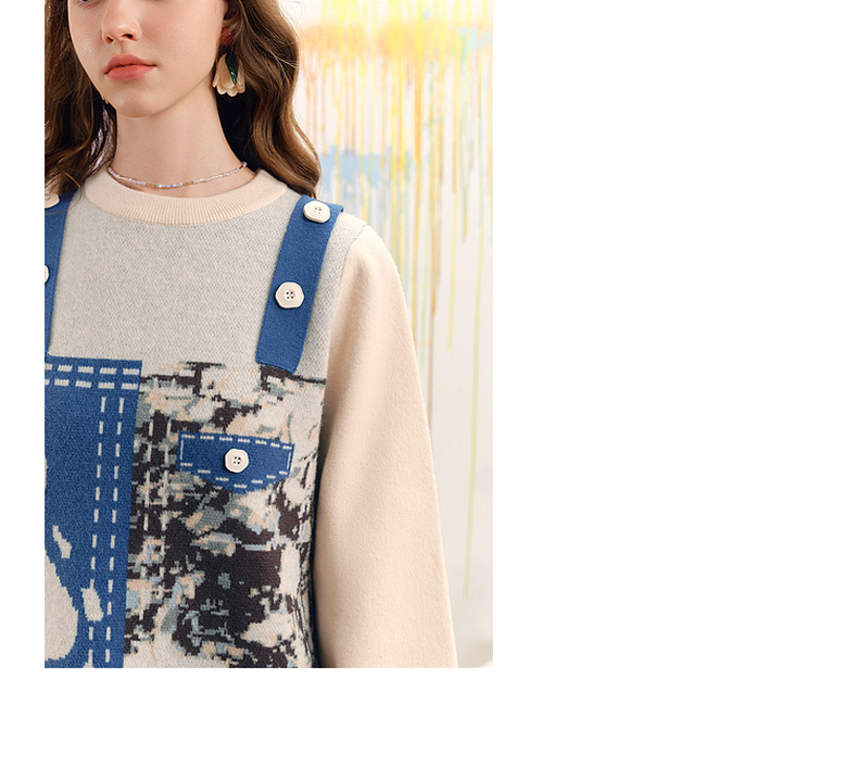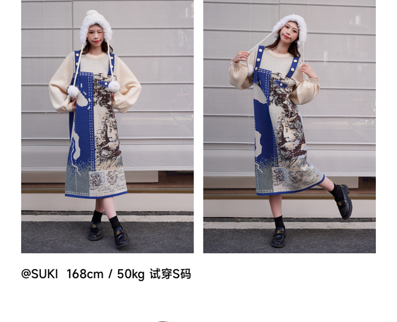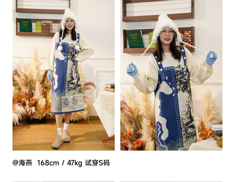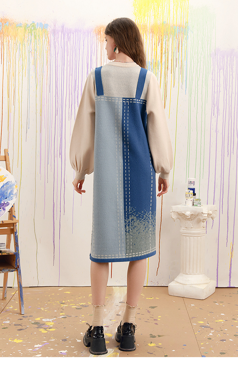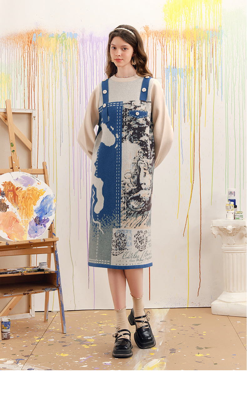 两三事梵高文艺暮野星尘2024冬季新款复古花色假两件毛衣裙连衣裙