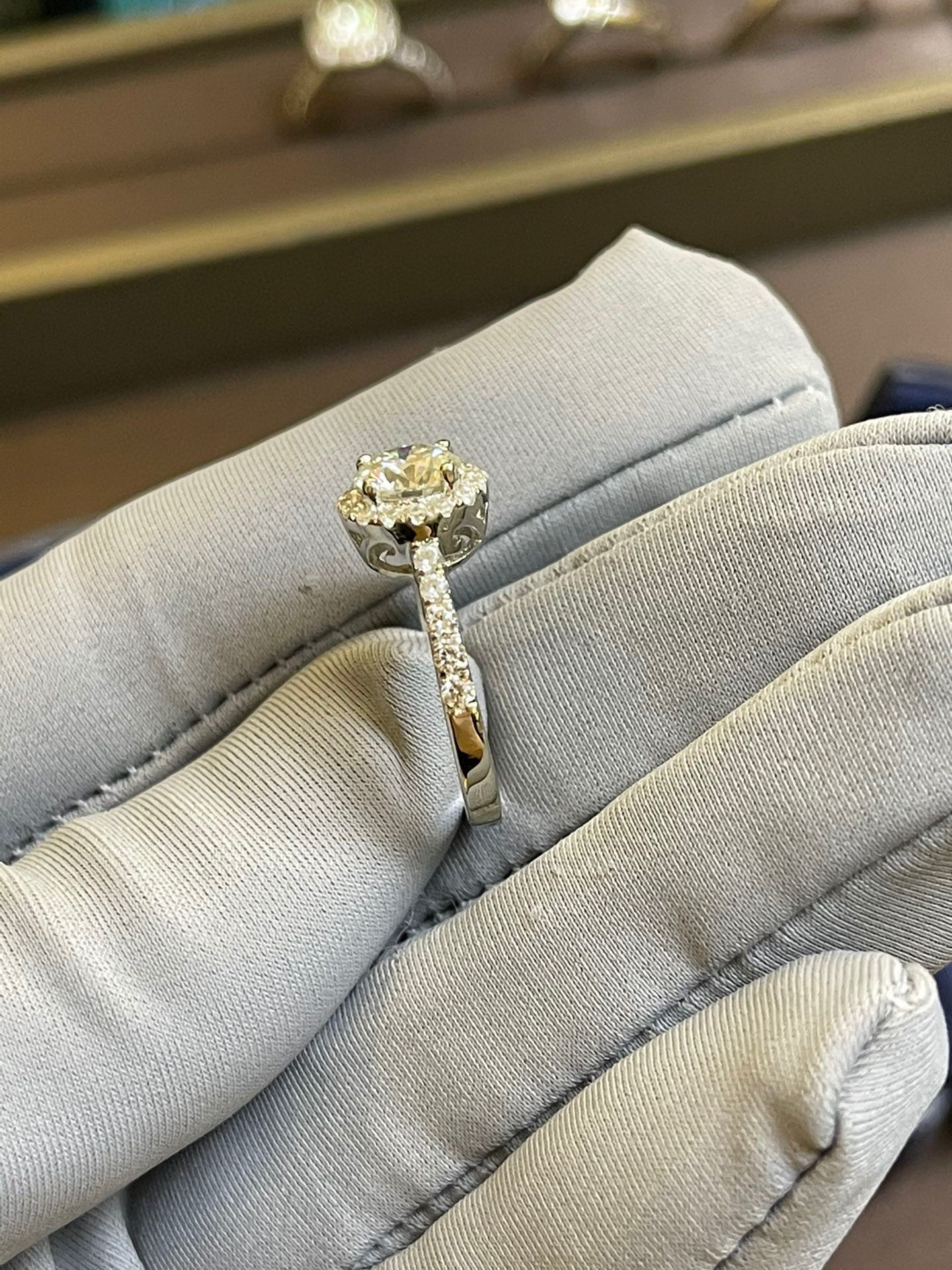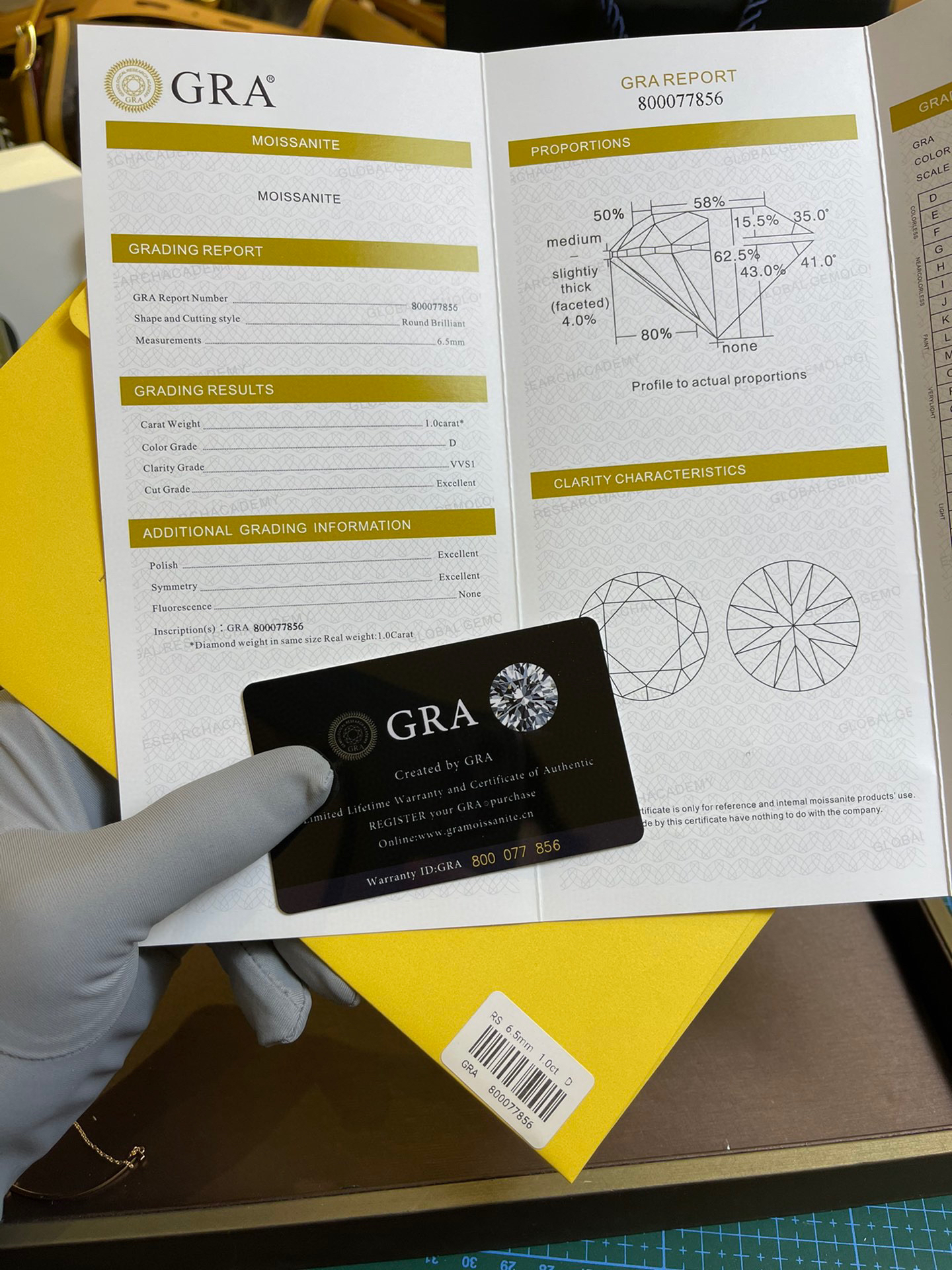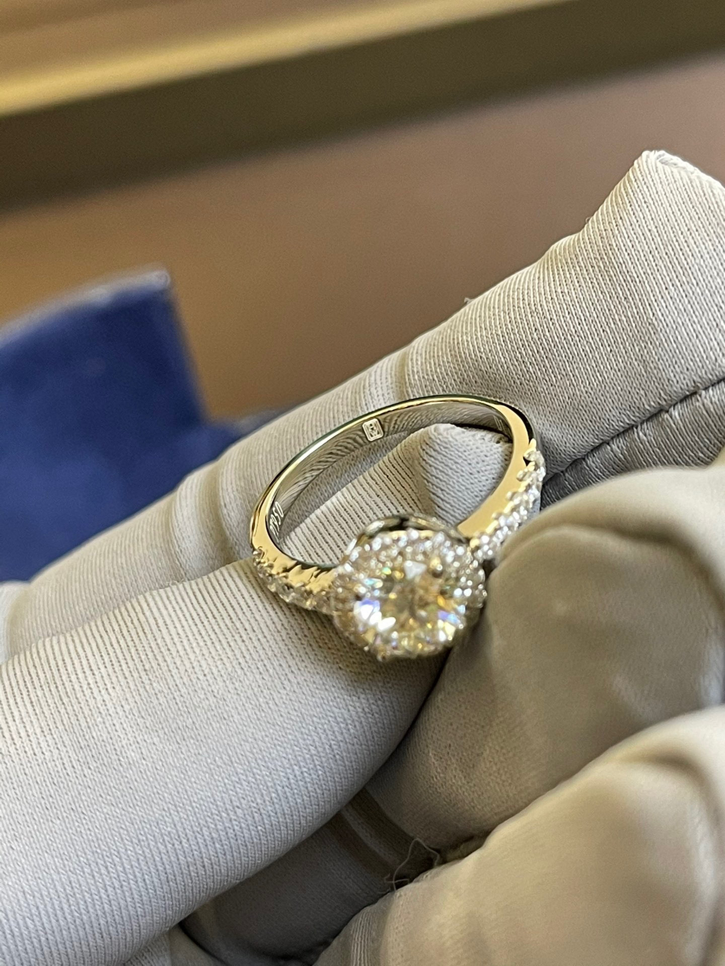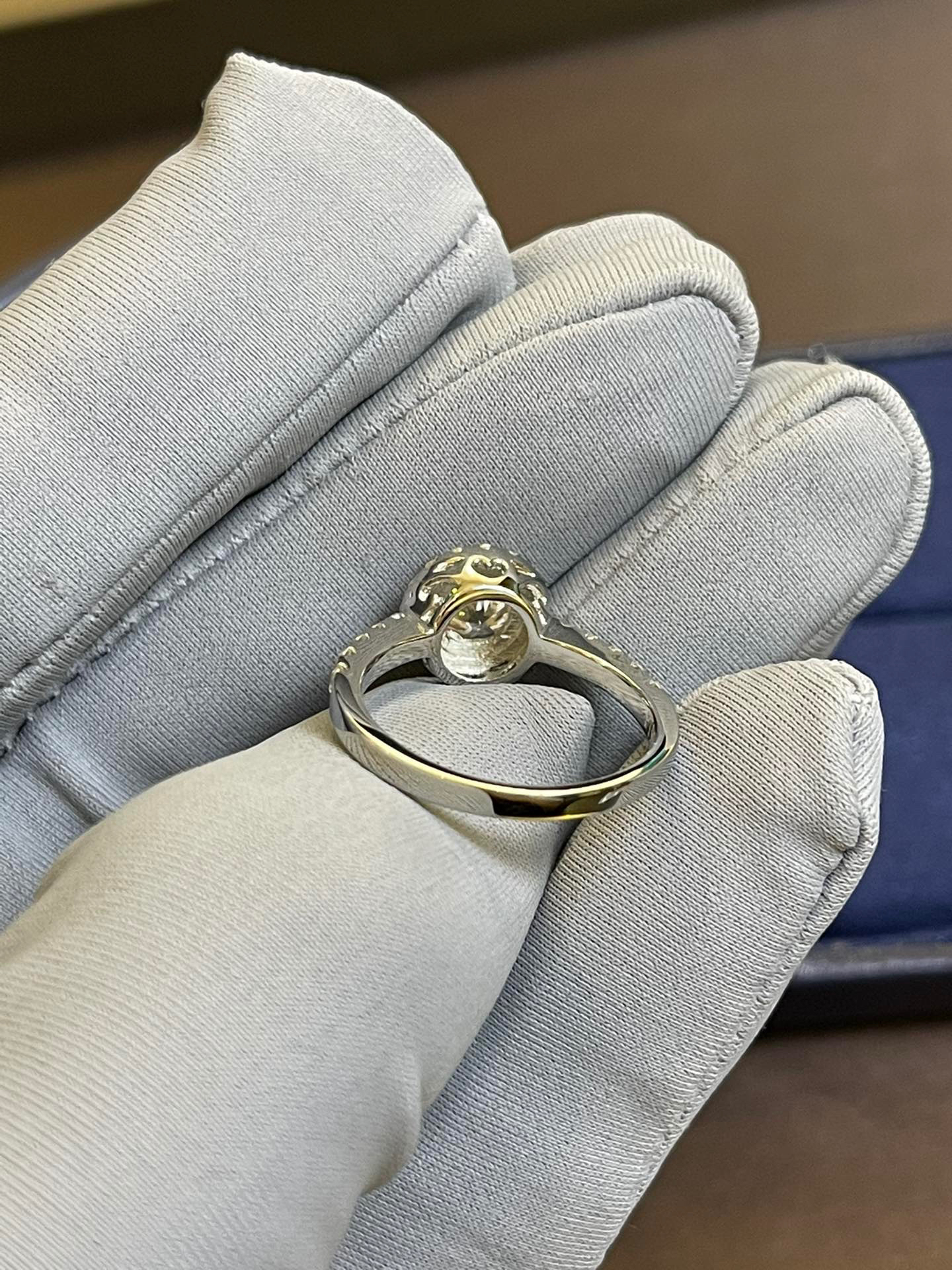 主钻1克拉,周围一圈小碎钻,圆形的设计,上手非常的贵气!全套包装,带GRA证书,一钻一证!