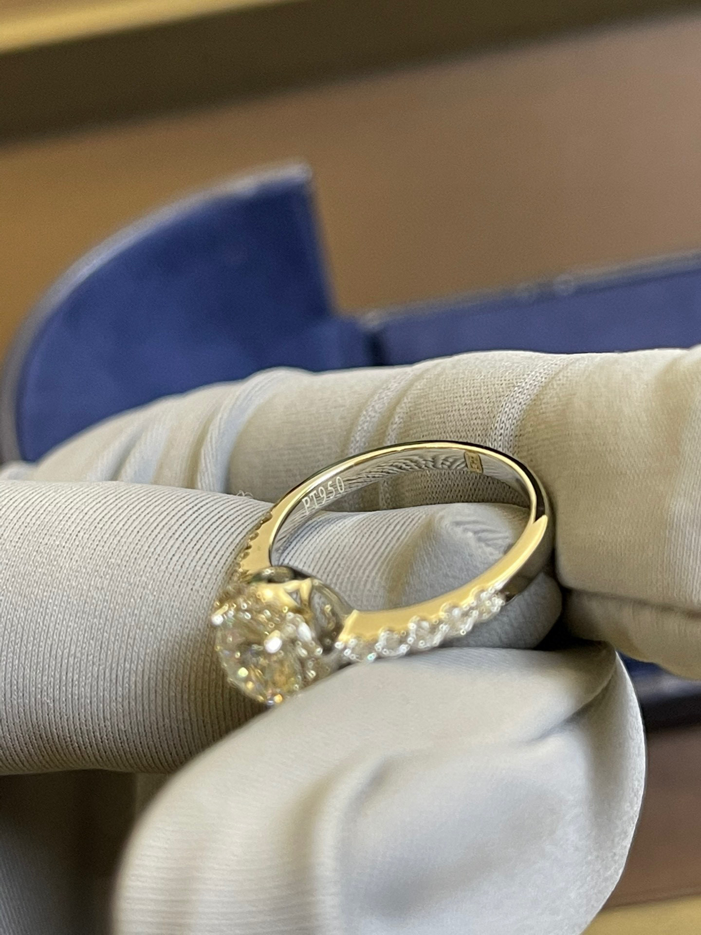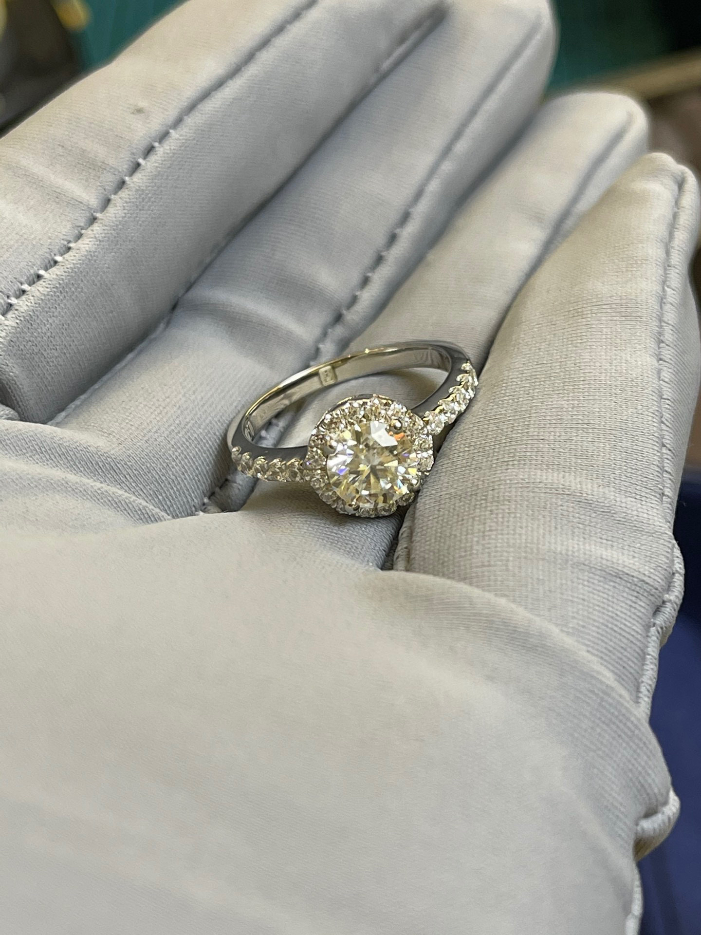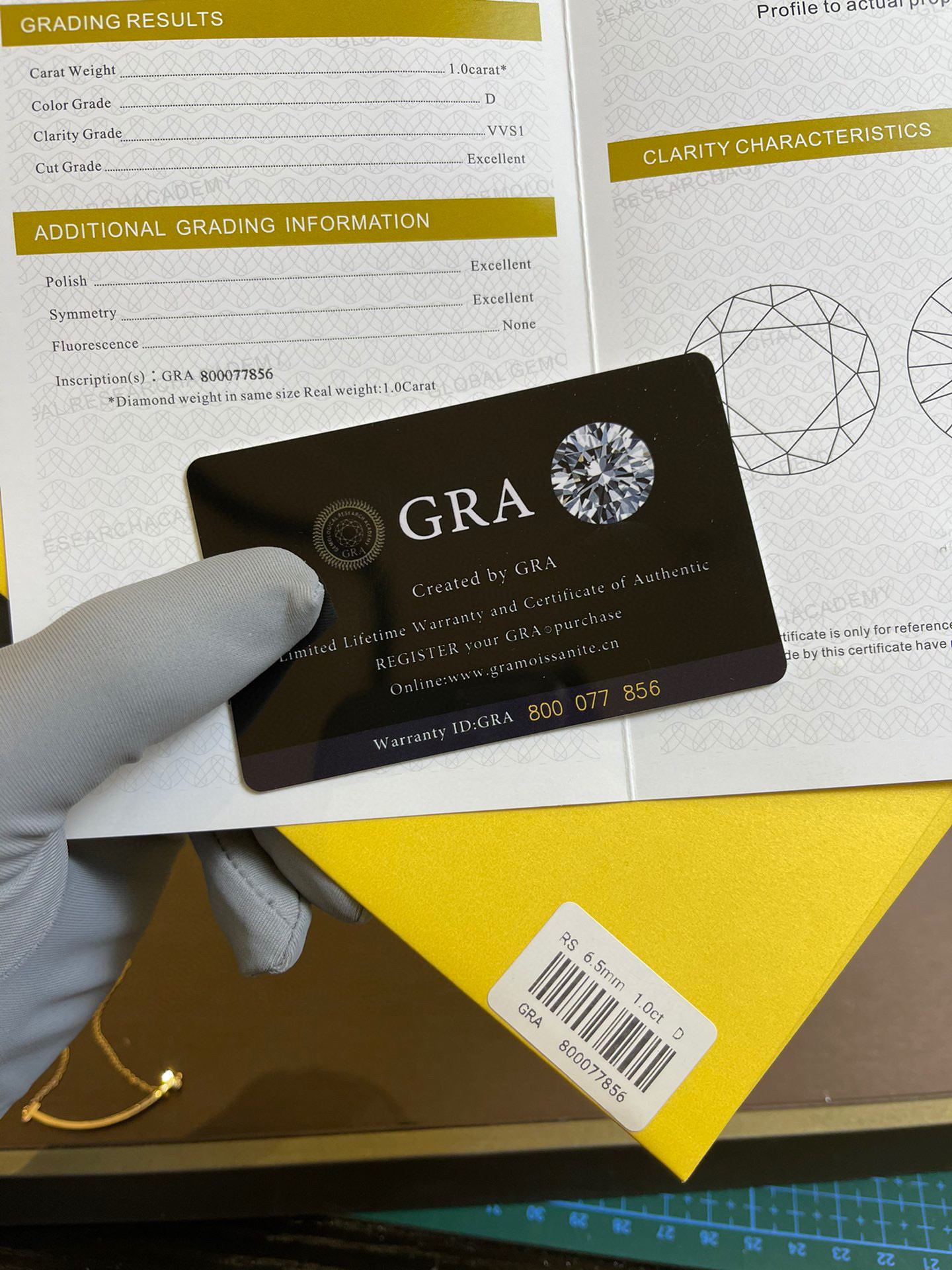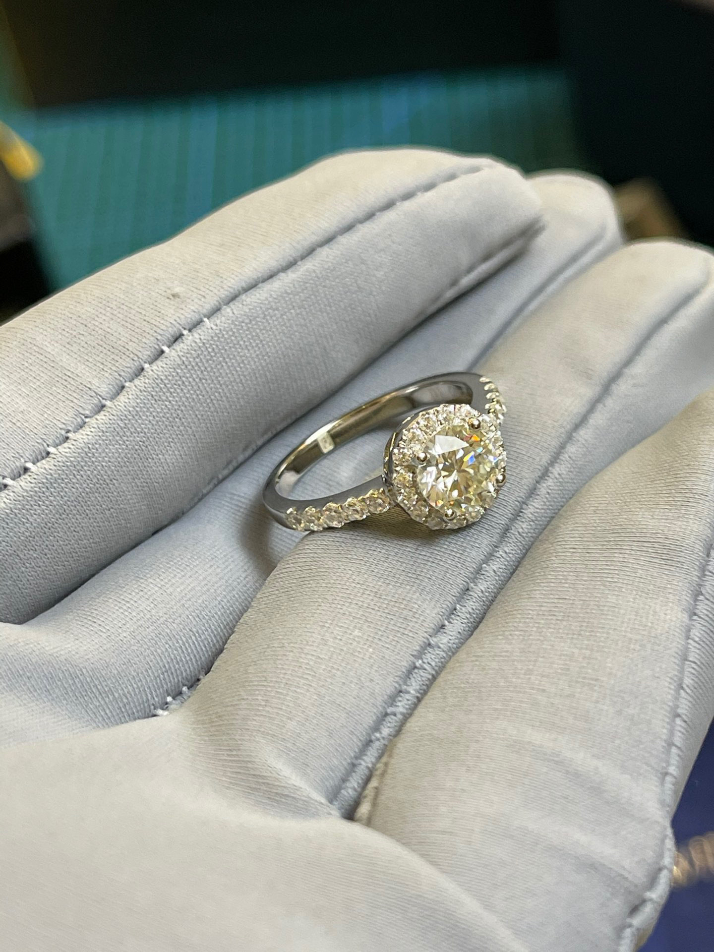 主钻1克拉,周围一圈小碎钻,圆形的设计,上手非常的贵气!全套包装,带GRA证书,一钻一证!