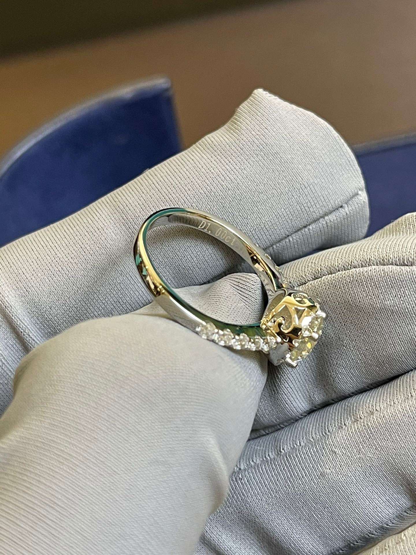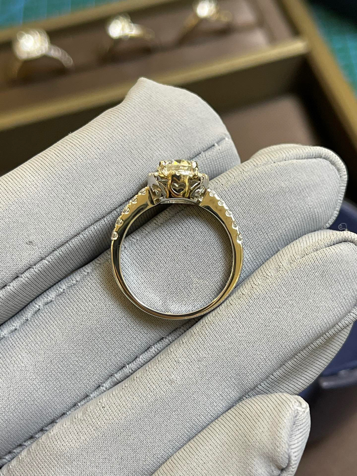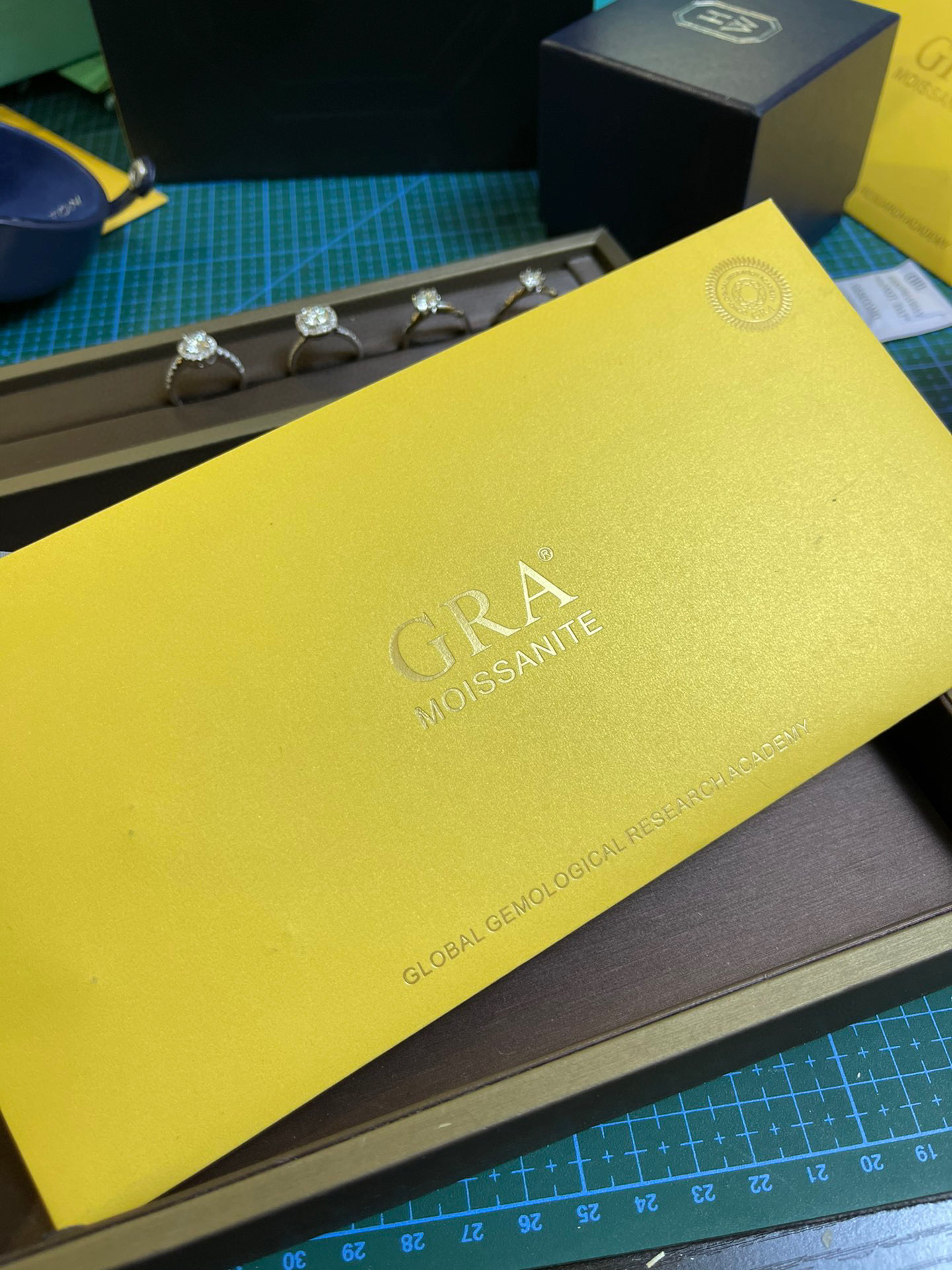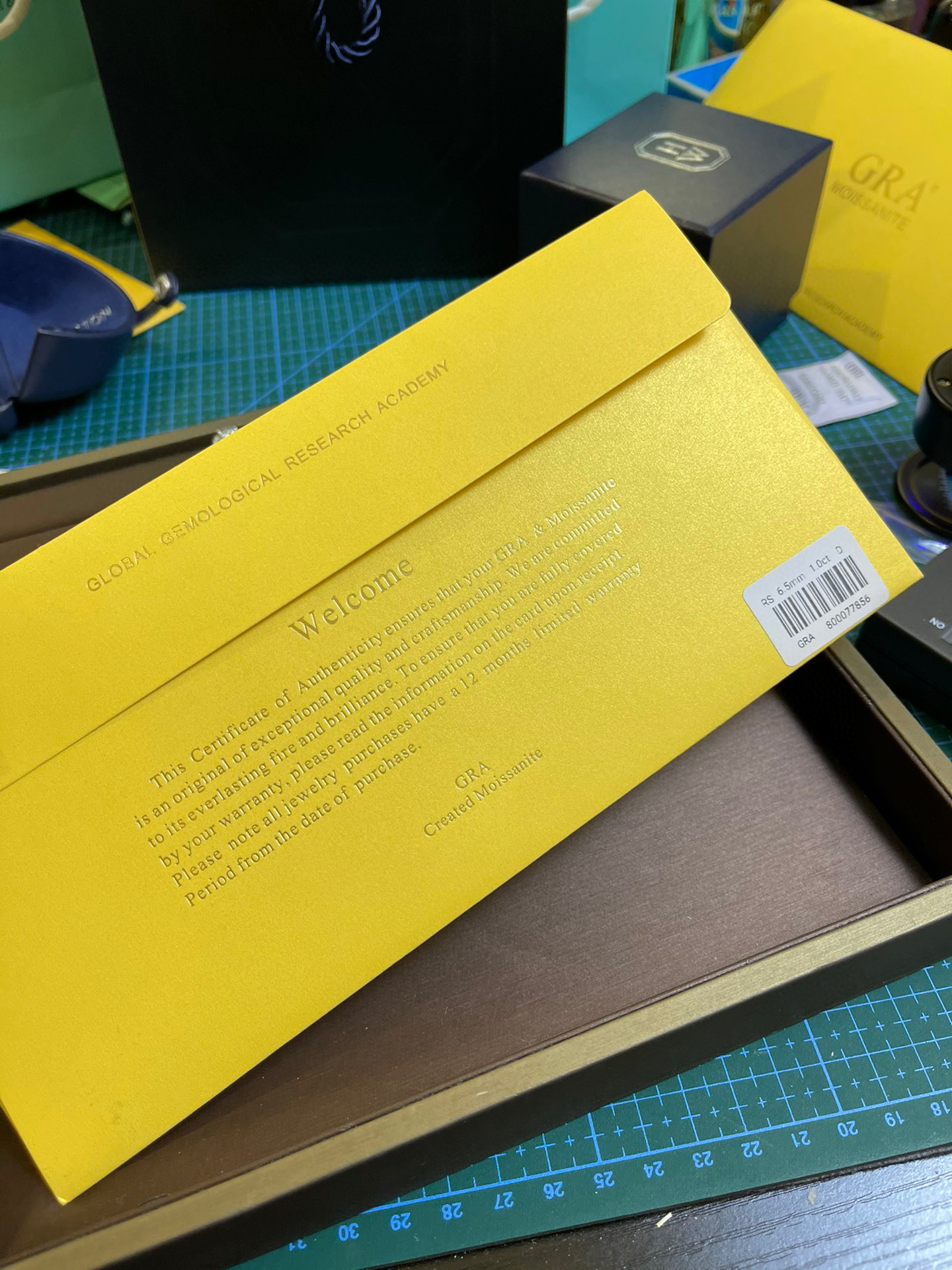 主钻1克拉,周围一圈小碎钻,圆形的设计,上手非常的贵气!全套包装,带GRA证书,一钻一证!