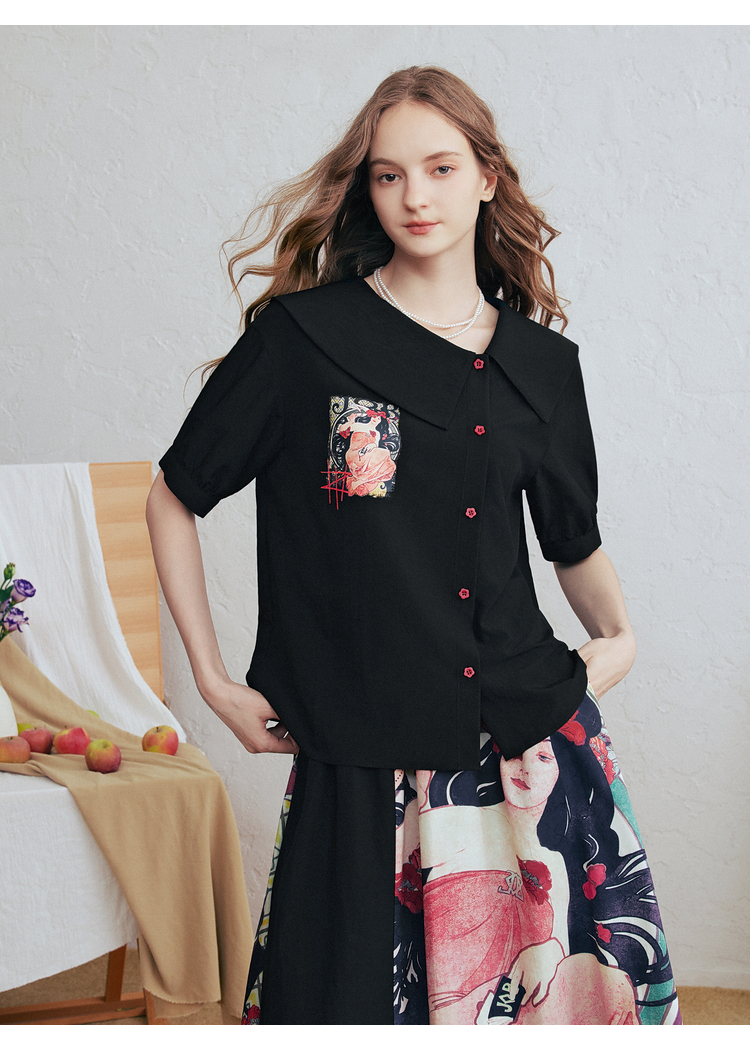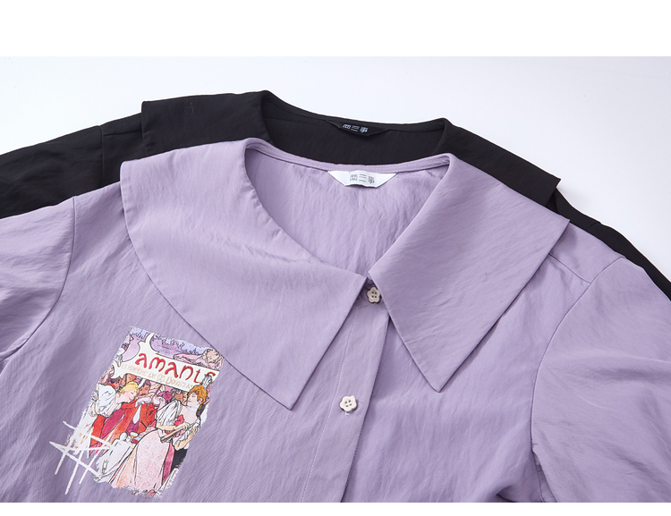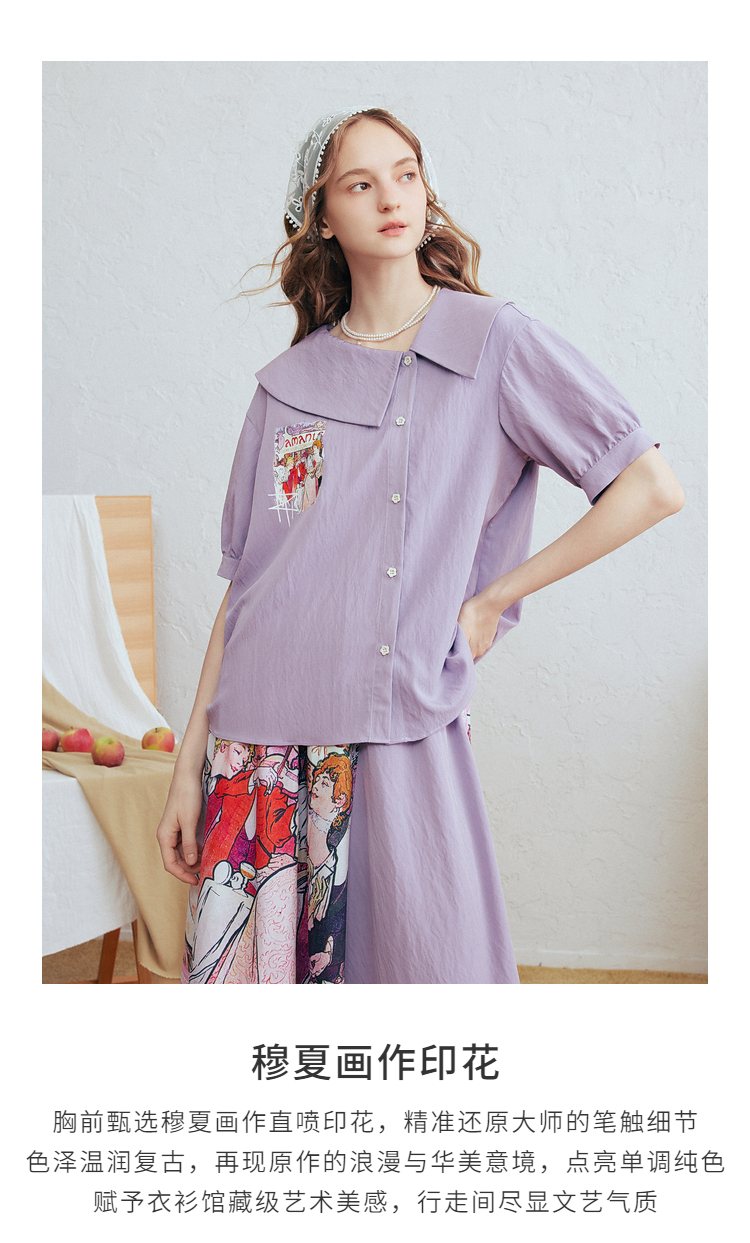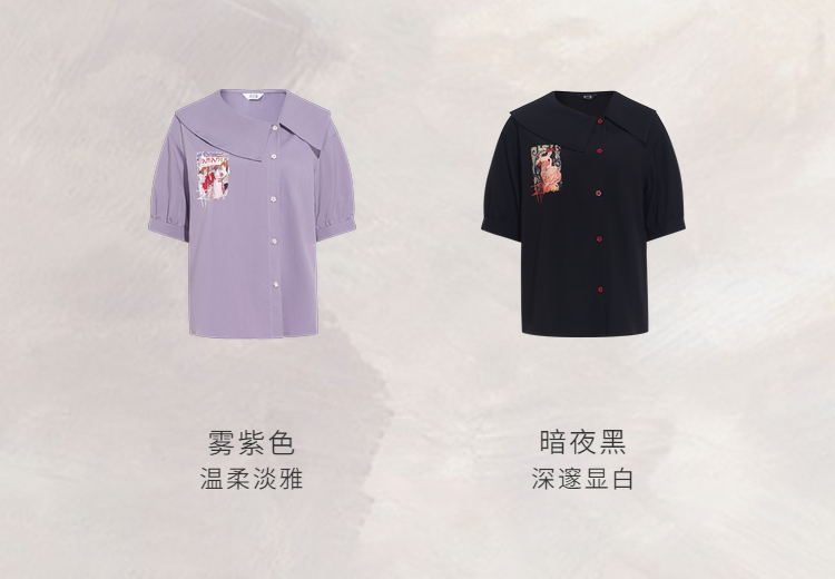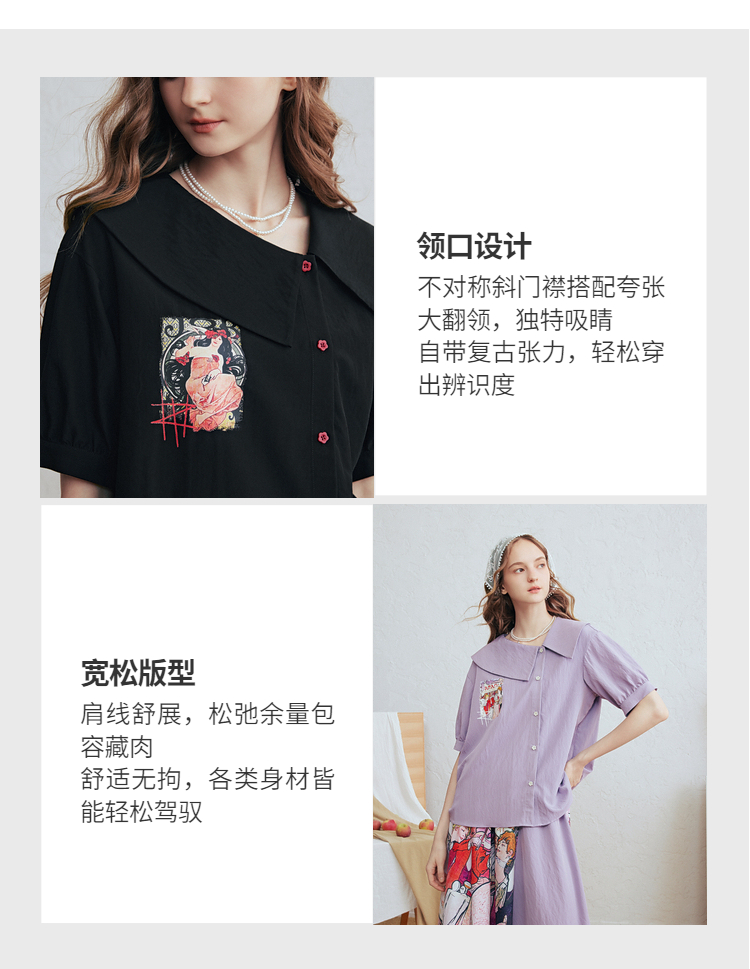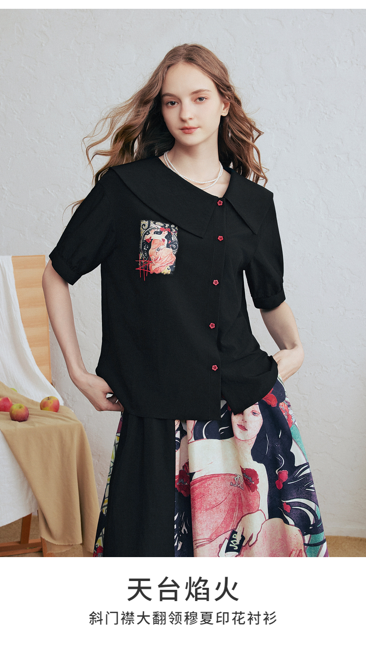 两三事 天台焰火 2026春季新款文艺风不对称翻领印花衬衫女宽松
