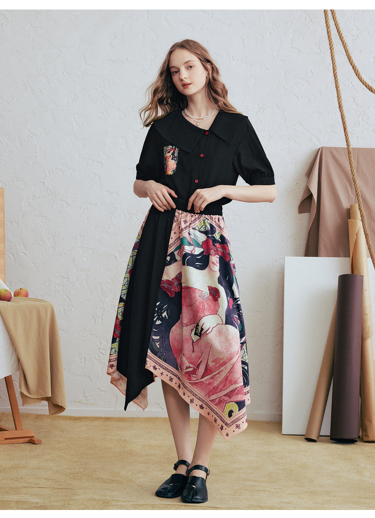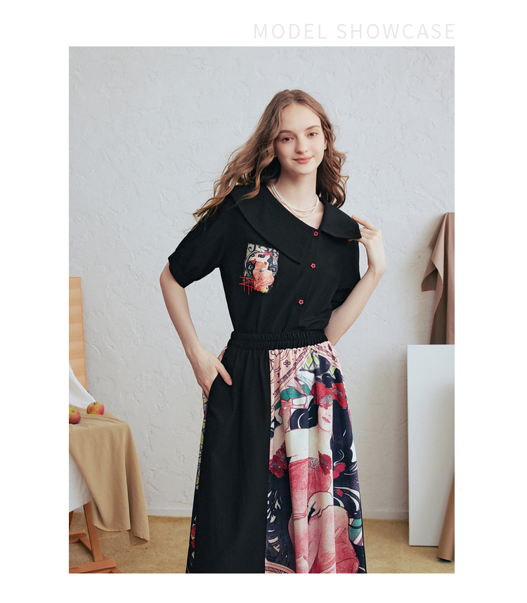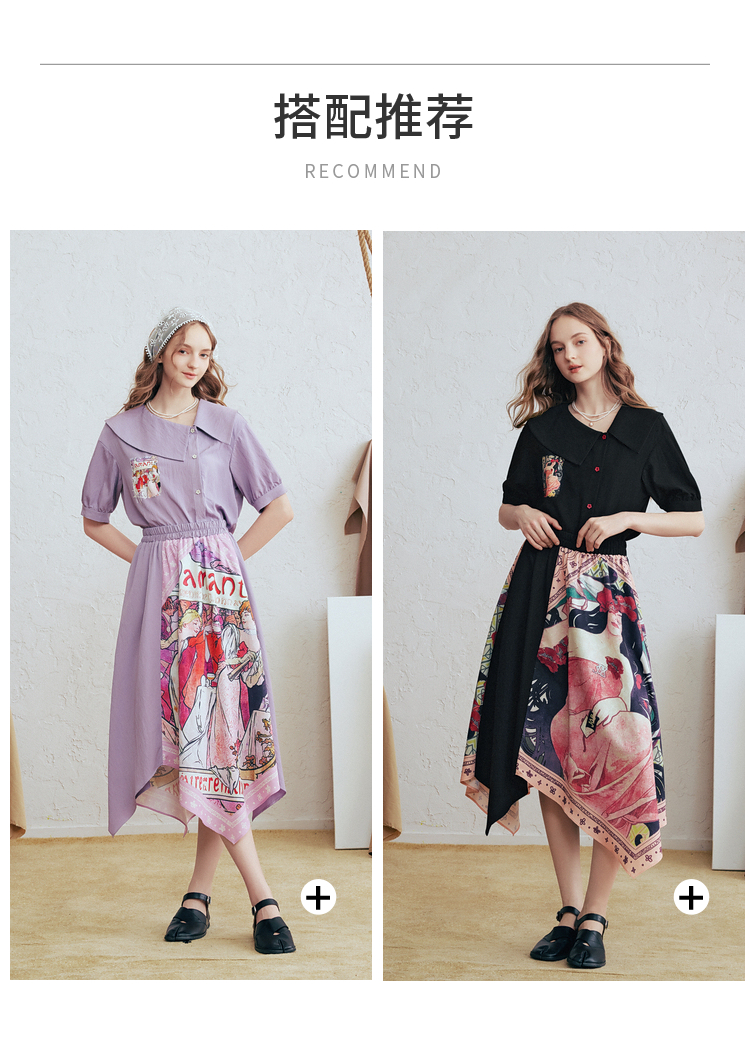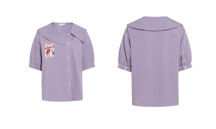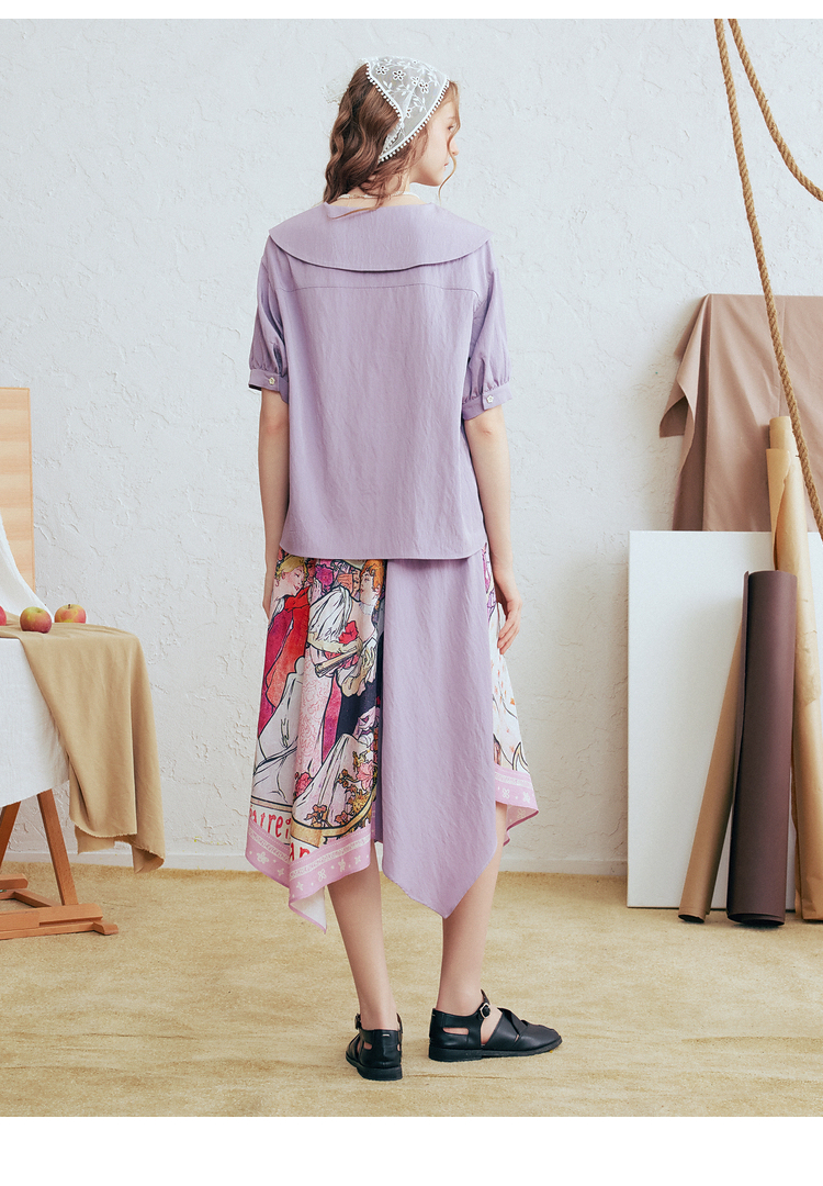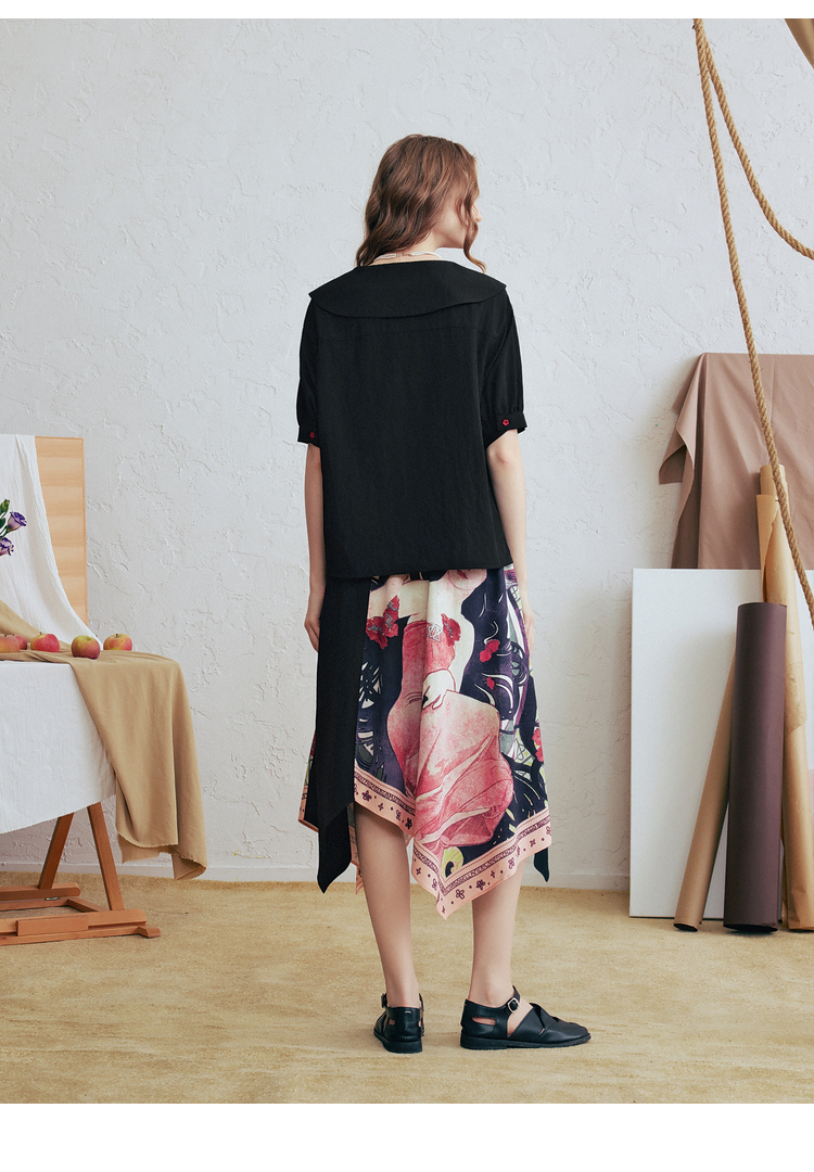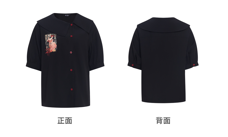 两三事 天台焰火 2026春季新款文艺风不对称翻领印花衬衫女宽松