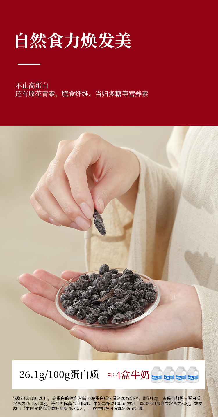黑豆(≥65%)、黄冰糖、当归(≥5%)、黄芪(≥3%)、红枣(>2%)、食用盐