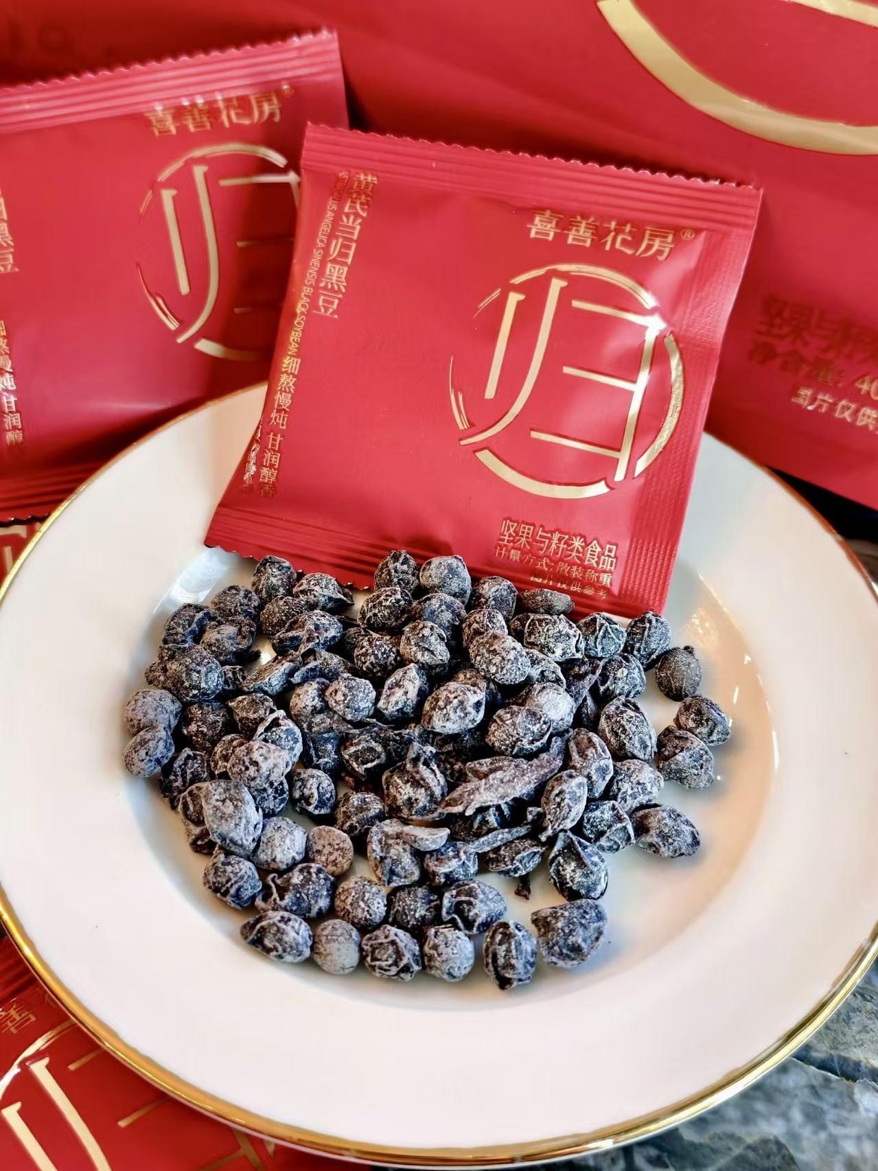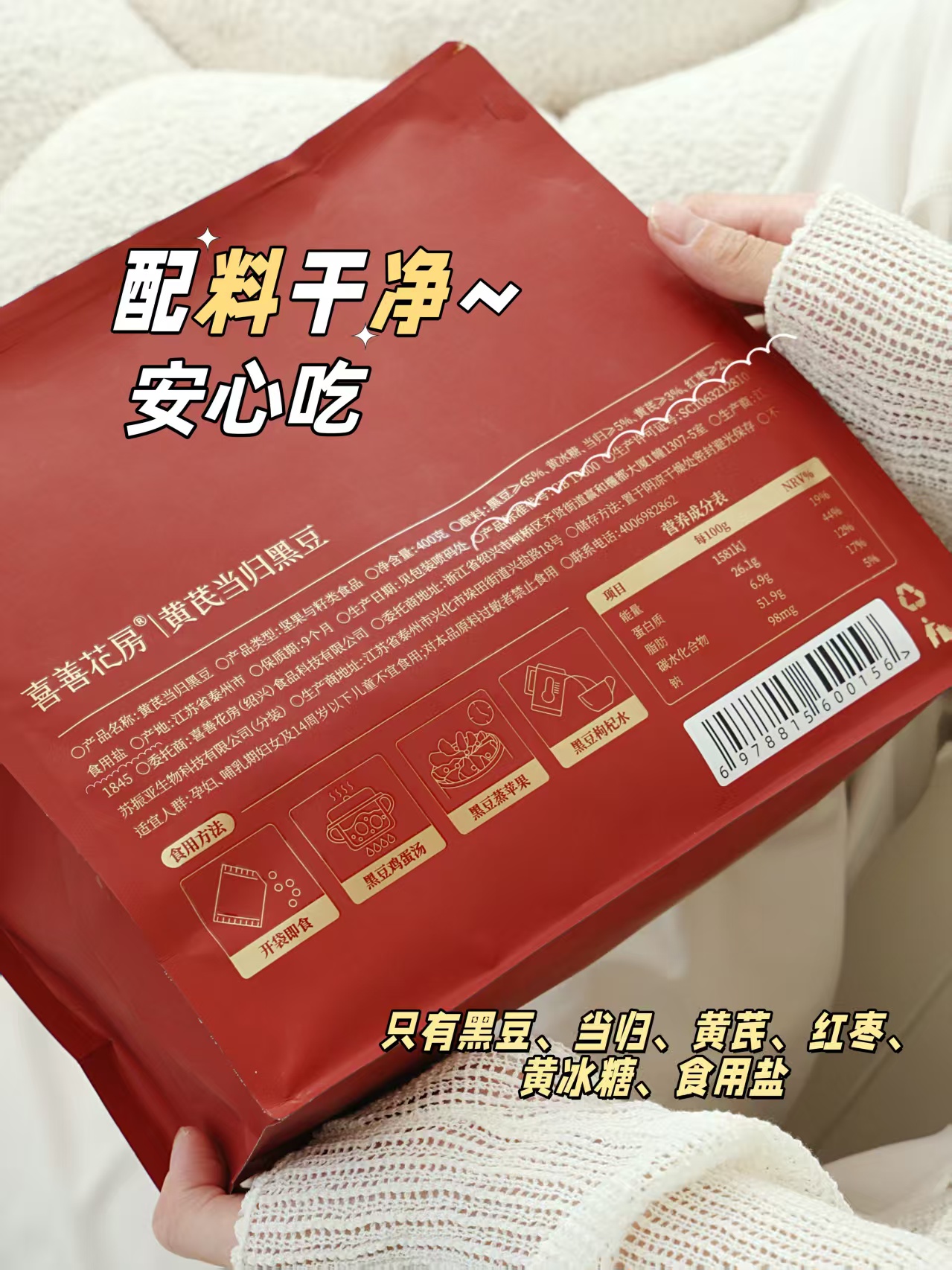 配料表:黑豆≥65%、黄冰糖、当归≥5%、黄芪≥3%、红枣≥2%、食用盐