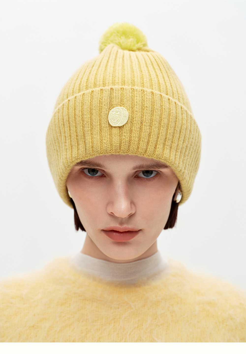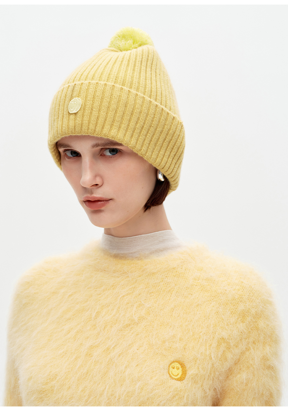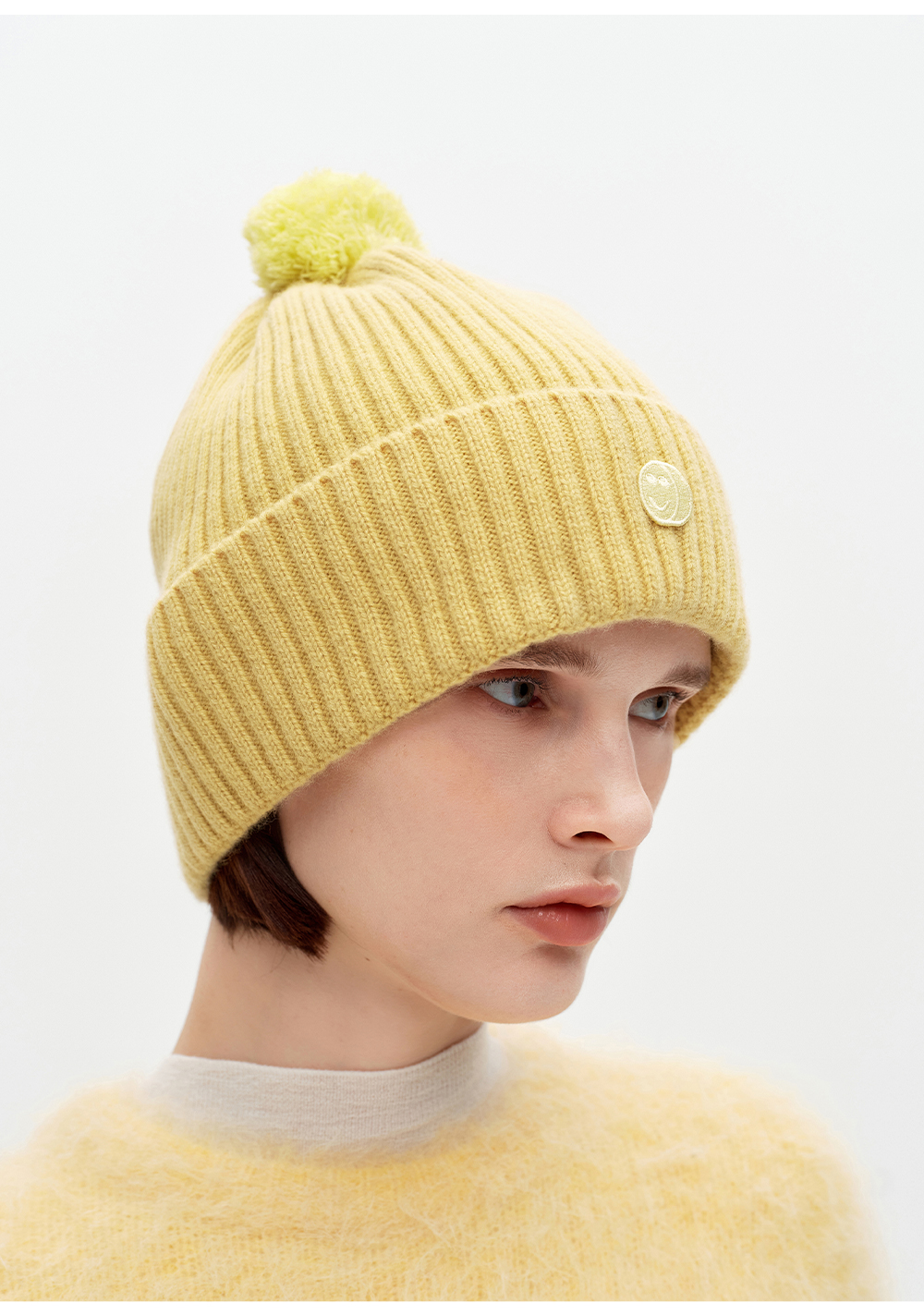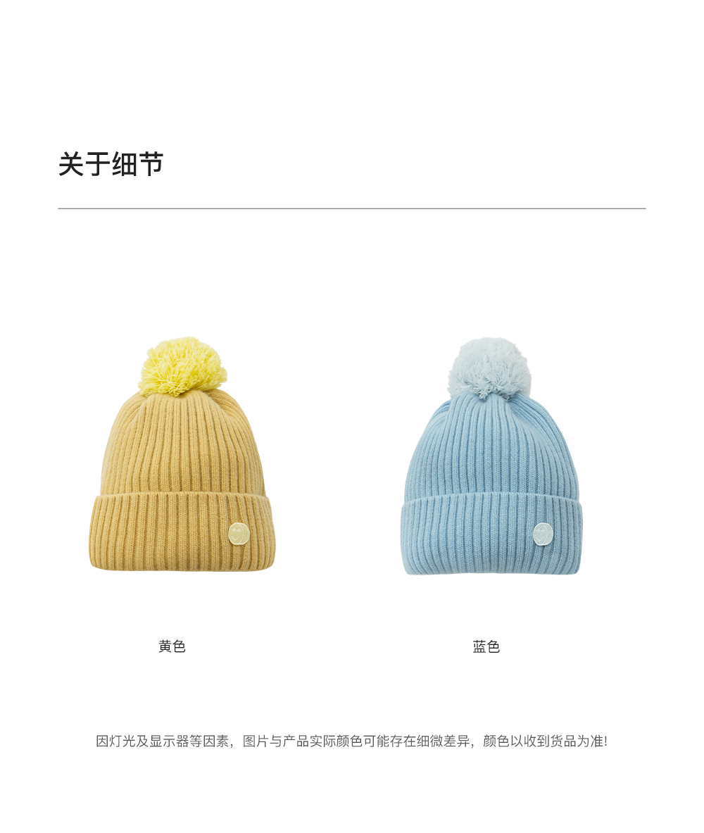 SELFWHO100%绵羊毛笑脸章仔针织帽女2025冬新款保暖毛球装饰帽子