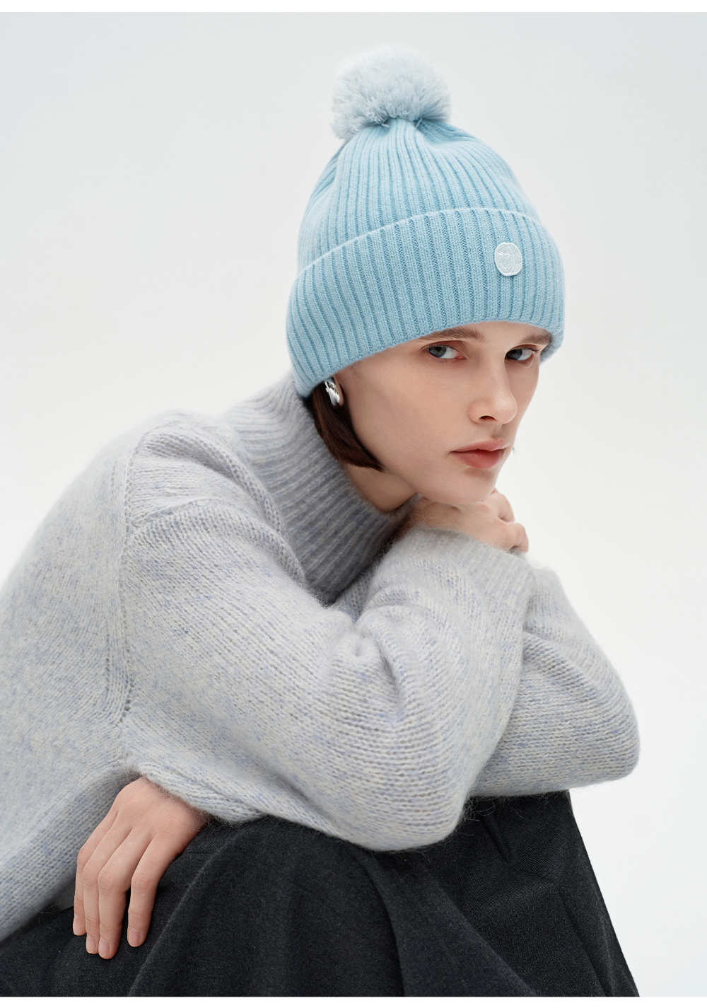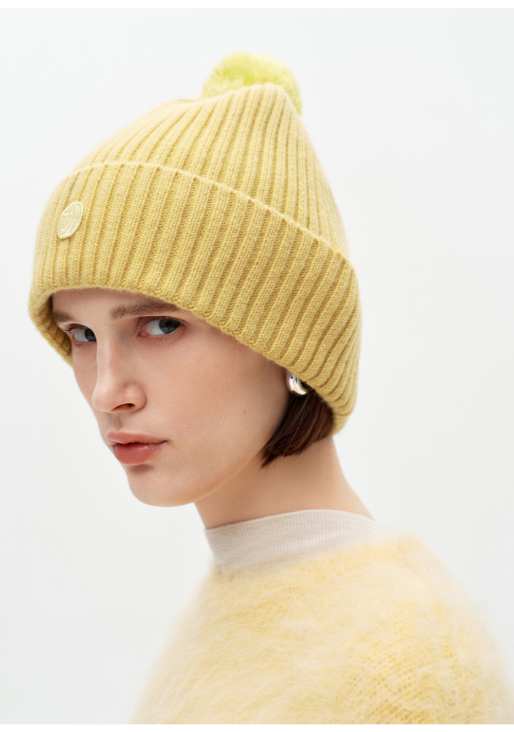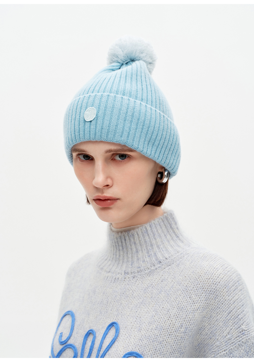 SELFWHO100%绵羊毛笑脸章仔针织帽女2025冬新款保暖毛球装饰帽子
