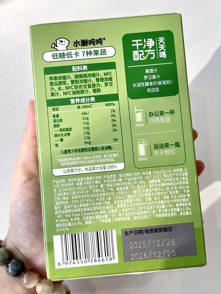 【产品名称】:水獭吨吨纤果茶(羽衣甘蓝复合果蔬汁饮料)