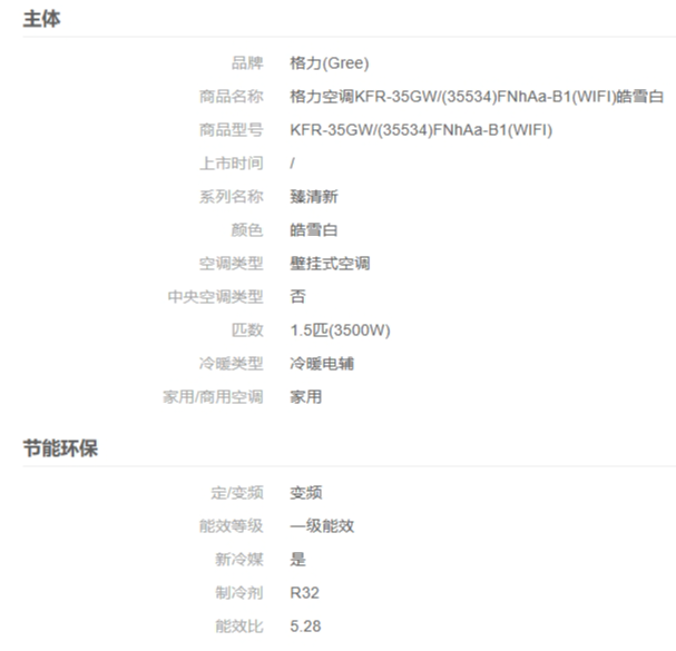 格力/空调/KFR-35GW/(35534)FNhAa-B1(WIFI)(含管)(皓雪白)/臻清新 含管 新1级变频冷暖 独立新风设计 衡温立体送风 静音 格力壁挂式空调挂机