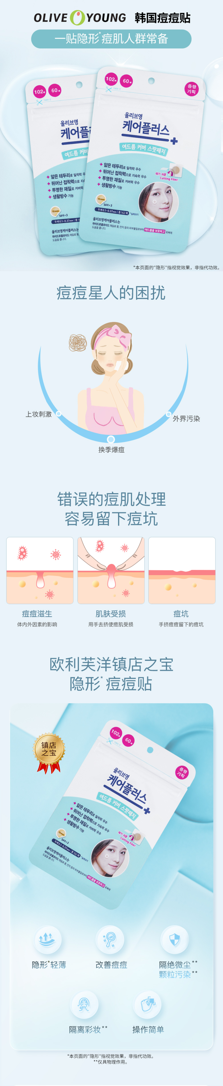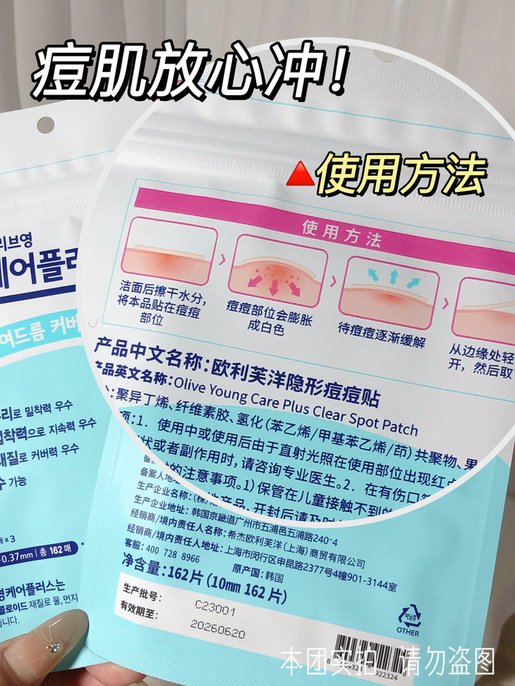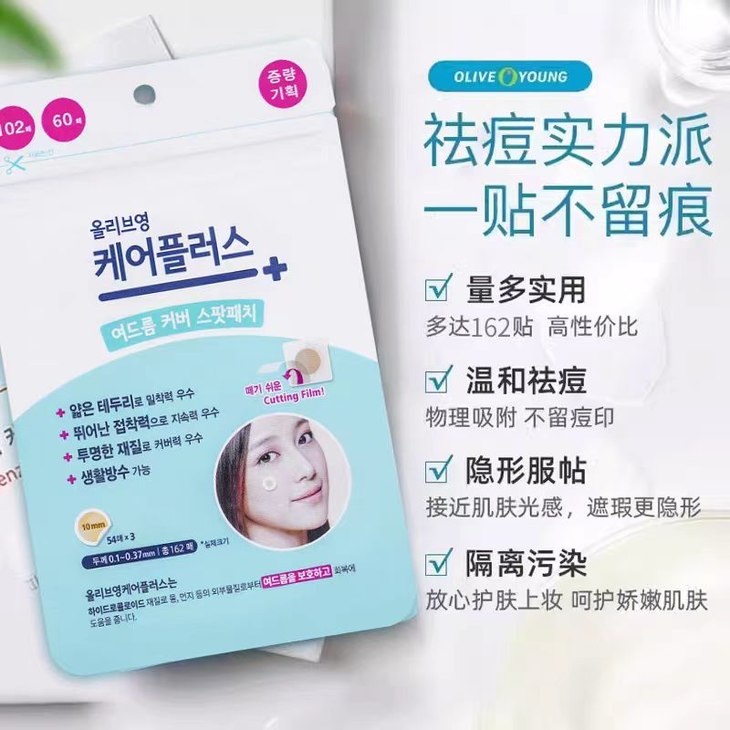 祛痘实力派,贴上还隐形 让颜值没有尴尬期! 👉OLIVE YOUNG欧利芙洋隐形痘痘贴 全新升级,包装升级,容量增加到一包162片! 油辣长痘,熬夜爆痘,姨妈爆痘 …通通都能拿下~ 源头去除痘根!痘痘里的白色脏东西都吸出来了! 👏阻隔粉尘、彩妆污染,防水防汗,祛痘不留痕 ⚠新日期 💰54.9一包(162贴)