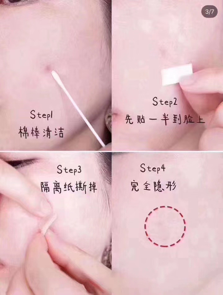 使用方法👇🏻 简单清洗伤口后将本品贴于伤口表面 将本品修剪成略大于伤口的形状 因体液分泌,贴合处会呈白色膨胀凸起 随着伤口的愈合,膨胀凸起会下沉 从边缘开始轻轻揭下 Tips: ✅夜间:可以睡前再贴、早起换新 ✅白天:由透明变白、完全不透明时可更换新贴、坚持到痘痘消失不见