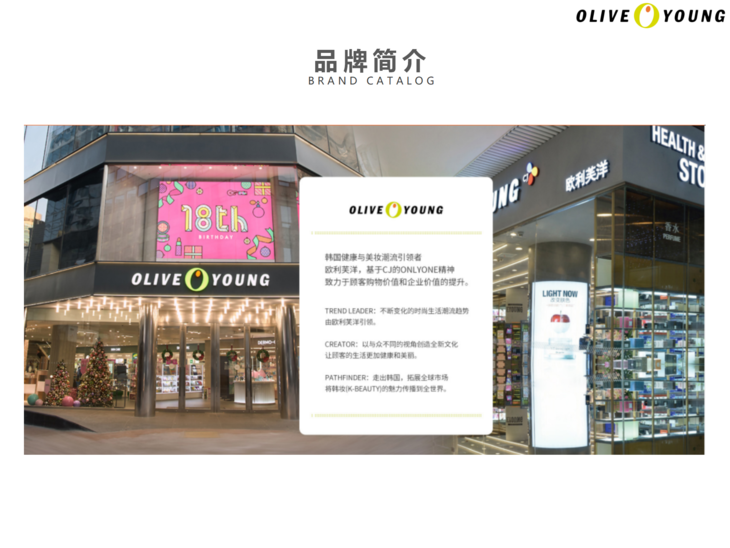 韩国健康与美妆潮流引领者欧利芙洋 基于CJ的ONLYONE精神致力于顾客购物价值和企业价值的提升 TRENDLEADER:不断变化的时尚生活潮流趋势由欧利芙洋引领。 CREATOR:以与众不同的视角创造全新文化让顾客的生活更加健康和美丽。 PATHFINDER:走出韩国,拓展全球市场将韩妆(K-BEAUTY)的魅力传播到全世界。