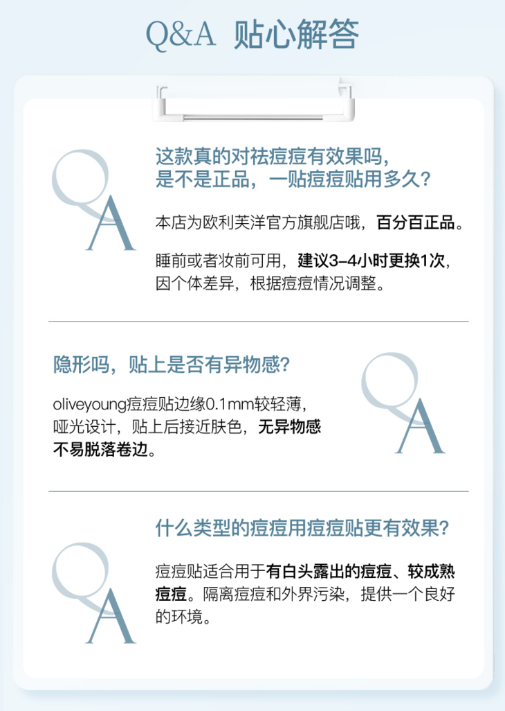 ✅产品介绍 欧利芙洋痘痘粘贴膜 产品功效:有效祛痘、隔离彩妆、不留痘印 主要成分:亲水性水凝胶💦