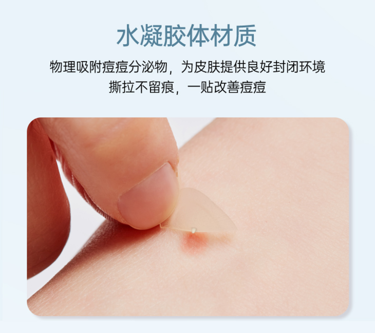 ✨贴心设计 安心呵护✨ 👉水凝胶体材质 物理吸附痘痘分泌物 为皮肤修护提供良好封闭环境 撕拉不留痕 一贴改善痘痘