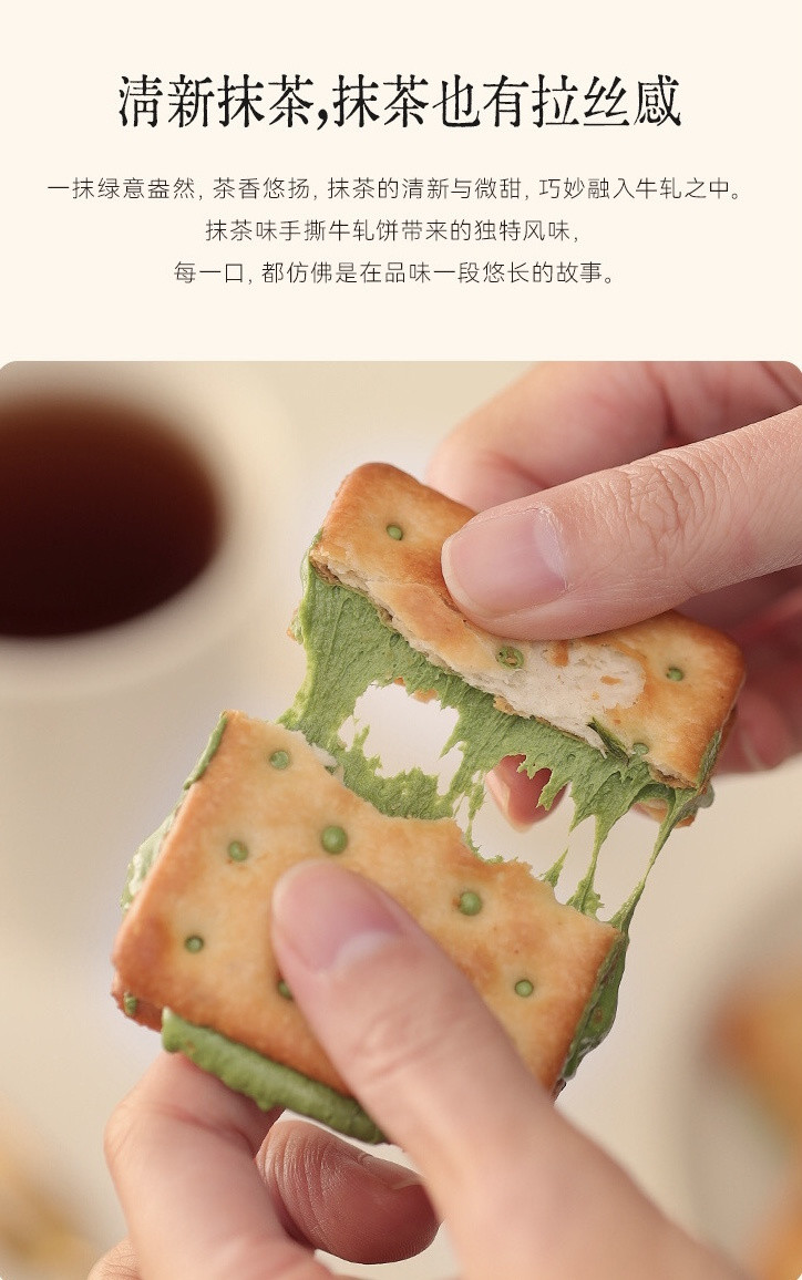 浓郁独特的清苦感——【抹茶味】 当绵软拉丝的牛轧遇上清新抹茶 简直是抹茶脑袋们的甜蜜救赎 精心添加了≥4%的顶级抹茶粉 掰开像被一片翠绿的茶田紧紧包围 浓郁的抹茶香气瞬间在口腔中爆发 清苦中带着丝丝甘甜,仿佛能够净化心灵 带你穿越到那个宁静致远的抹茶世界里