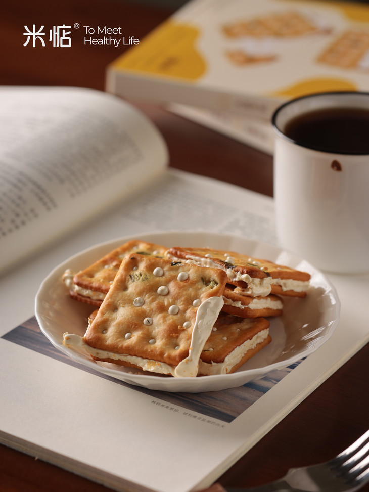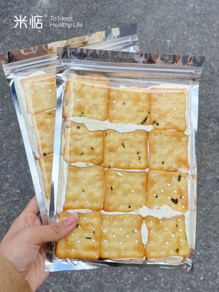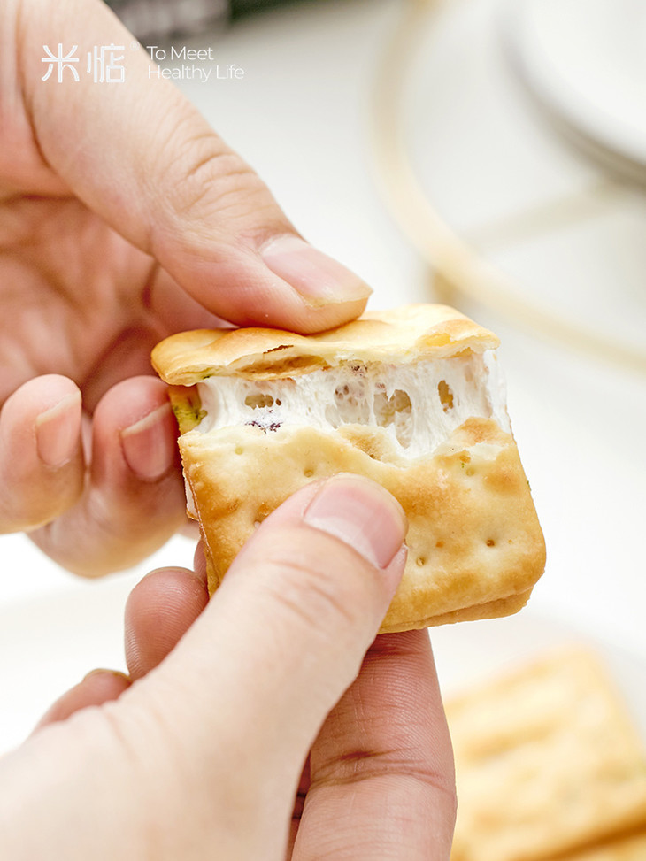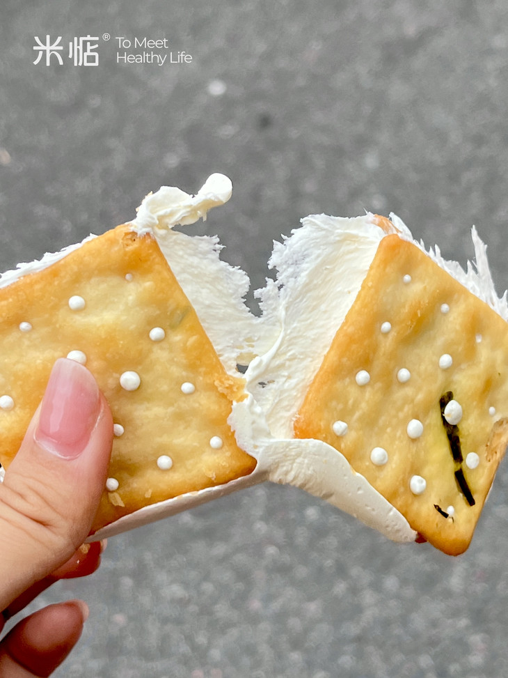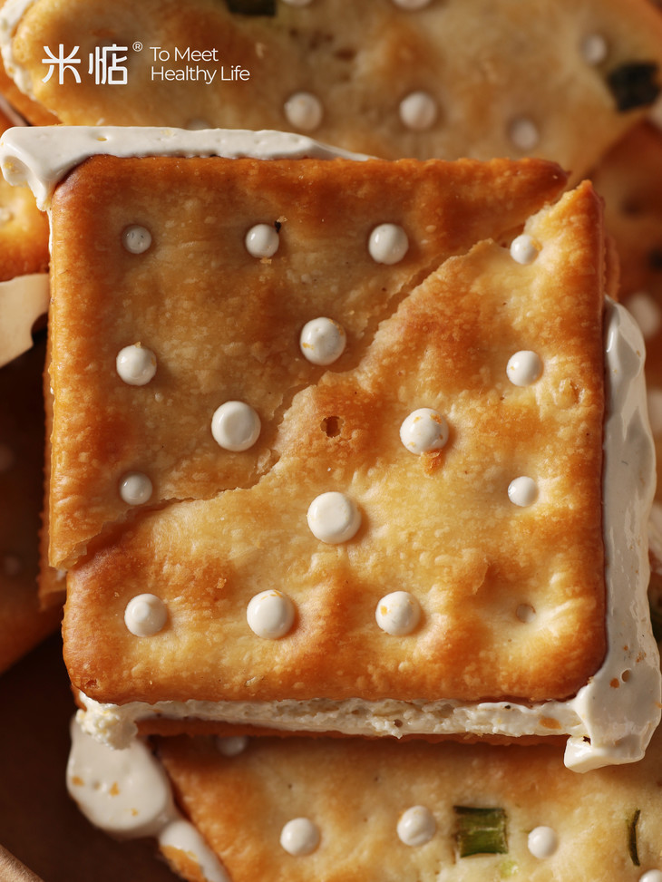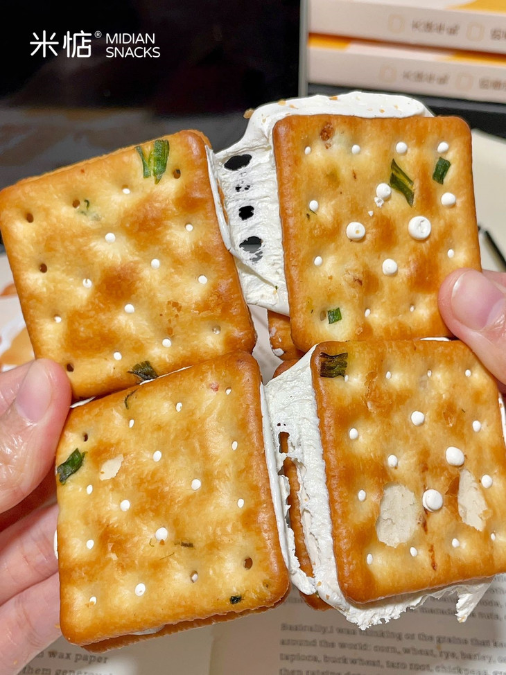 牛轧+饼干+果干制成的雪花酥大家肯定不陌生 但是把拉丝的牛轧夹在酥脆葱香的饼干中间🥞 应该还有小伙伴没有尝试过❓ 葱花点缀着层层起酥的苏打饼干 一咬下去香气瞬间被激发☁️ 外壳酥脆内陷柔软的强烈反差实在特别了 唇齿舌尖就像在开早会的小精灵🧚🏻♂️ 纷纷好奇的询问:是什么如此美味?