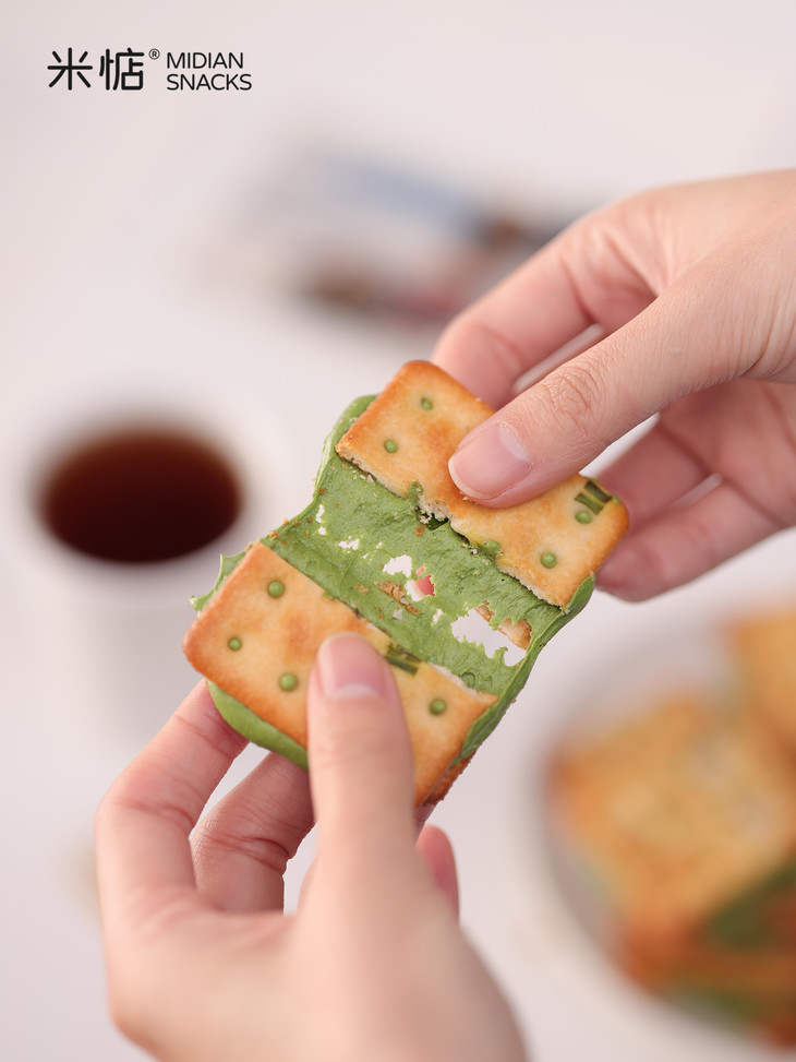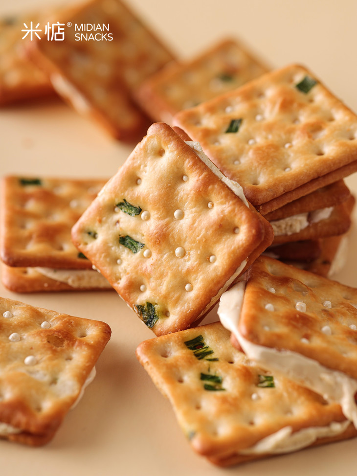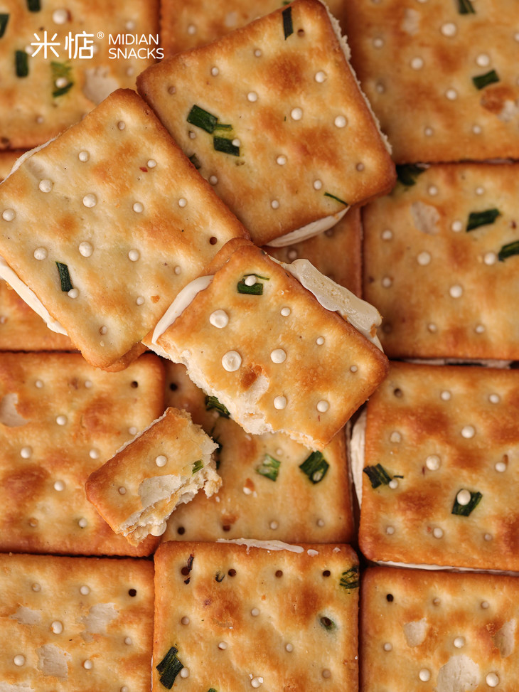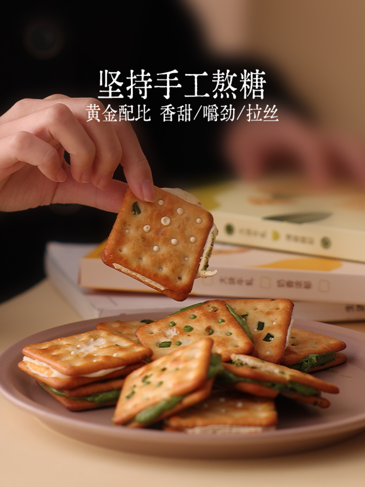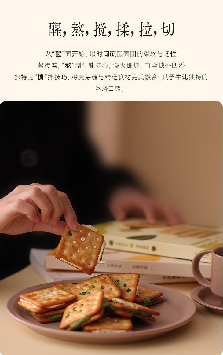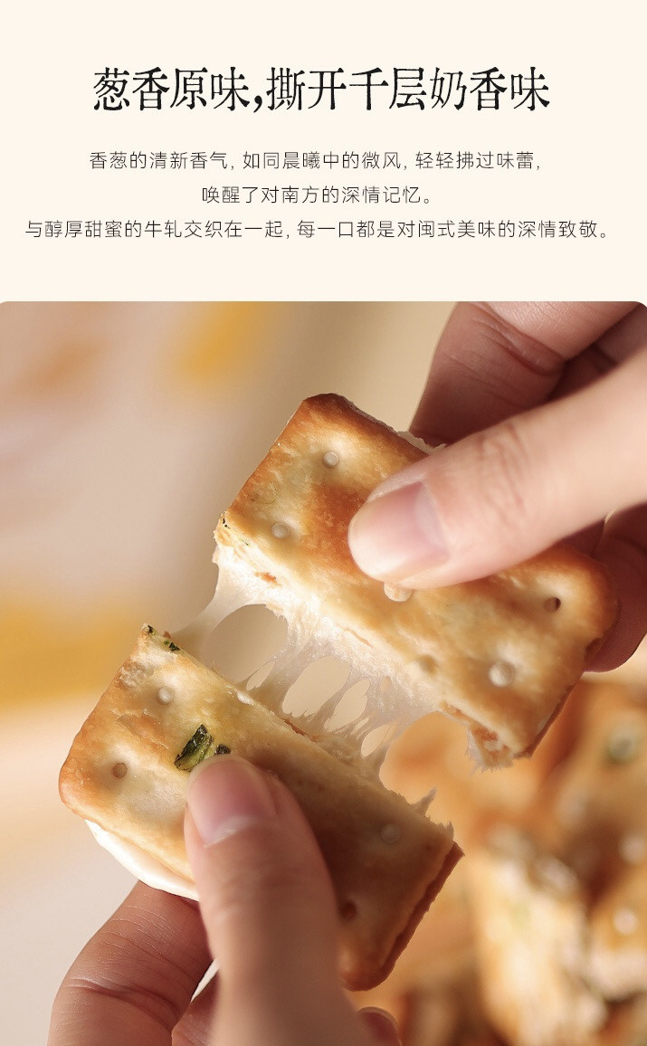 咸甜党的爱——【香葱原味】 仔细一看,你可以发现香葱饼干的表面 还点缀着零零星星的晶莹细盐🧂 直接给口感拔高好几个水准! 细盐不仅能中和牛轧的甜也能刺激和打开 探索美食的欲望和味蕾👄 当你咀嚼甜甜牛轧糖,葱香四溢的苏打饼干 这层隐隐约约的咸,便会如期而至~