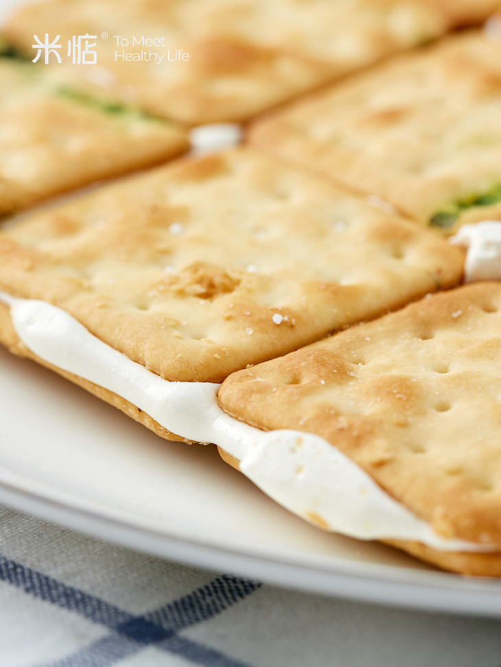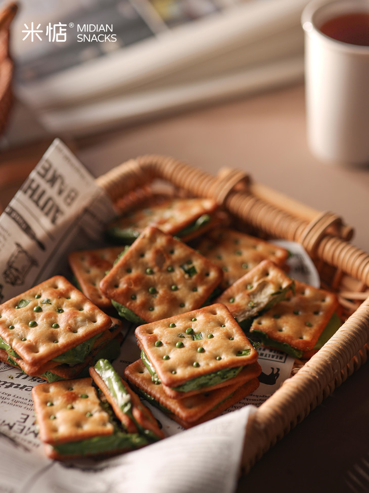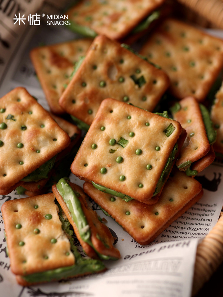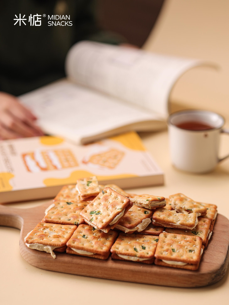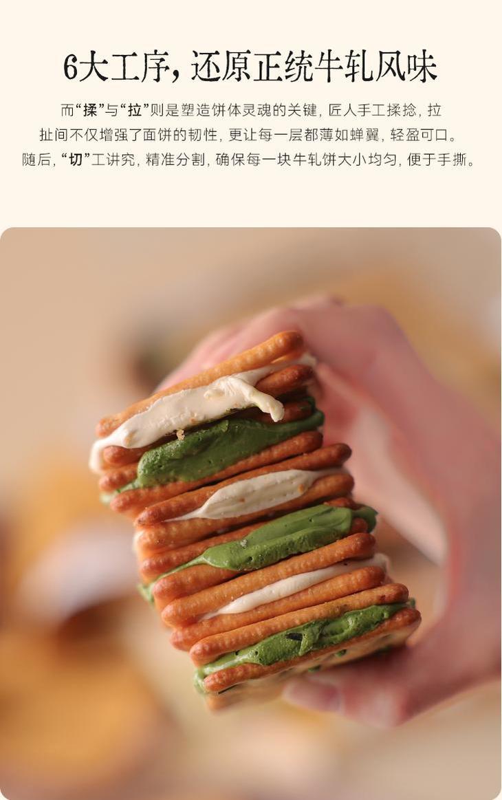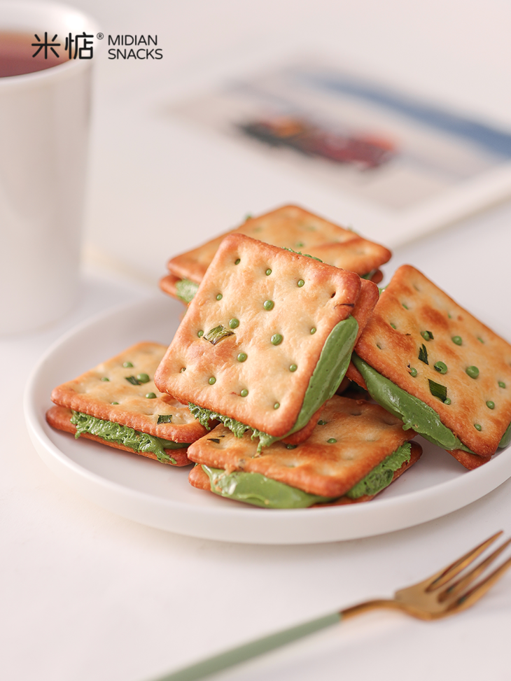 咸甜党的爱——【香葱原味】 仔细一看,你可以发现香葱饼干的表面 还点缀着零零星星的晶莹细盐🧂 直接给口感拔高好几个水准! 细盐不仅能中和牛轧的甜也能刺激和打开 探索美食的欲望和味蕾👄 当你咀嚼甜甜牛轧糖,葱香四溢的苏打饼干 这层隐隐约约的咸,便会如期而至~