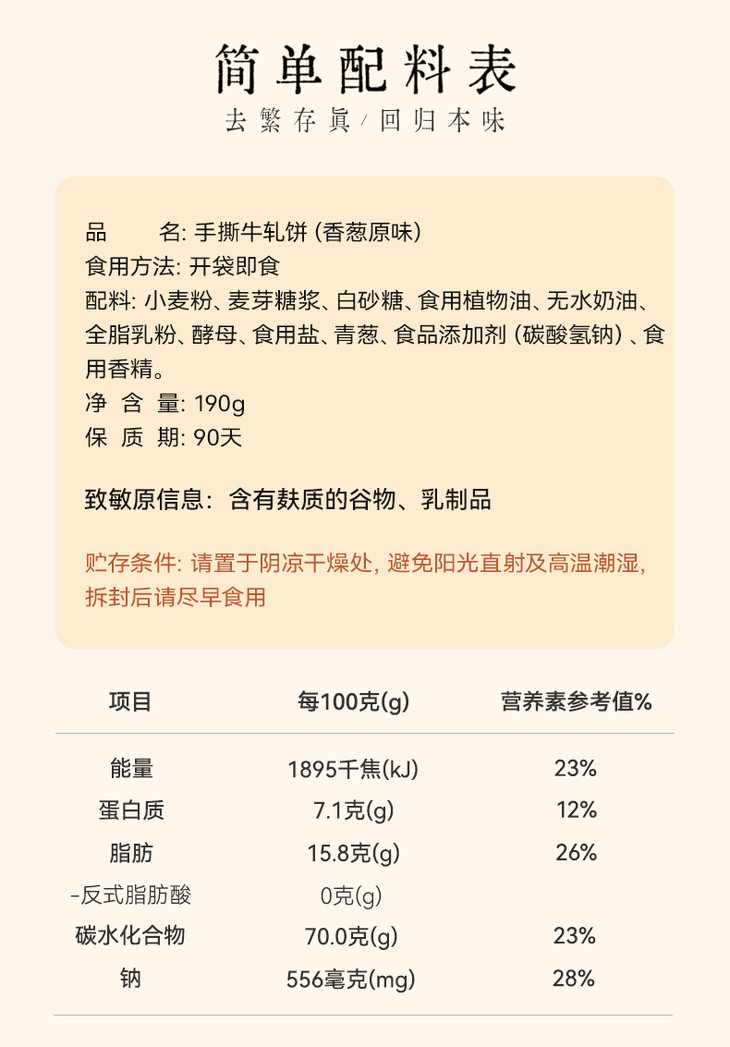 【品名】:手撕牛轧饼 【规格】:190g 【保质期】:3个月 【生产日期】最新日期 【香葱原味配料表】:小麦粉、麦芽糖浆、白砂糖、食用植物油、无水奶油、全脂乳粉、酵母、食用盐、青葱、食品添加剂(碳酸氢钠)、食用香精 【抹茶味配料表】:小麦粉、麦芽糖浆、白砂糖、食用植物油、鸡蛋清、无水奶油、全脂乳粉、酵母、食用盐、青葱、抹茶粉、食品添加剂(碳酸氢钠)、食用香精。 【储存方式】:请置于阴凉干燥处,避免阳光直射及高温潮湿,拆封后请尽快食用 【发货地】:福建漳州 【发货时效】:72小时内发出 【发货快递】:中通、申通随机发不指定 【补运费地区】:北京,上海➕一元,甘肃、内蒙古、宁夏运费加14元,青海、新疆、西藏运费加16元。 【致敏物提醒】:含有麸质的谷物及其制品、乳类及其制品 【温馨提示】:本产品夏秋夹心较软,春冬夹心较硬,夹心较硬可放微波炉10秒,提升口感。 【售后说明】: 1、食品无质量问题不支持 7 天无理由退换。 2、产品少发、漏发,质量问题,请提供产品连同快递单(需看见单号)一起拍照24 小时内发给客服核实处理。 3、如包裹破损、挤压严重请拍照签收,签单破损签收,请在签收48小时内拍照联系客服处理。 4、产品已经发出的情况下,不建议更改地址、不退货,下单前,请仔细核对信息!货物产生物流单号,无法拦截,如需改地址、拦截须支付快递费用。 5、订单产生单号后,拦截需收费4元,改地址3元,偏远六省(新疆、西藏、内蒙古、宁夏、青海、甘肃)按实际产生运费收取。
