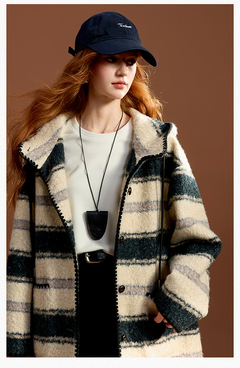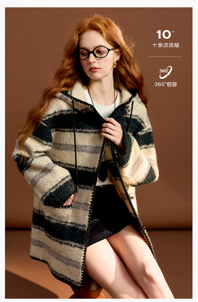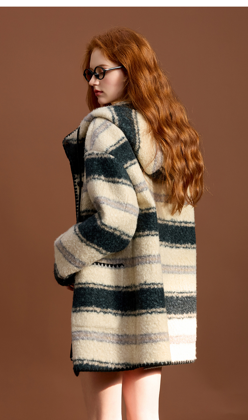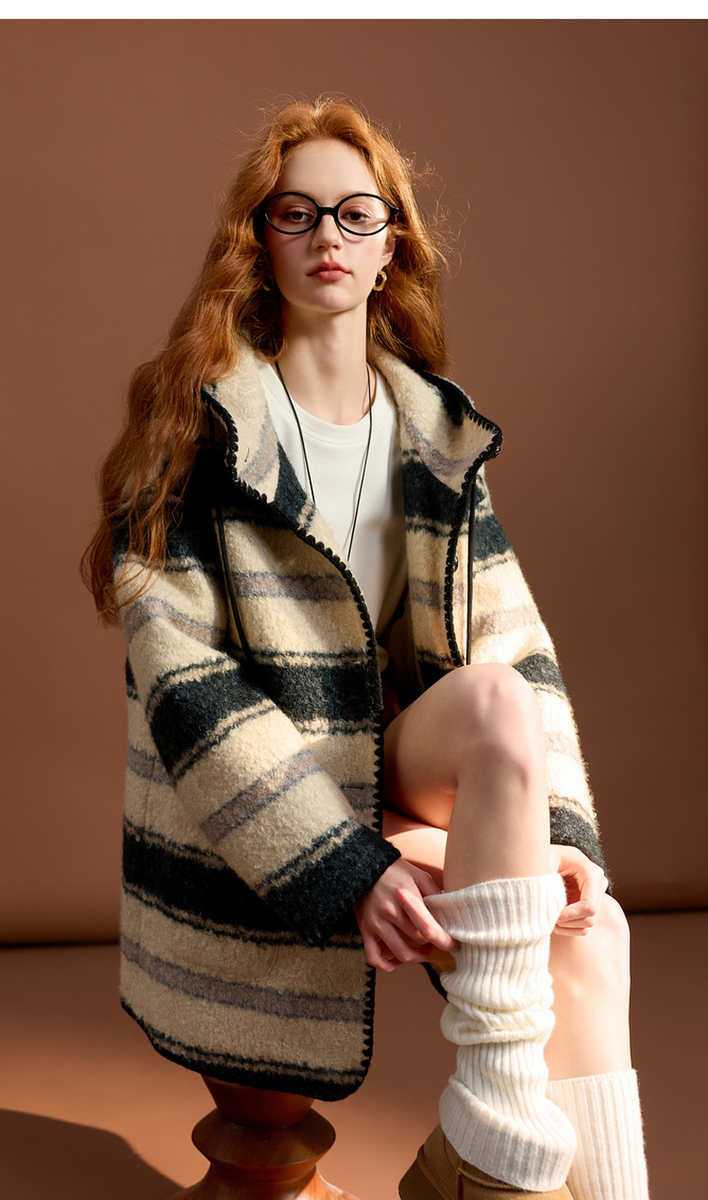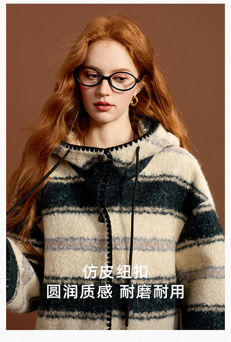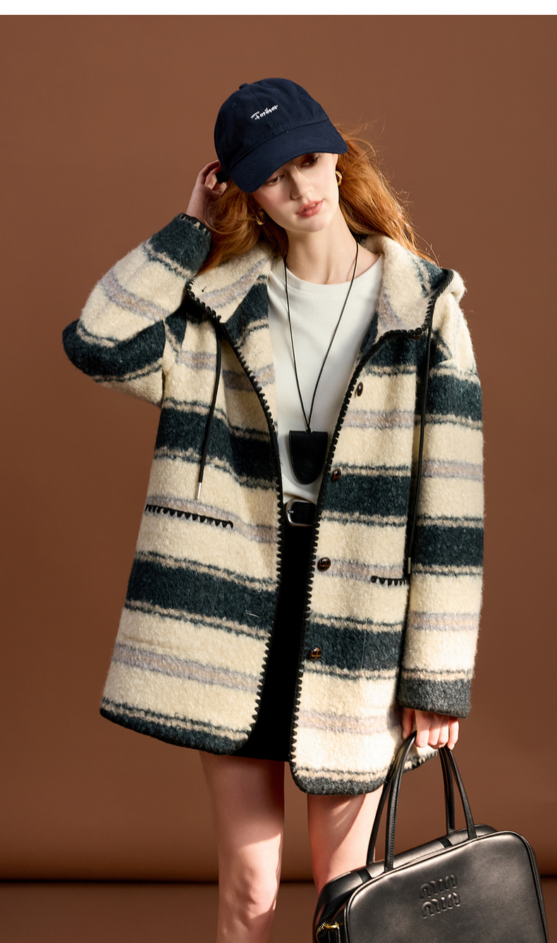三彩2025冬季新款连帽条纹大衣毛呢外套中长宽松休闲复古M