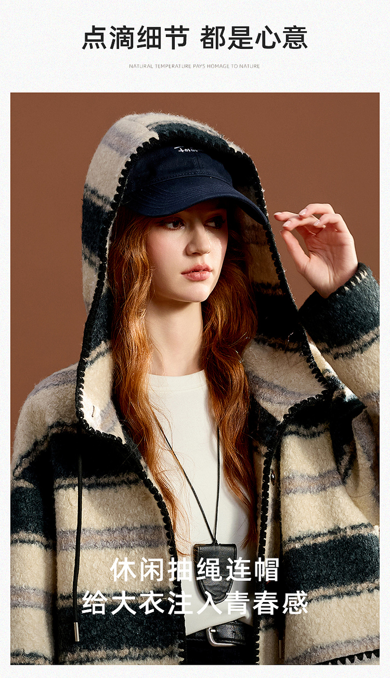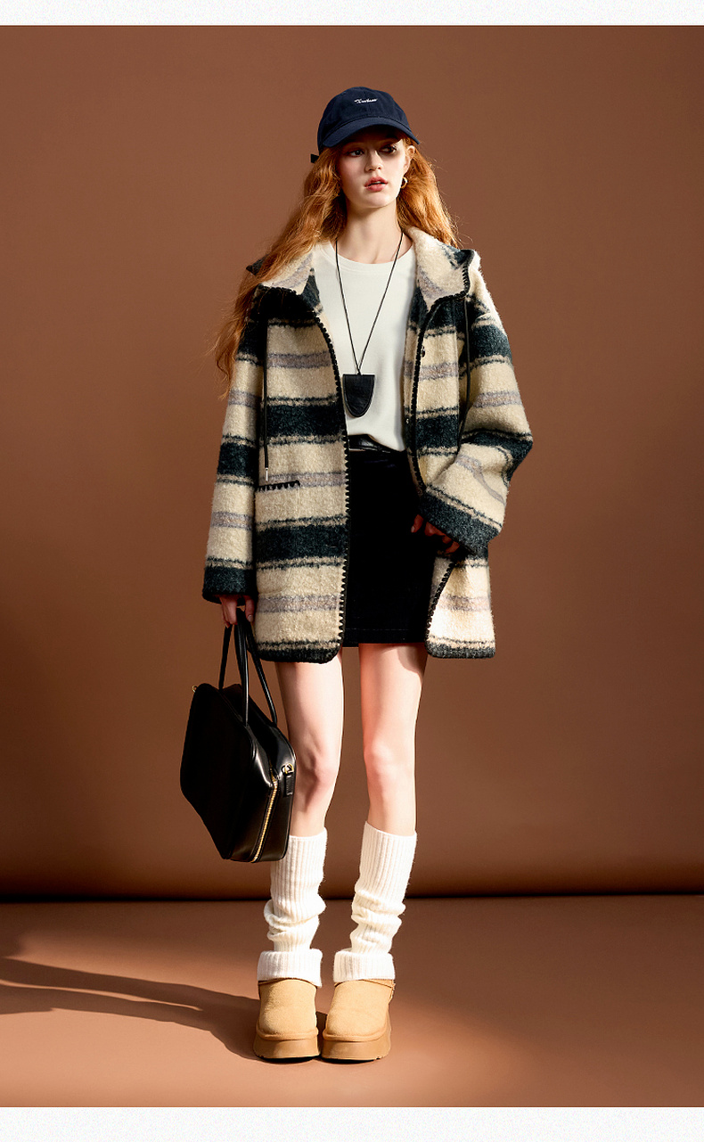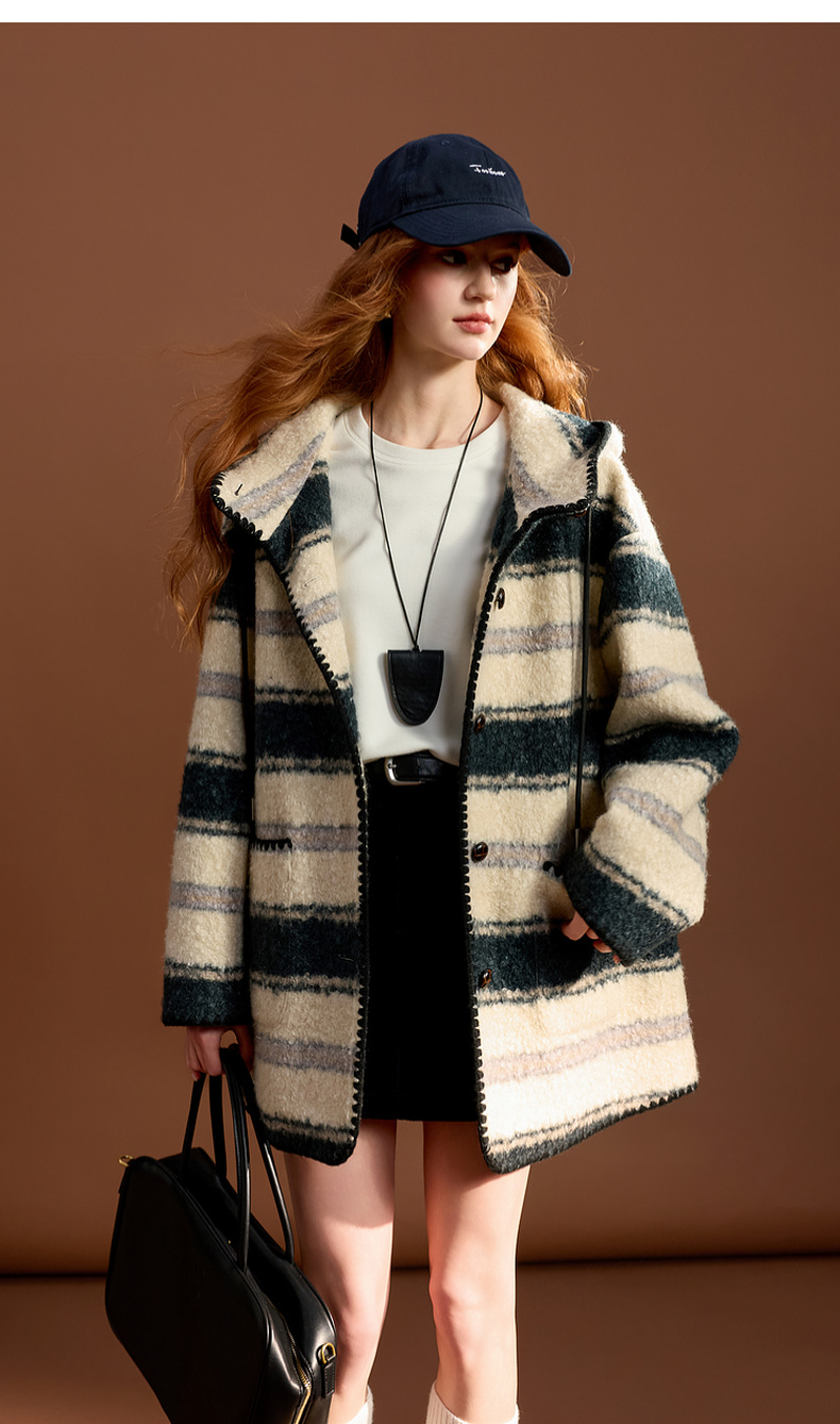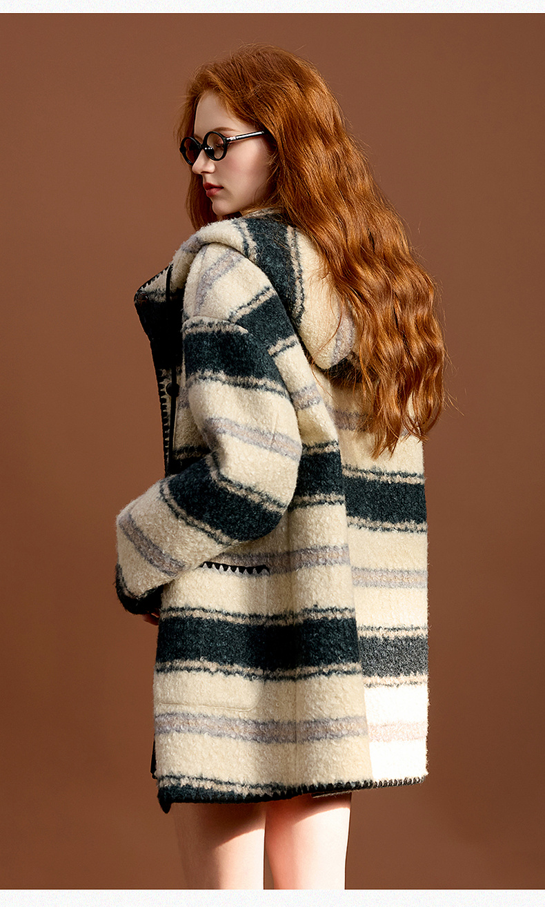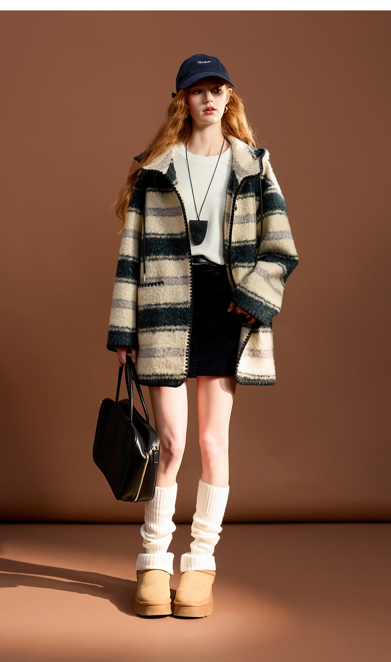 三彩2025冬季新款连帽条纹大衣毛呢外套中长宽松休闲复古M