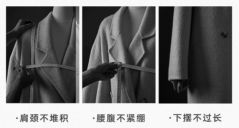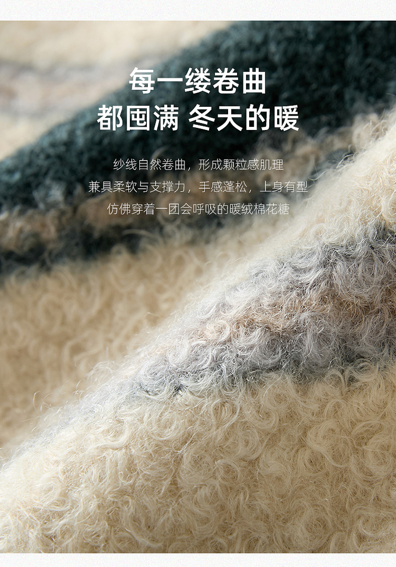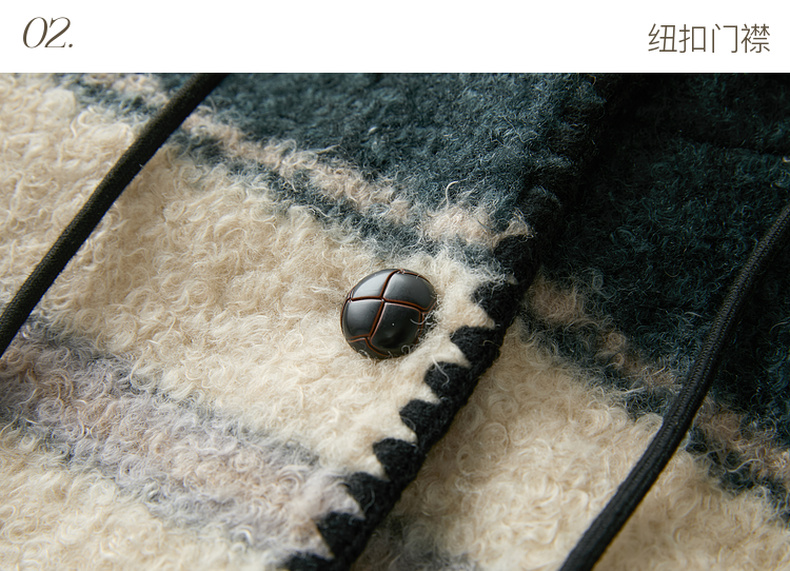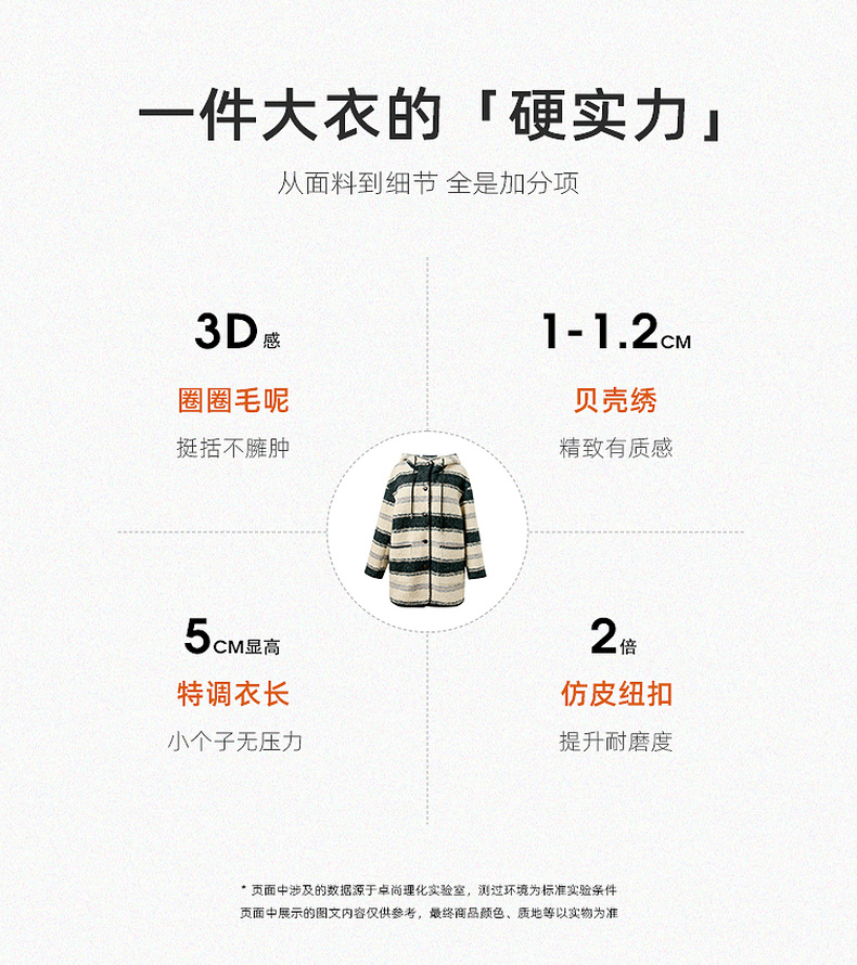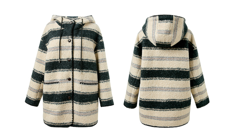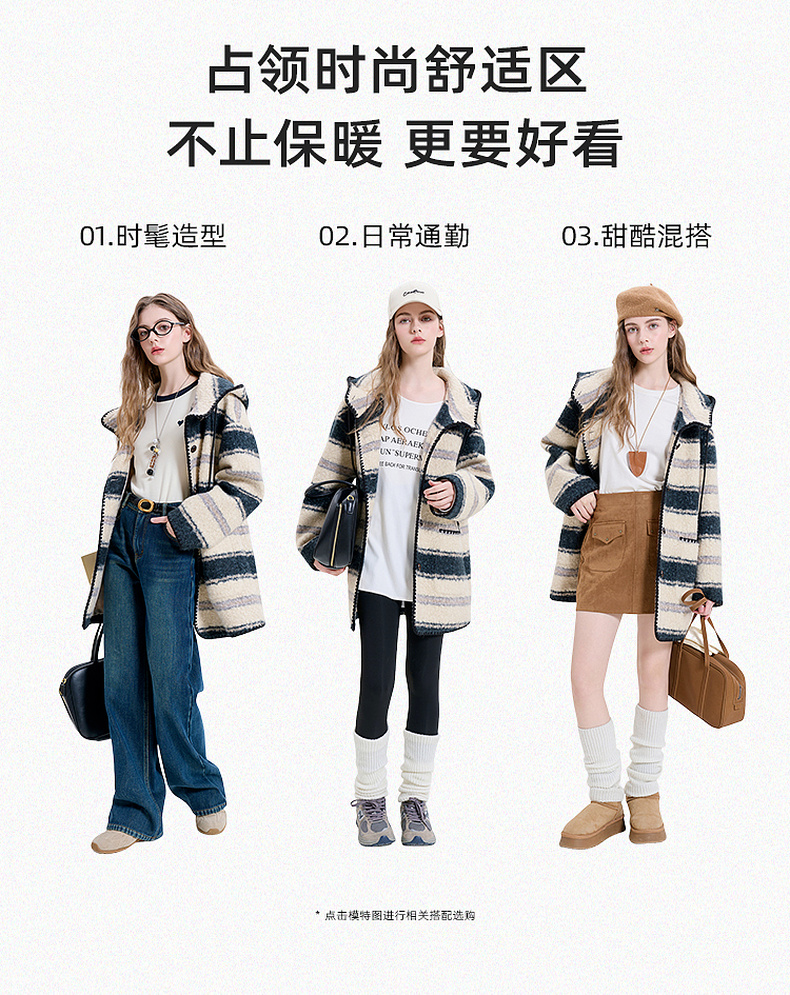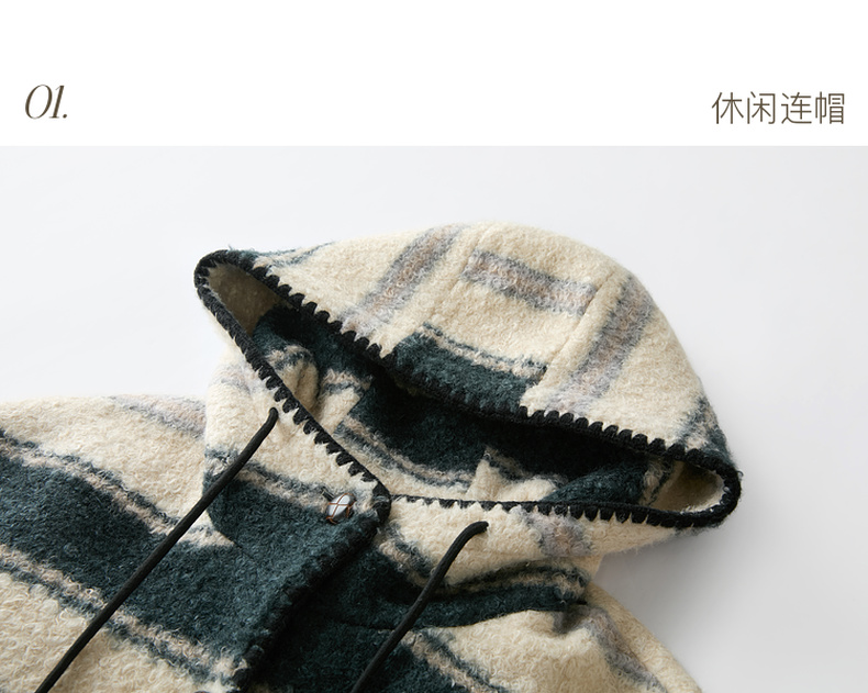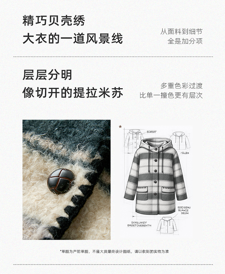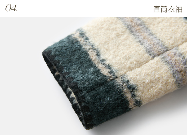 三彩2025冬季新款连帽条纹大衣毛呢外套中长宽松休闲复古M
