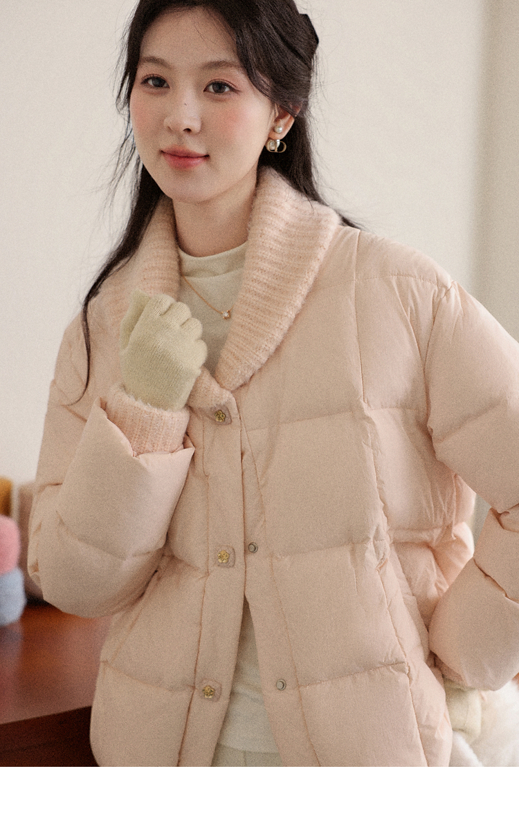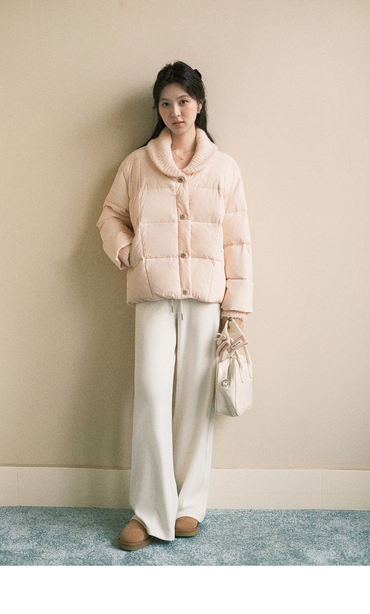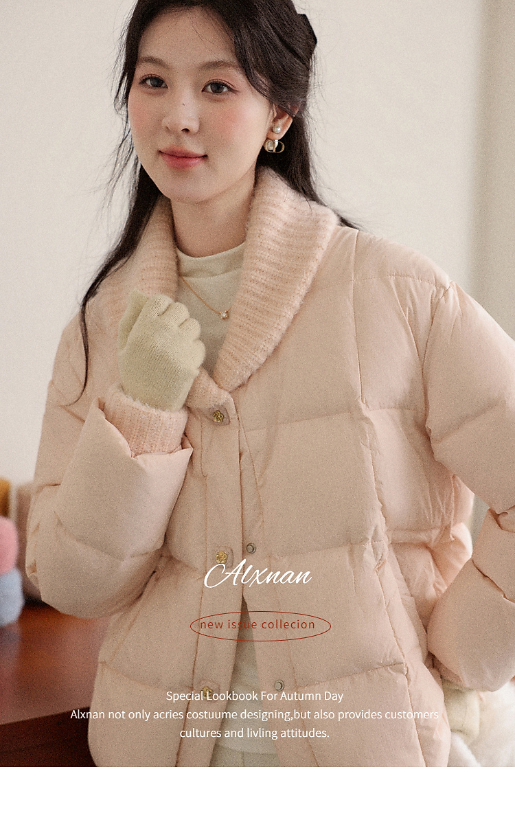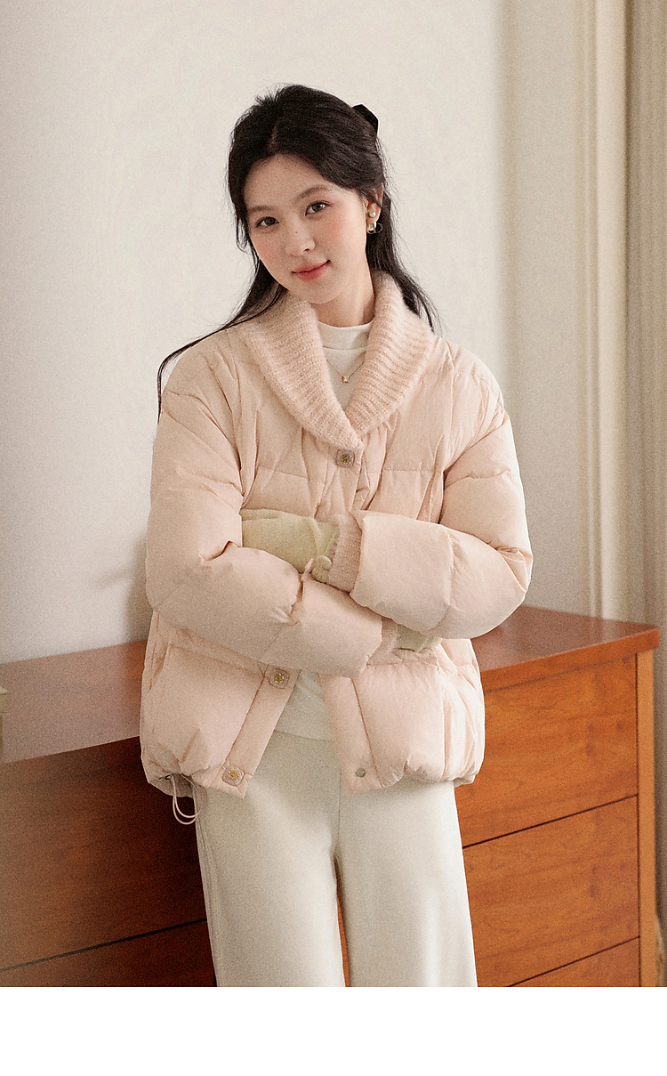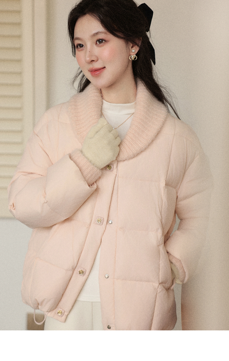 鹿向南「雅俏栗绒」粉色短款针织领羽绒服女秋冬宽松气质保暖外套