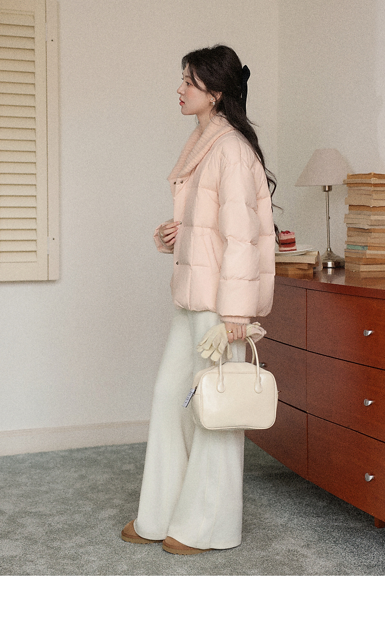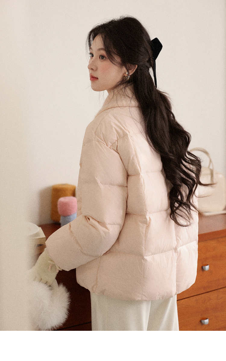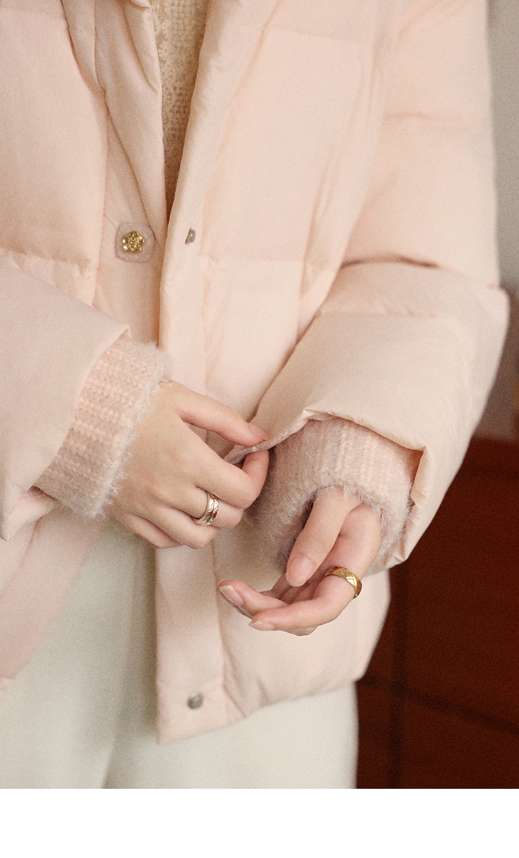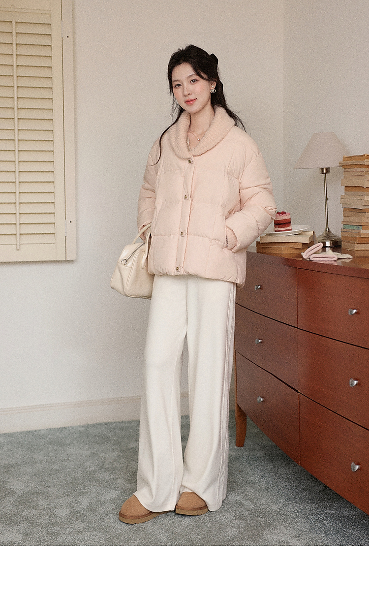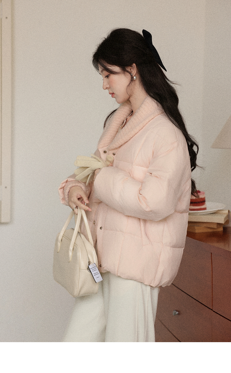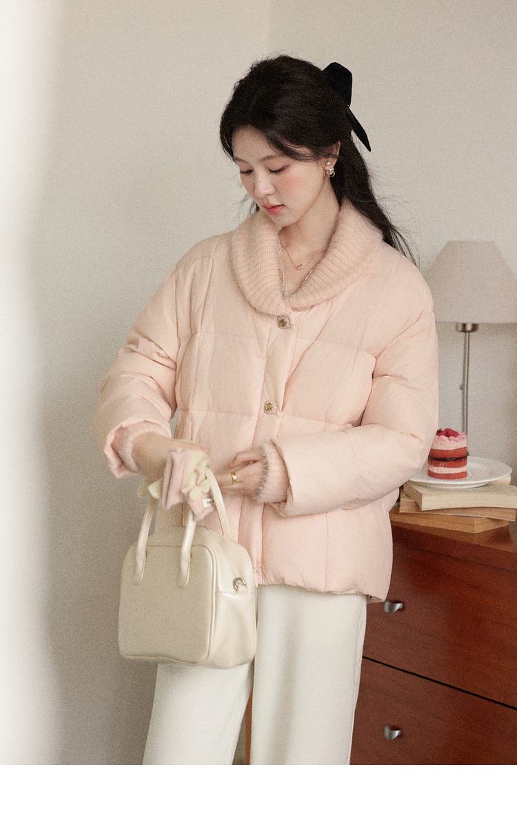 鹿向南「雅俏栗绒」粉色短款针织领羽绒服女秋冬宽松气质保暖外套