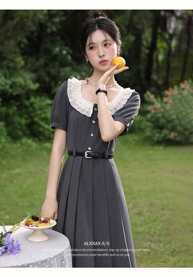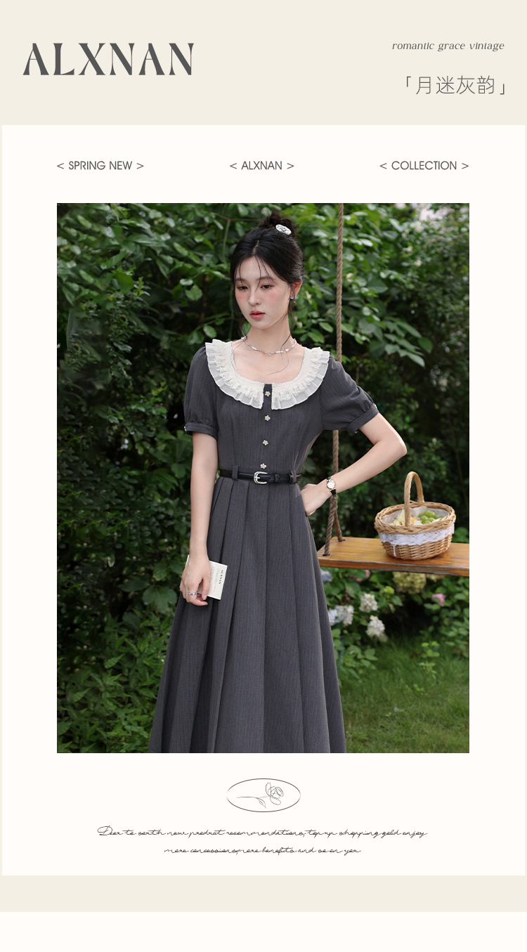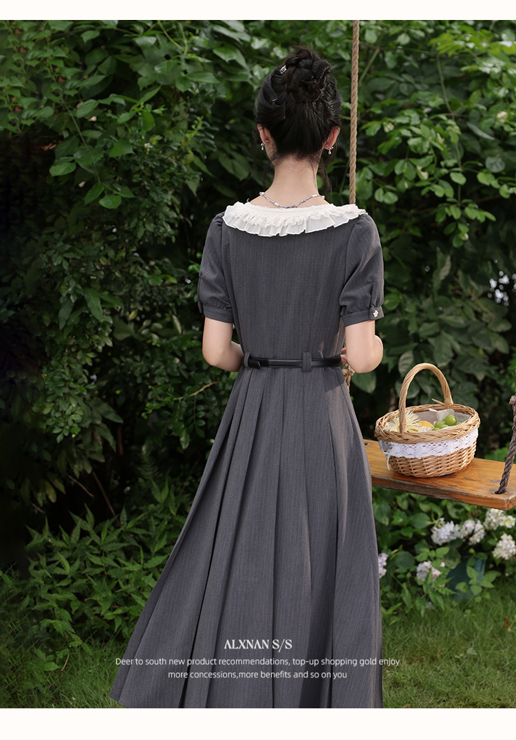 【65折秒杀】鹿向南「月迷灰韵」法式连衣裙女夏季小个子灰色短袖长款百褶裙L560109