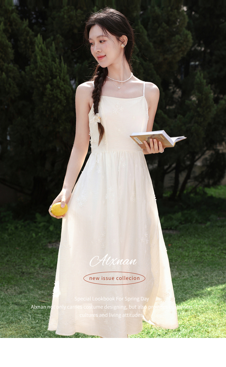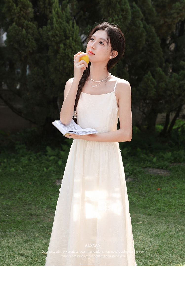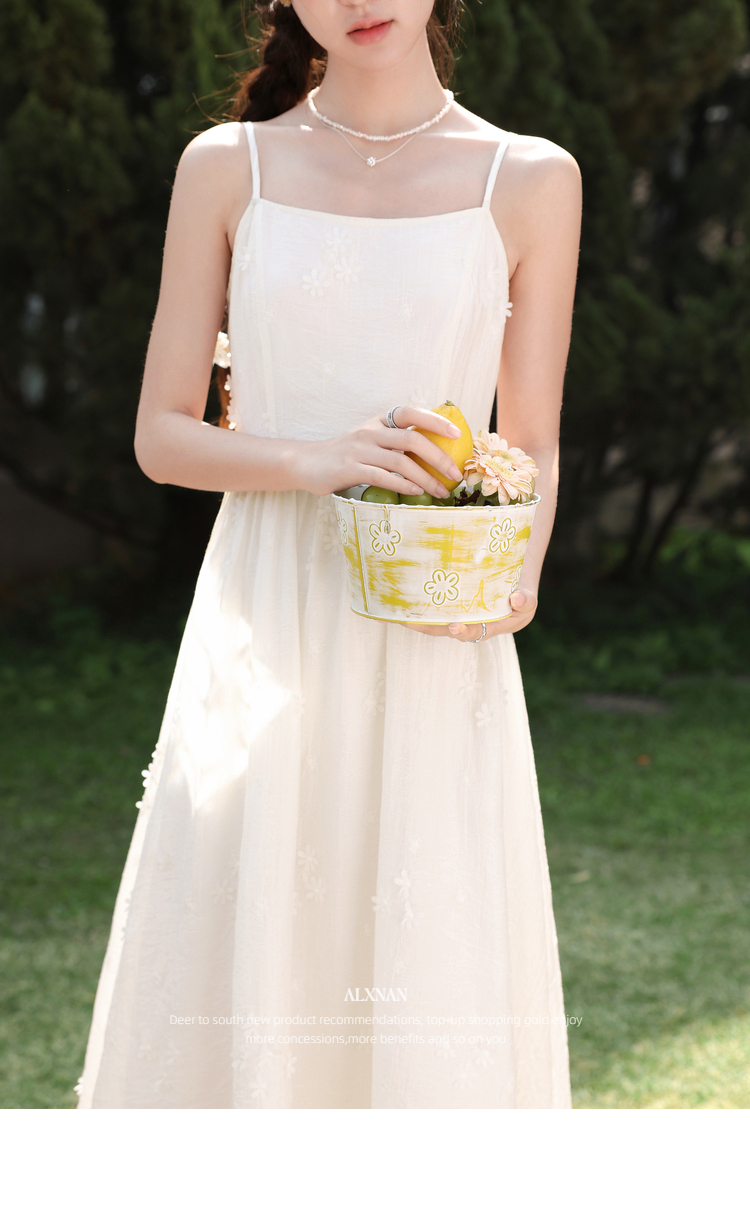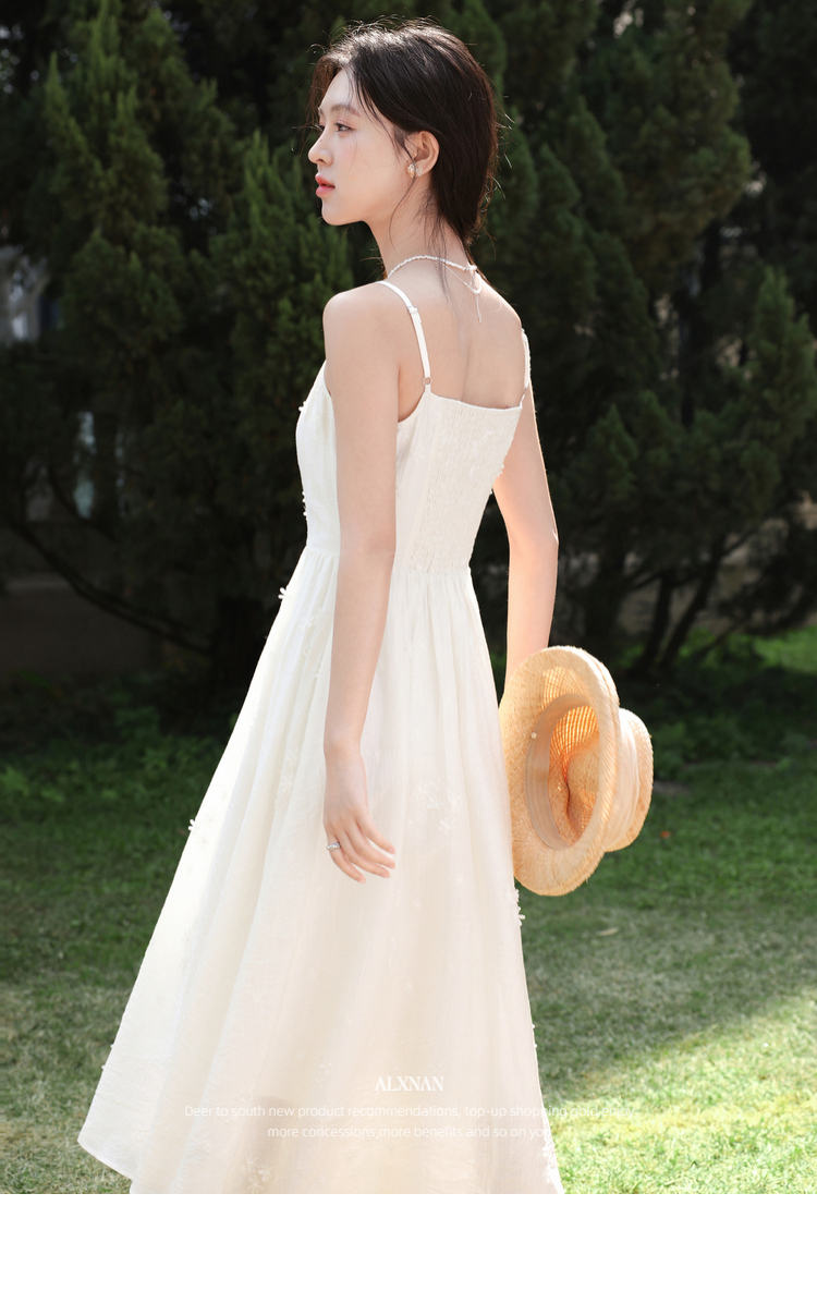鹿向南「云深茶白」米白色法式吊带连衣裙女春季海边度假收腰长裙