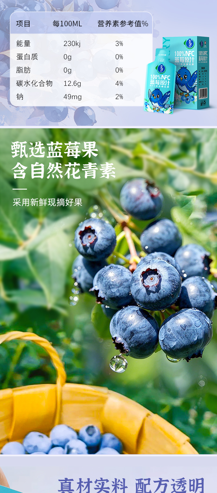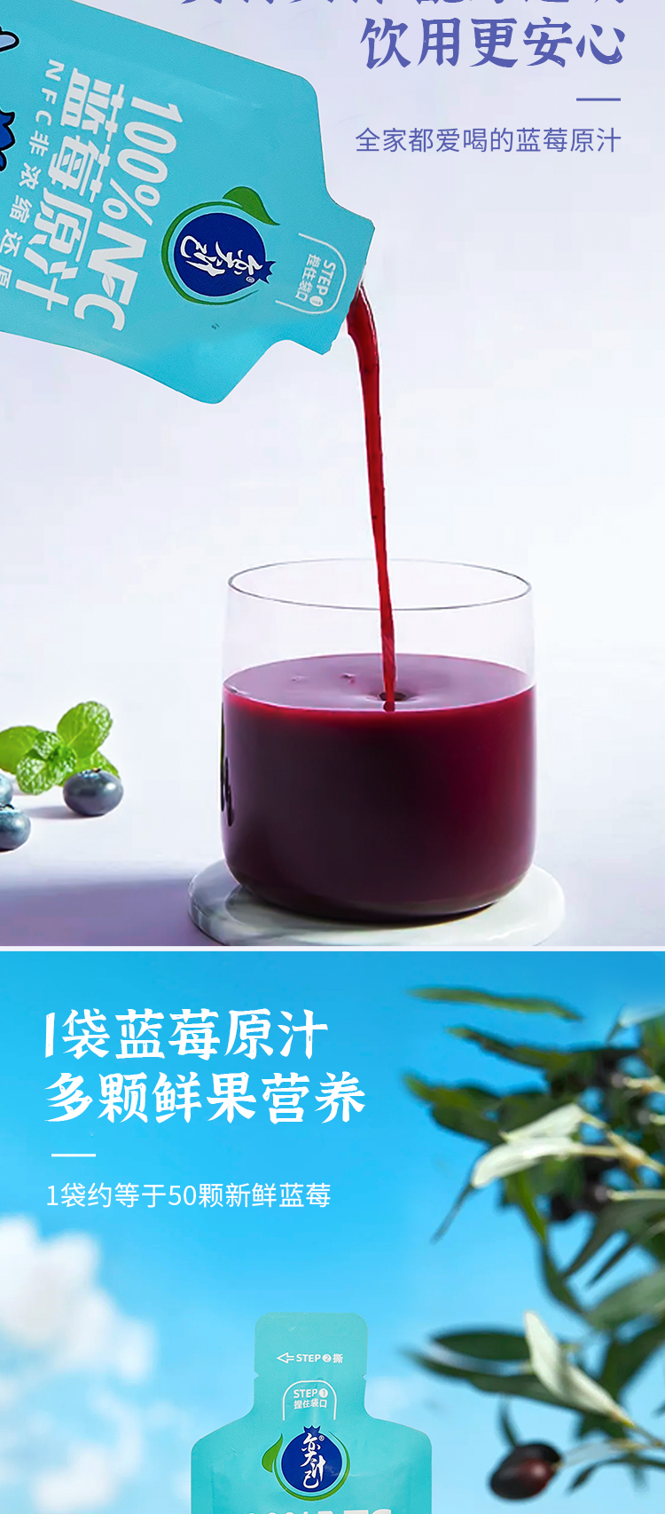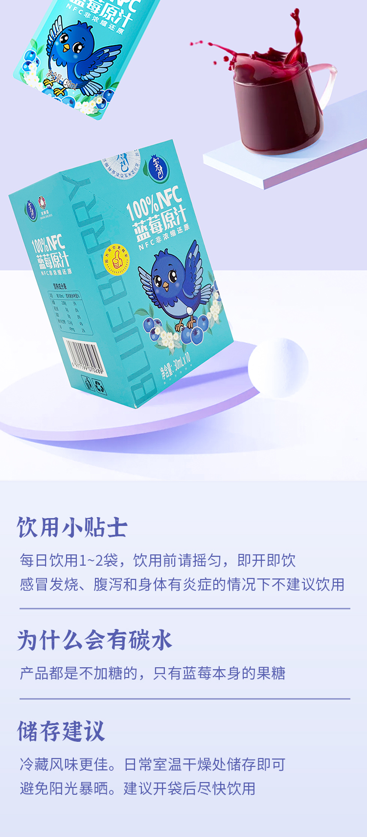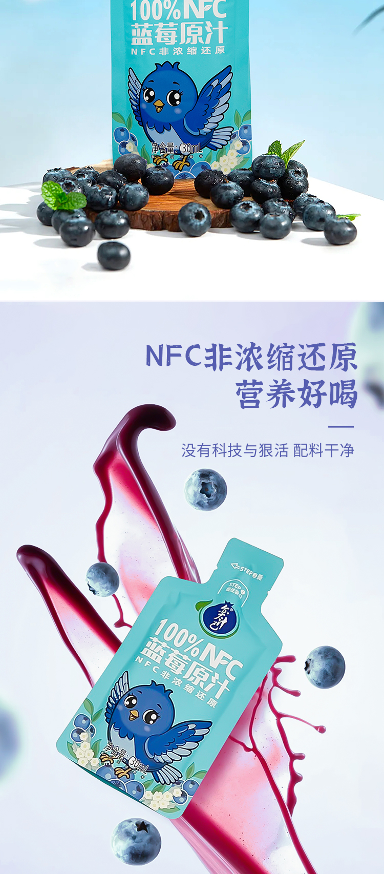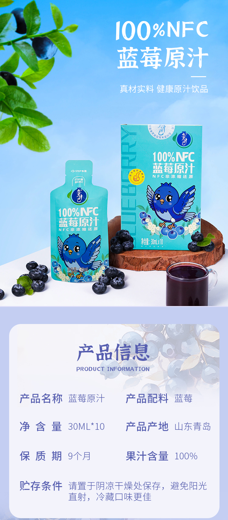 【奕汁己】北川奕米蓝莓汁 非浓缩原浆饮料 蓝莓原汁NFC花青素果汁30ML*10袋