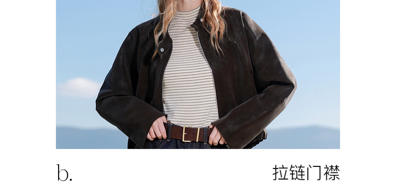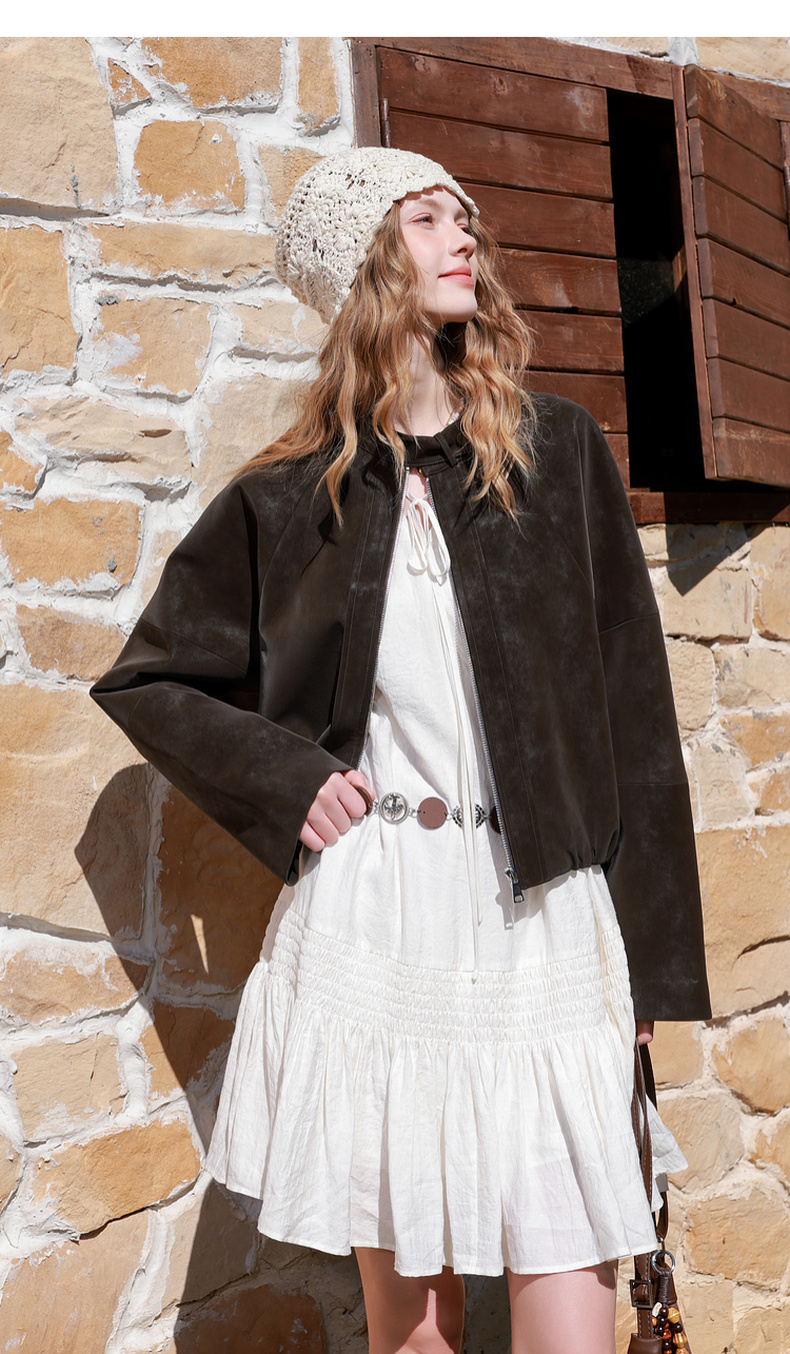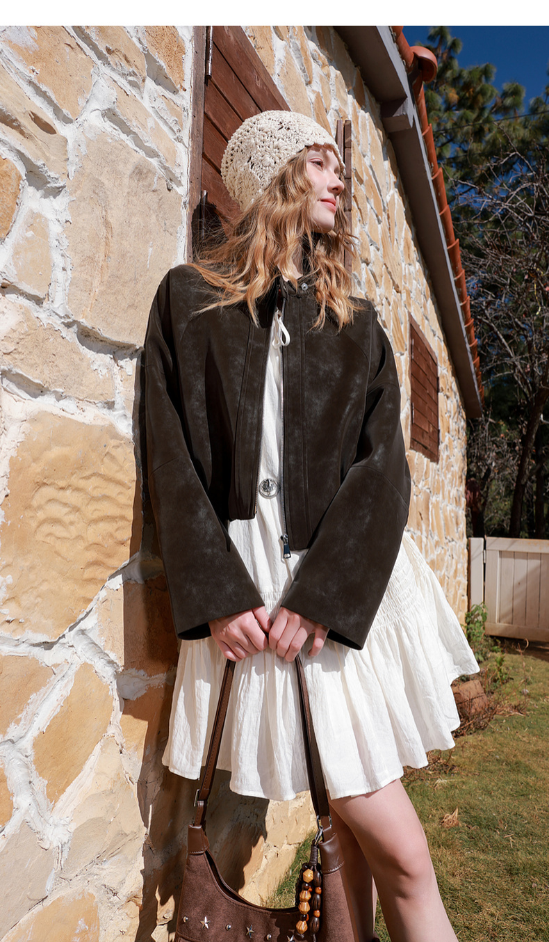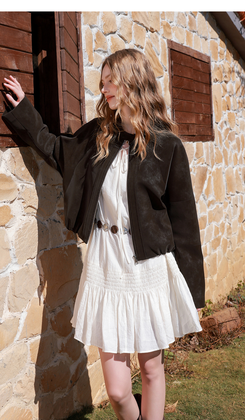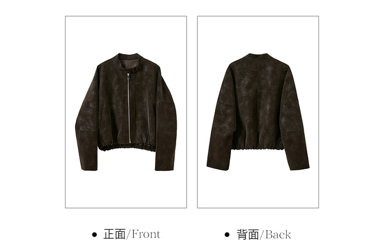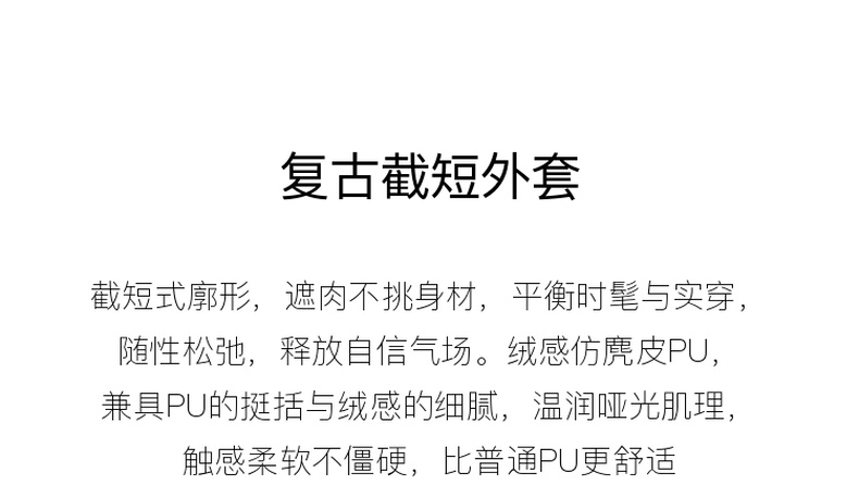 三彩2026春季新款绒感仿麂皮PU长袖外套夹克开衫短款宽松休闲M