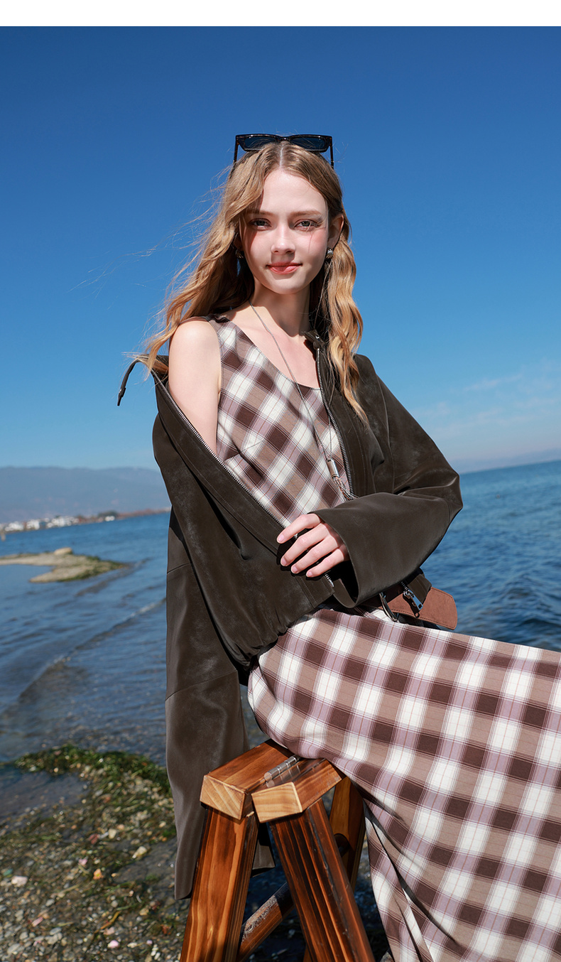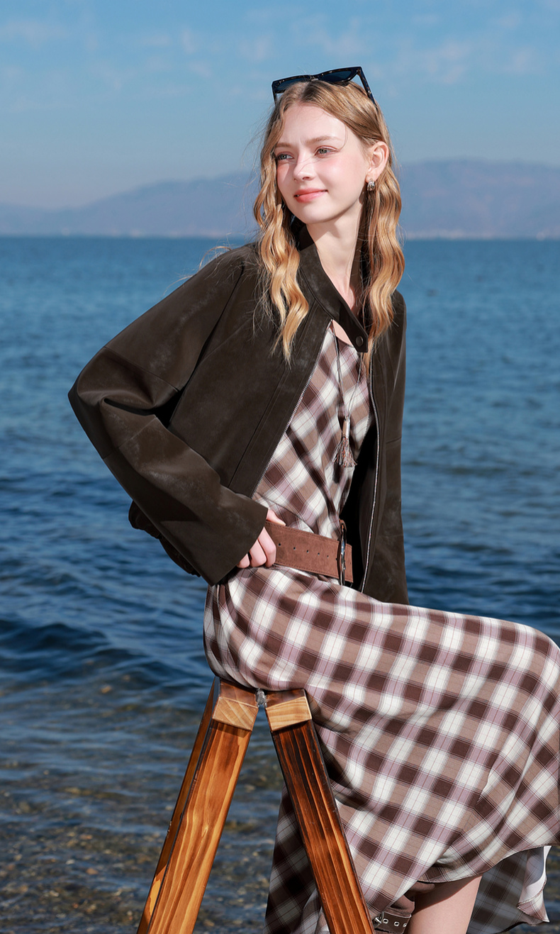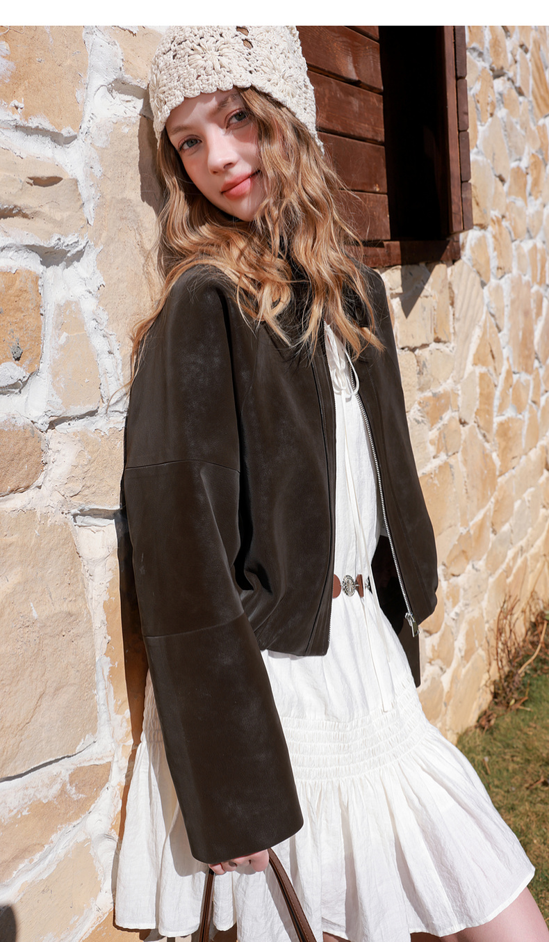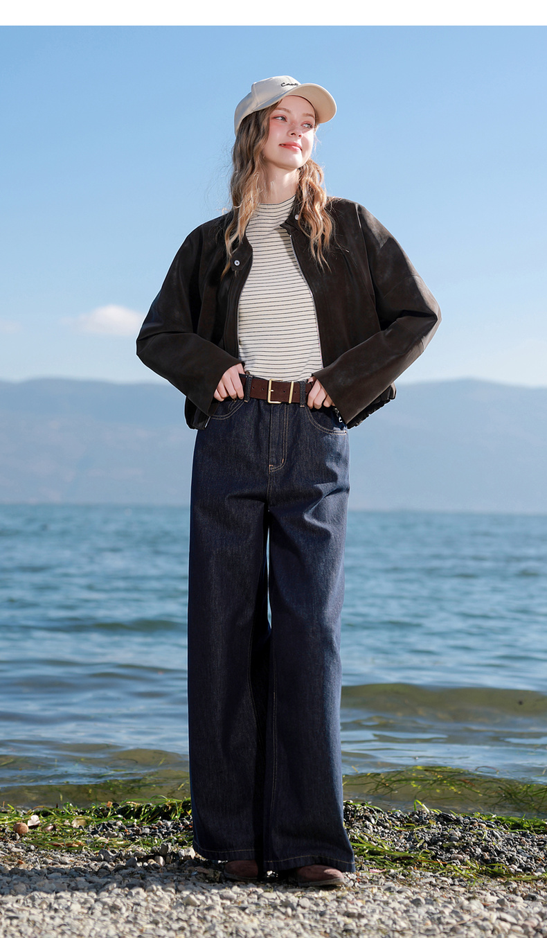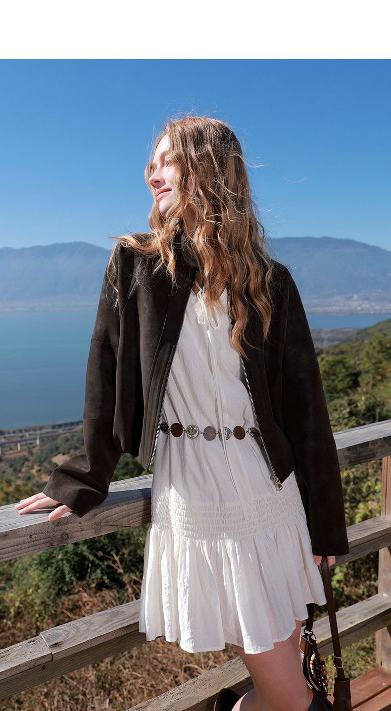 三彩2026春季新款绒感仿麂皮PU长袖外套夹克开衫短款宽松休闲M