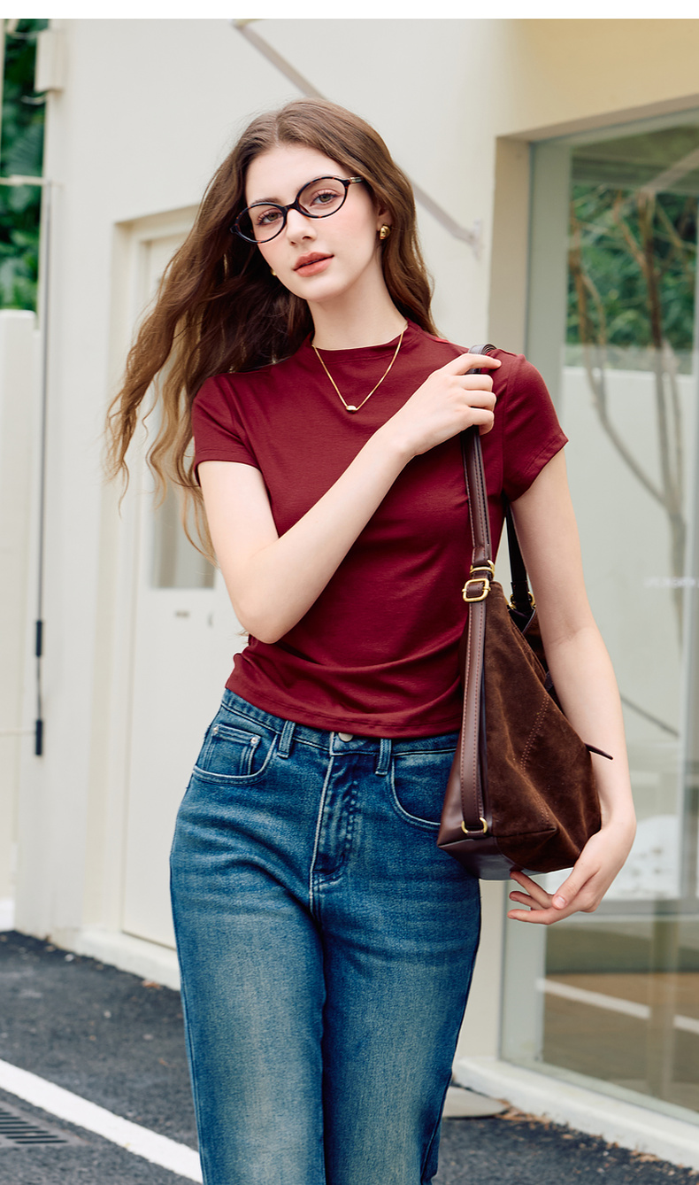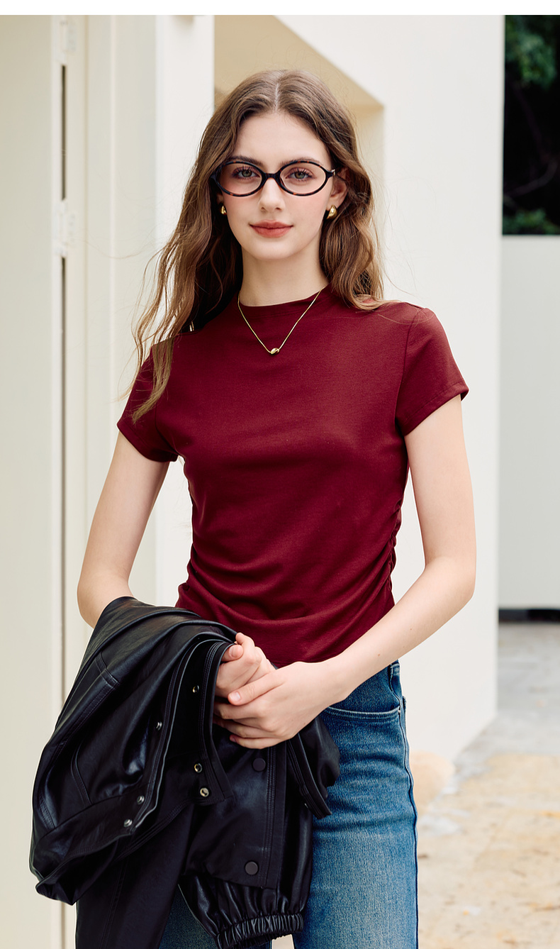 【莱赛尔】三彩2026春季新款T恤半高领正肩短袖上衣打底修身M