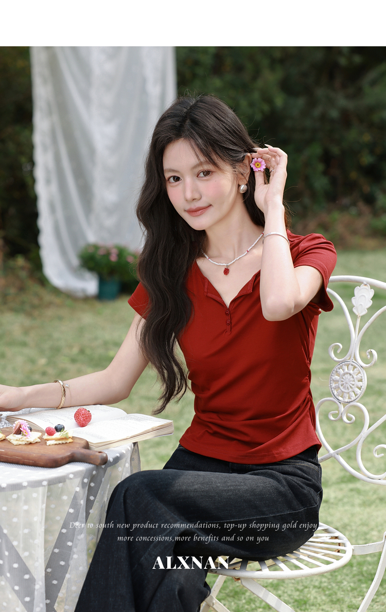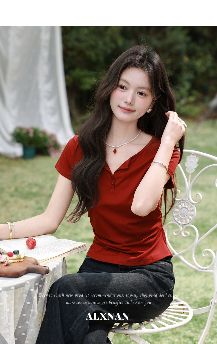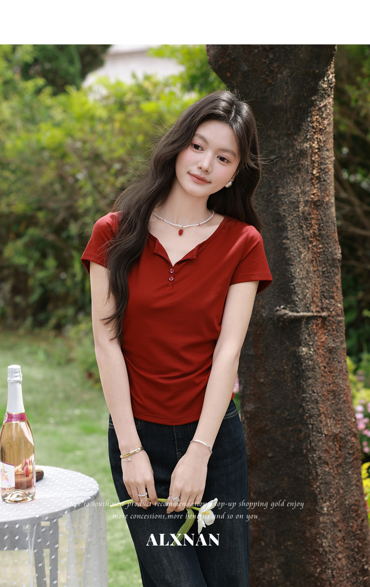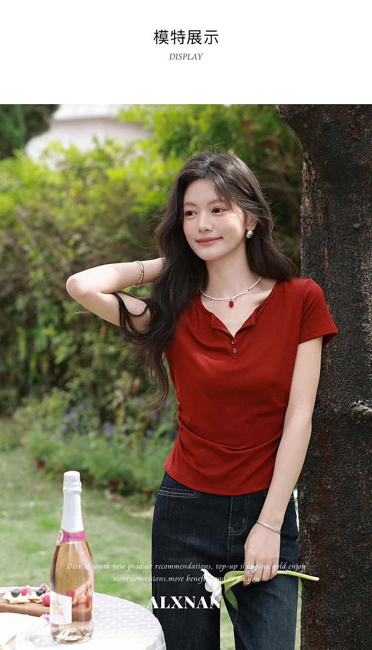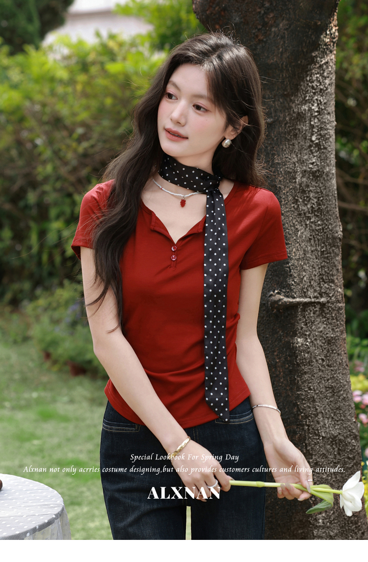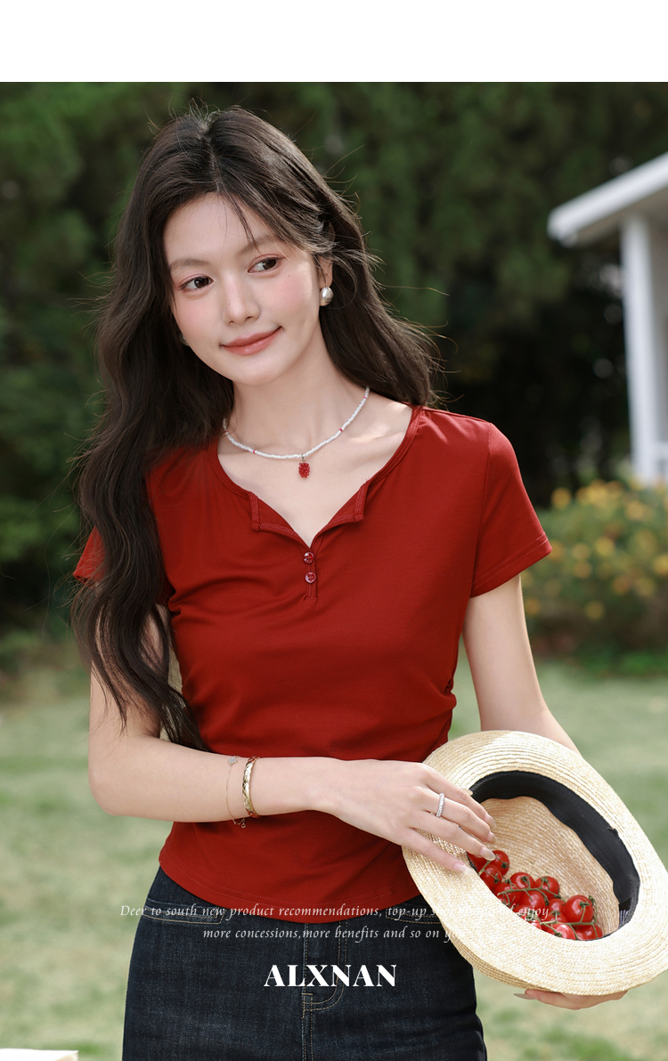 鹿向南「落日玫瑰」复古红色收腰显瘦短袖T恤女夏巨好看小众上衣