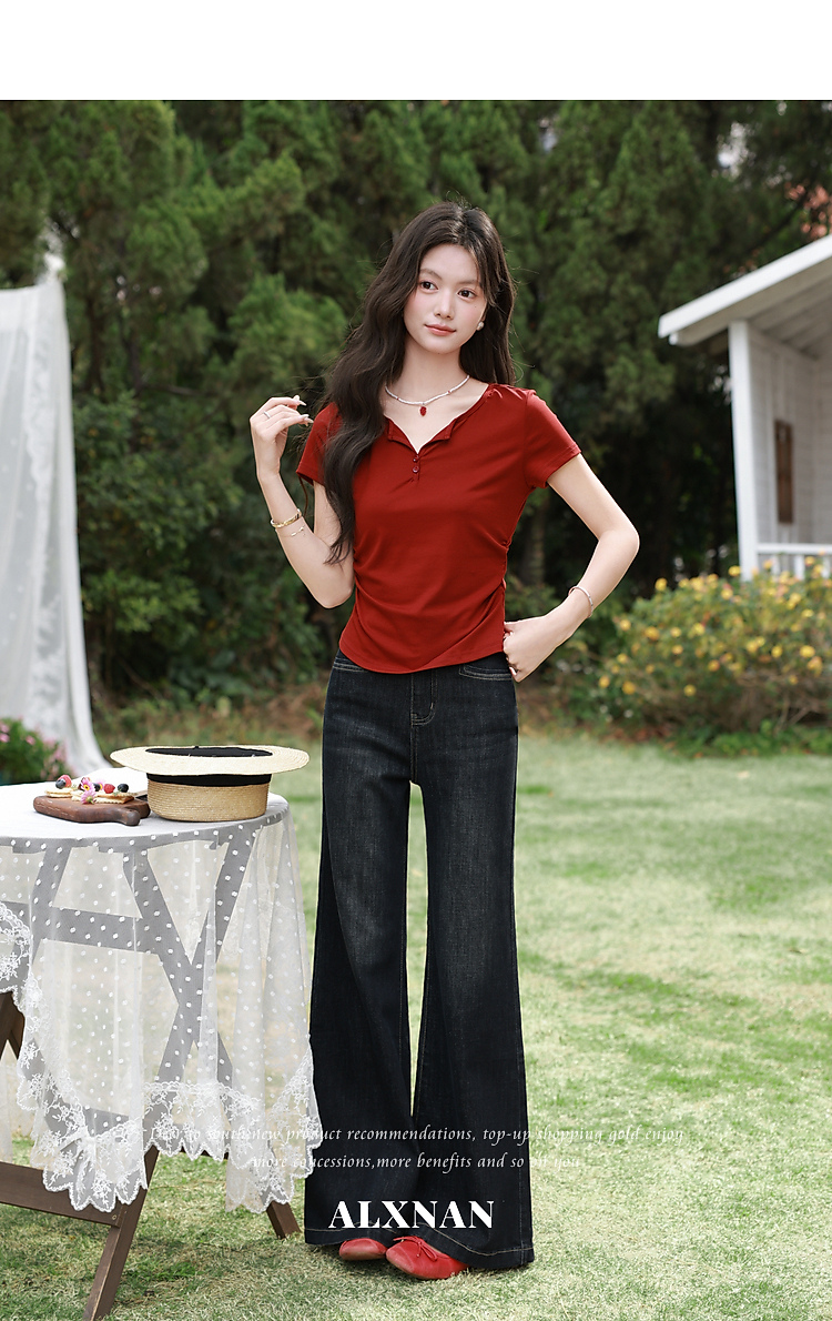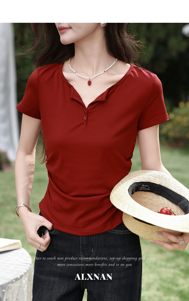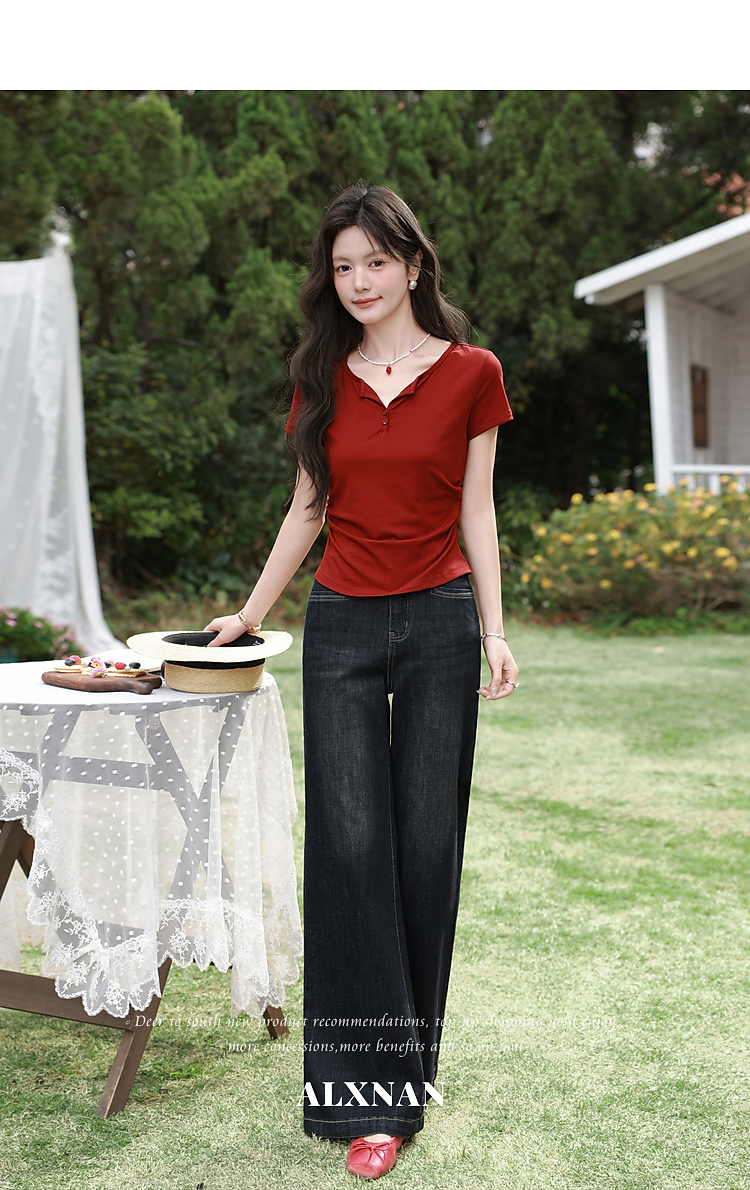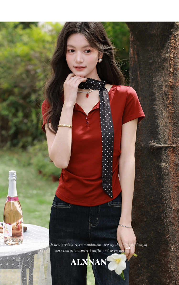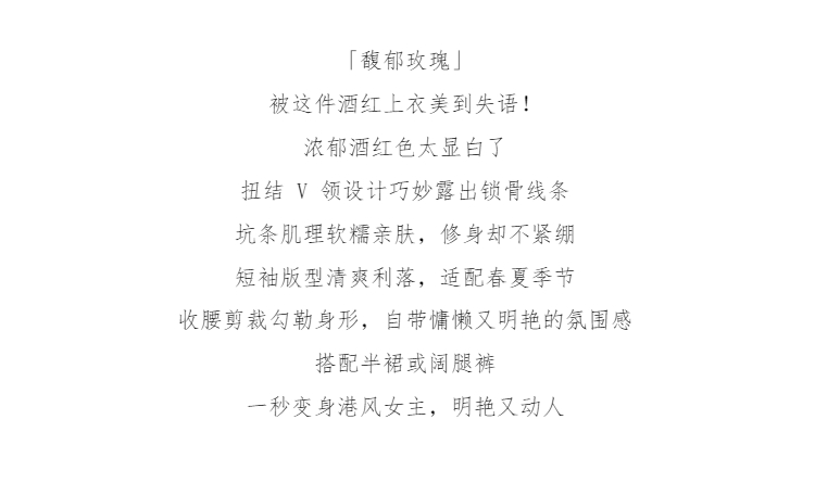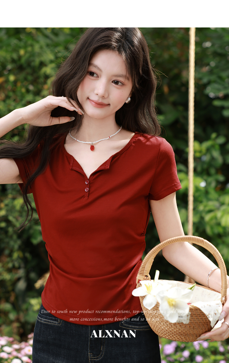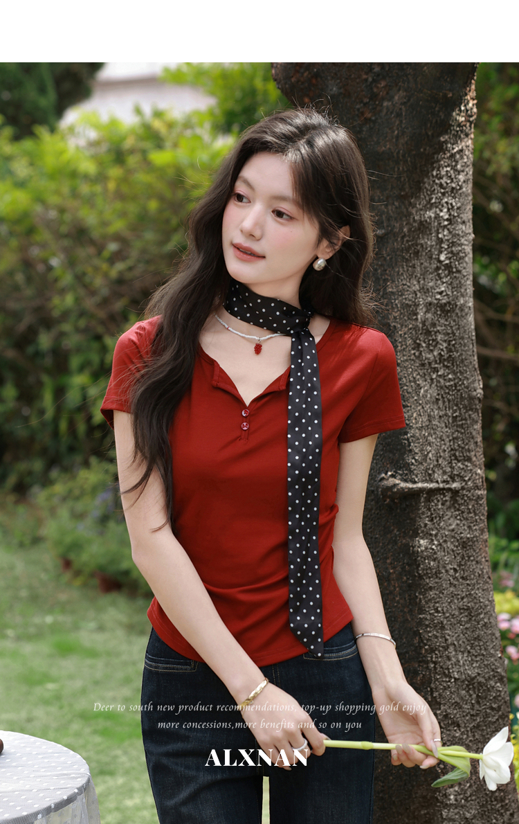 鹿向南「落日玫瑰」复古红色收腰显瘦短袖T恤女夏巨好看小众上衣