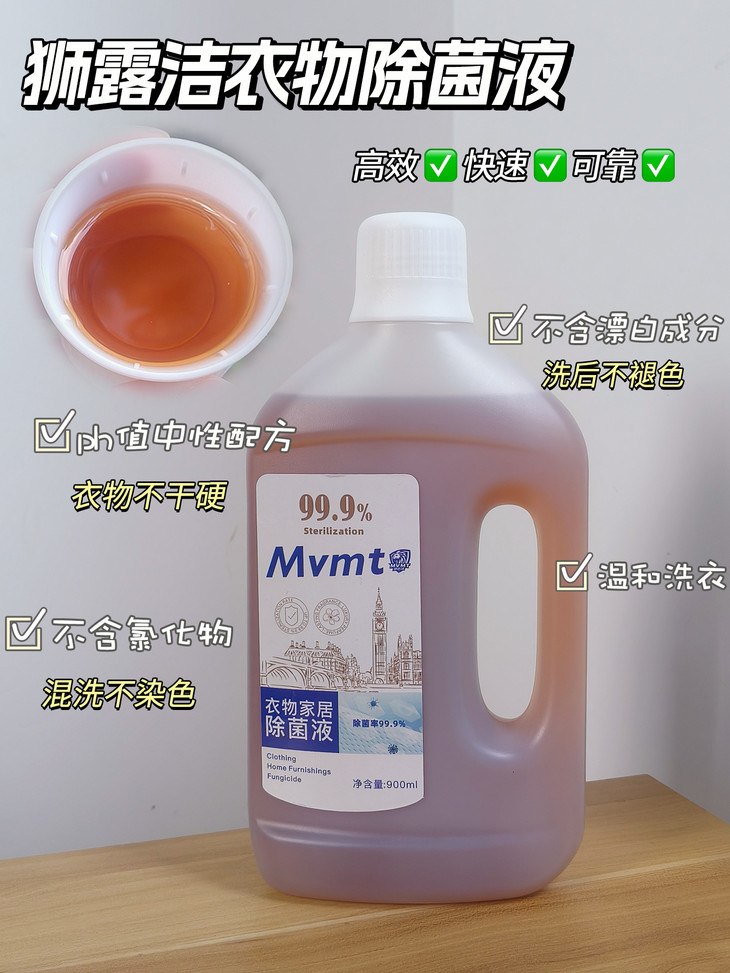 一般普通的洗衣液,只能洗掉衣服表面的污渍 而洗衣机的密闭环境,本身就是病菌的培养基地 所以,在洗衣服的时候,除了用洗衣液以外,一定还要加入专门的消毒液!✅ 狮露洁衣物除菌液👍 成分非常安全⛑ 小孩子的衣物也能放心用 用完洗完的衣物不会褪色,鲜亮依旧!✨